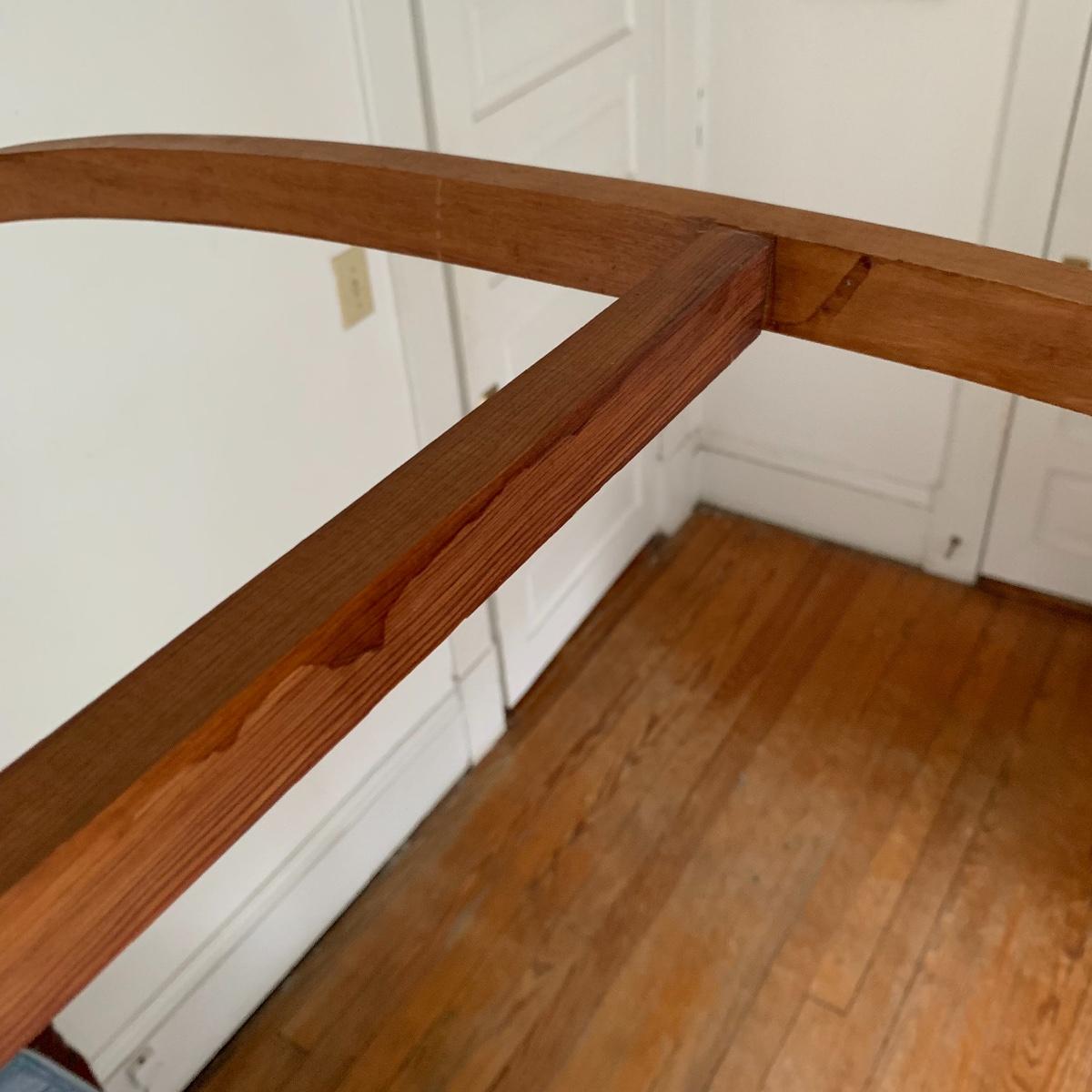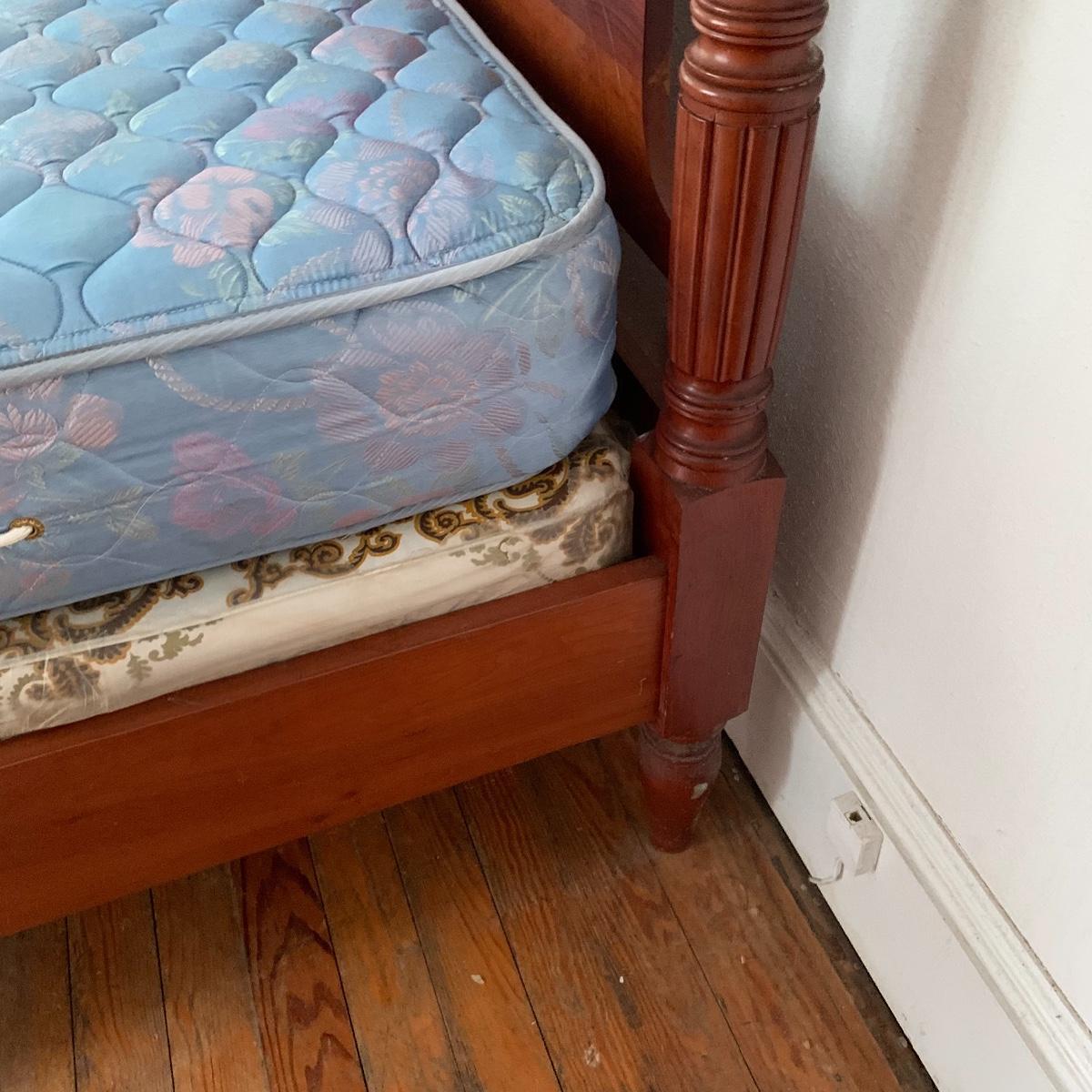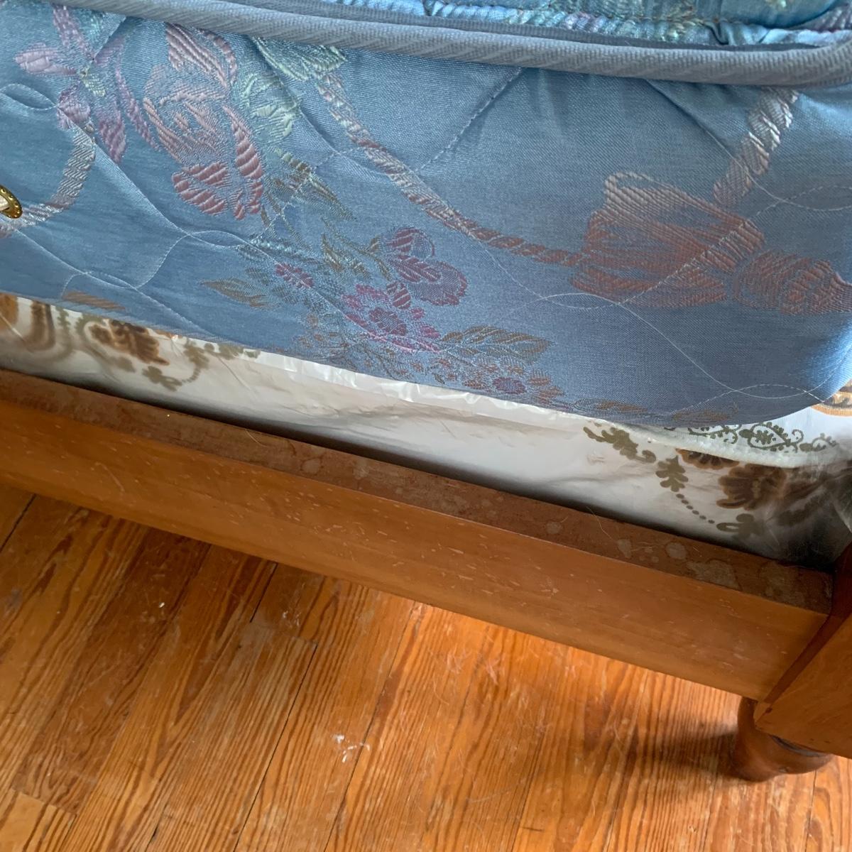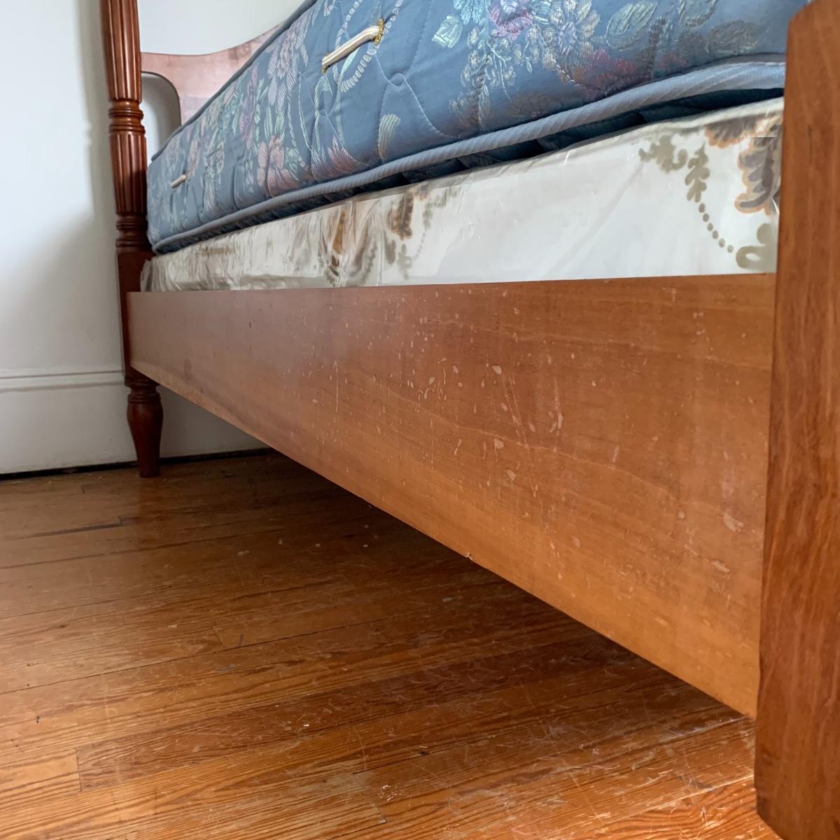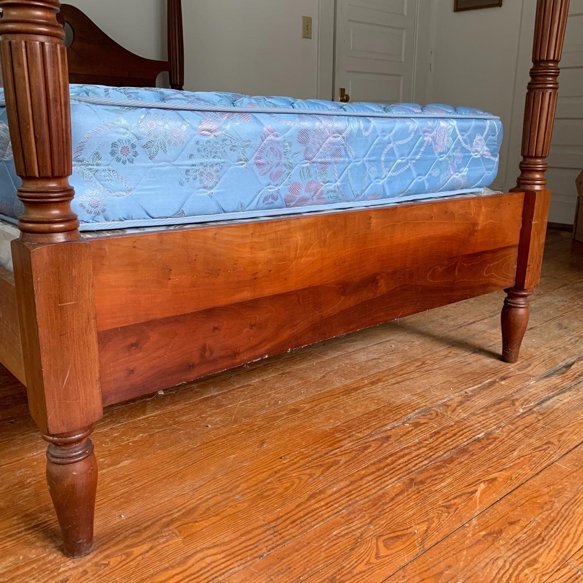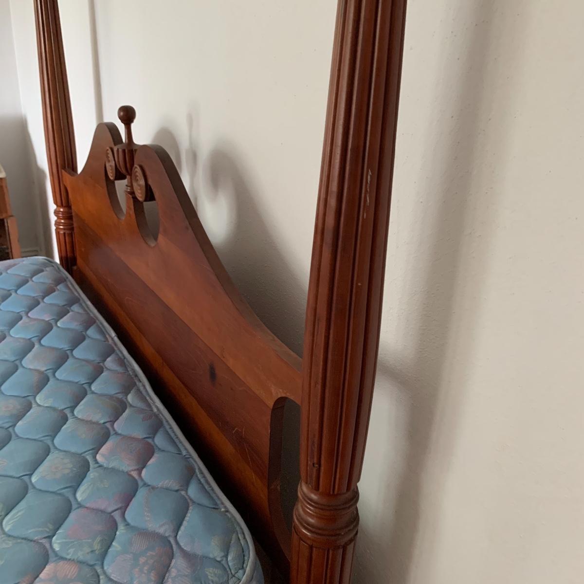 This is an ornate four poster wooden bed frame with an easily removable canopy top. It is a full/double sized frame. It has a pediment style headboard with a finial decoration. The canopy top can be removed simply by lifting it off of the top of the posts. The frame is a bit heavy. The winning bidder will need to move it from the second floor of the house and will require help. The frame measures 57” x 81” x 74”. A flathead screwdriver will be required to disassemble the frame (please see pictures of hardware). The two boards supporting the box spring are not attached. Bedding pictured is not included. The winning bidder may have the mattress and box spring if desired (please let Sterling Transitions know if you’d like these before you come for auction pickup). The height of the top of the current mattress is the frame is about 30” tall. The bed frame is in used, but sturdy condition. It shows it’s age with some wear, but is otherwise in very good condition. Local Pickup Only