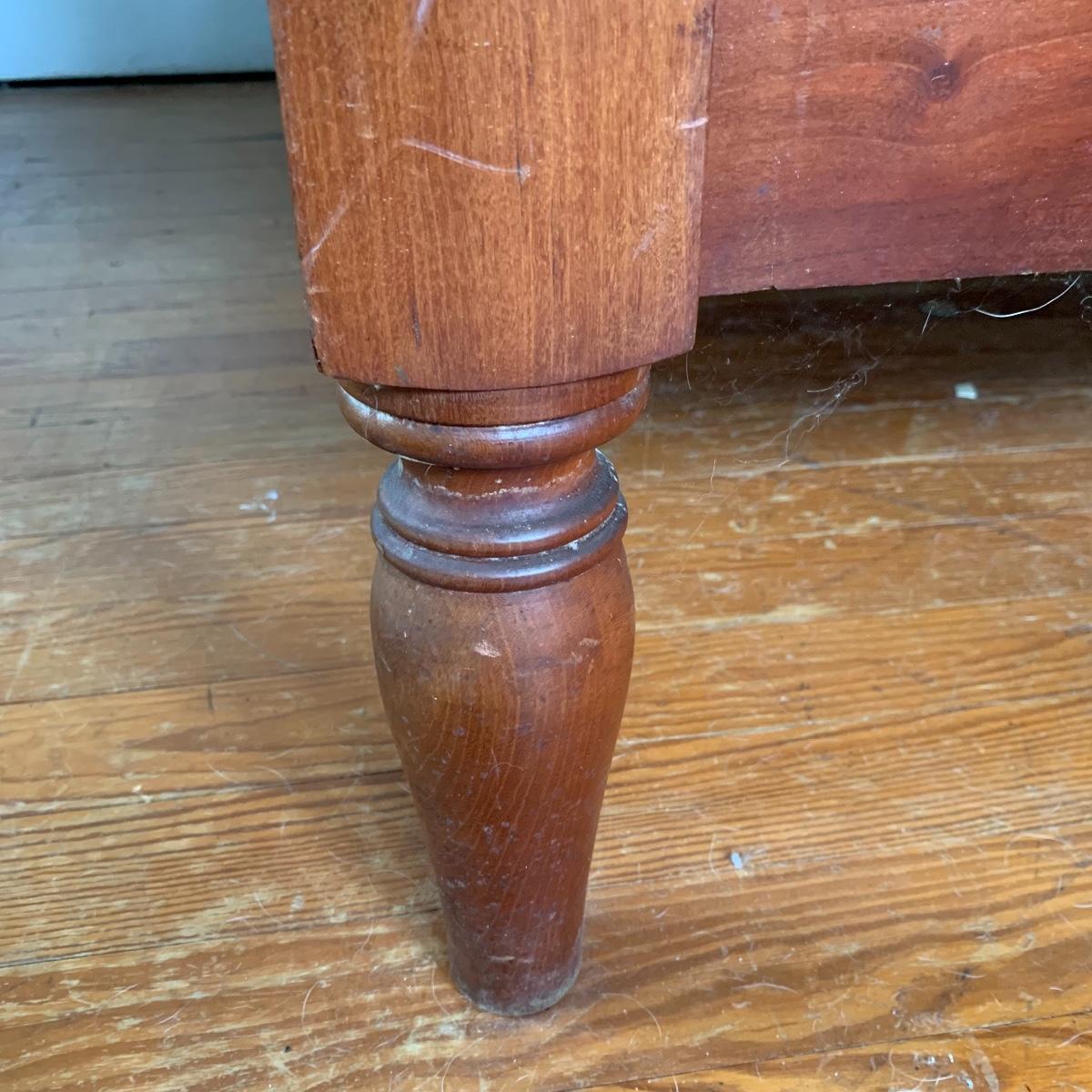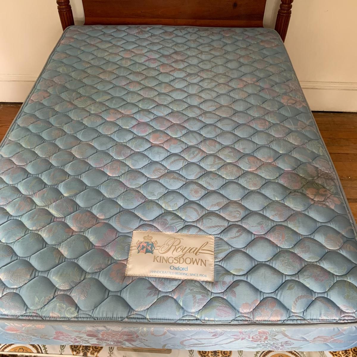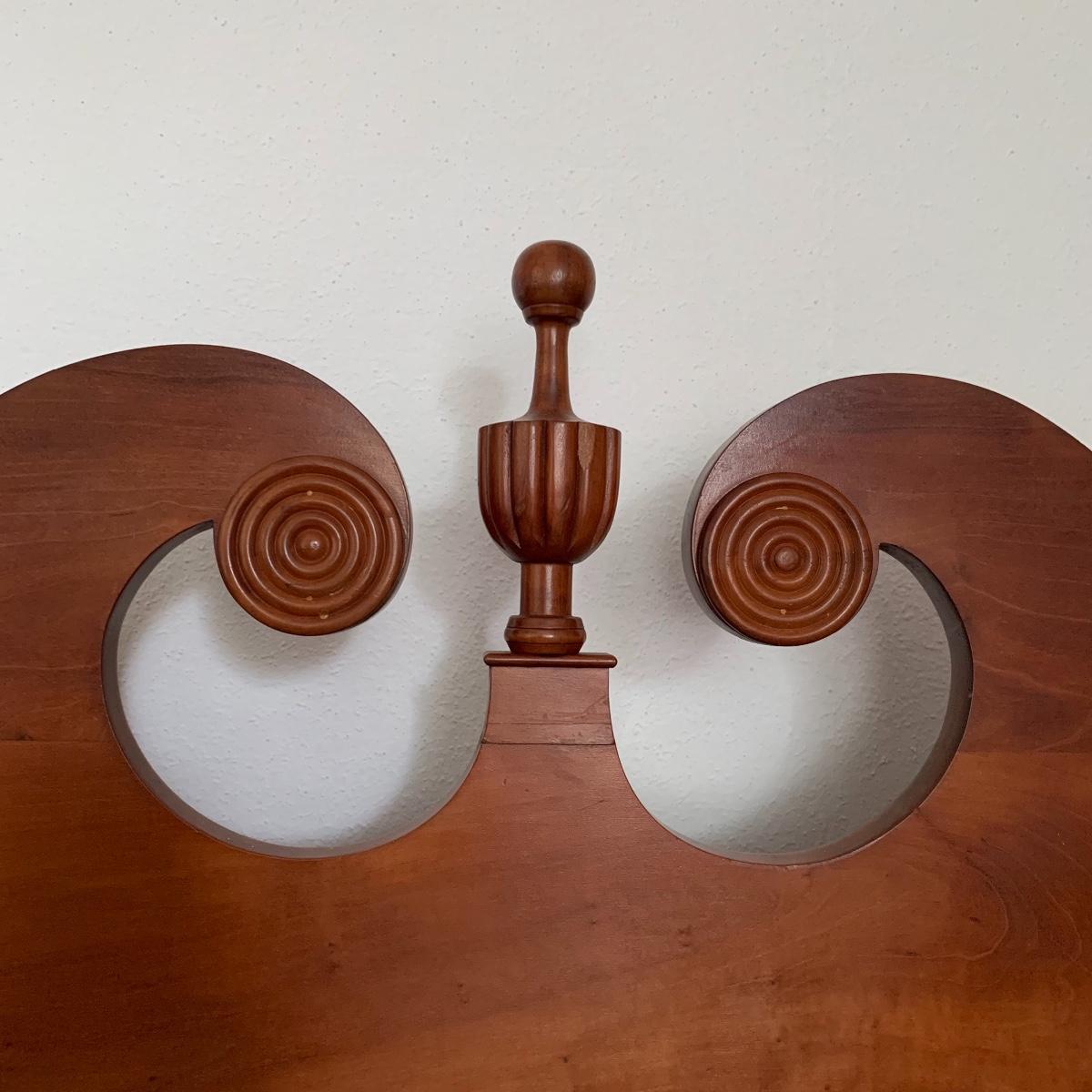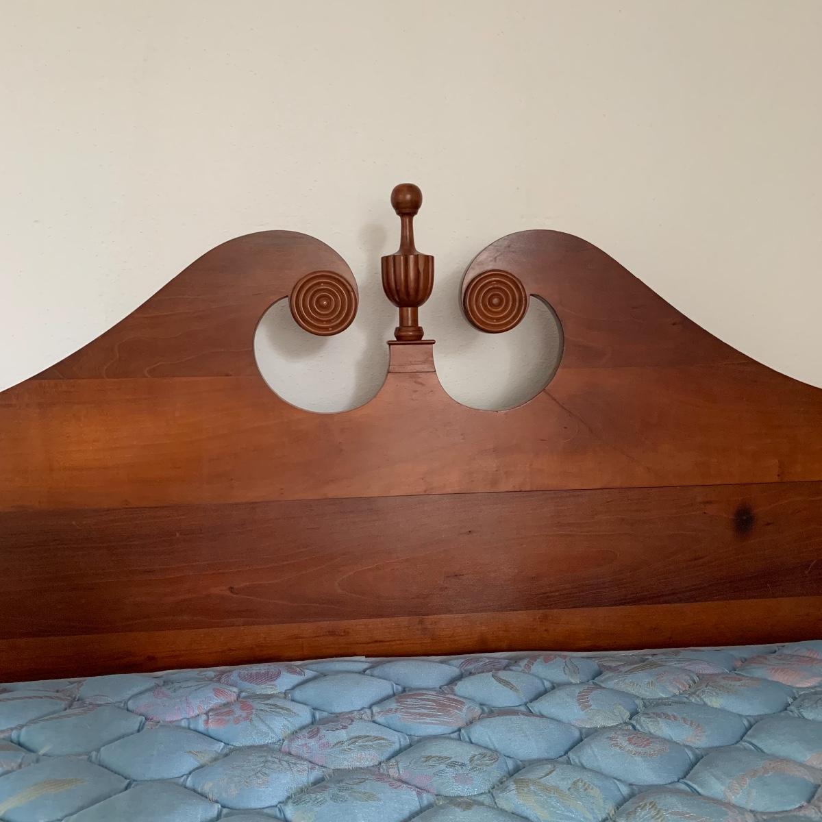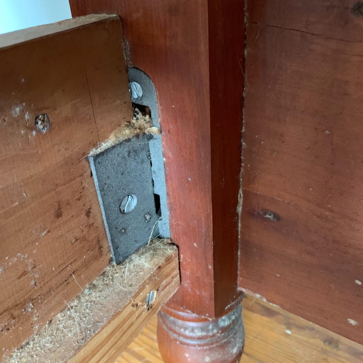 This is an ornate four poster wooden bed frame with an easily removable canopy top. It is a full/double sized frame. It has a pediment style headboard with a finial decoration. The canopy top can be removed simply by lifting it off of the top of the posts. The frame is a bit heavy. The winning bidder will need to move it from the second floor of the house and will require help. The frame measures 57” x 81” x 74”. A flathead screwdriver will be required to disassemble the frame (please see pictures of hardware). The two boards supporting the box spring are not attached. Bedding pictured is not included. The winning bidder may have the mattress and box spring if desired (please let Sterling Transitions know if you’d like these before you come for auction pickup). The height of the top of the current mattress is the frame is about 30” tall. The bed frame is in used, but sturdy condition. It shows it’s age with some wear, but is otherwise in very good condition. Local Pickup Only