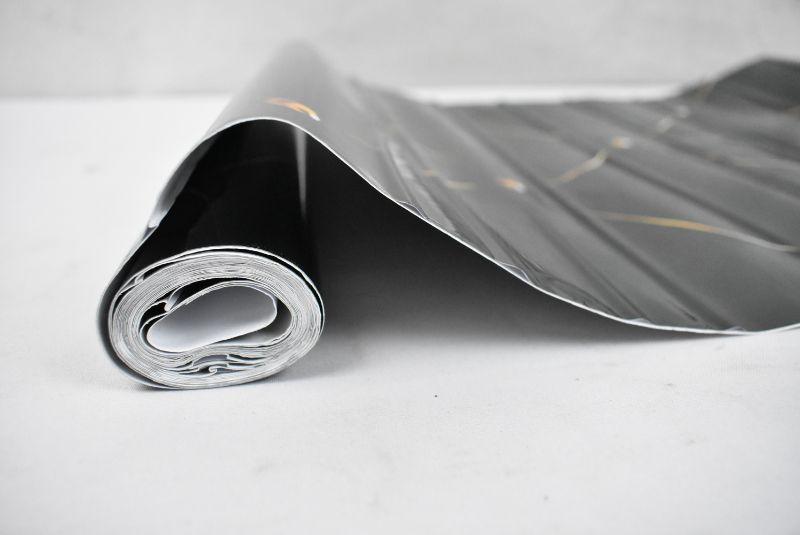 Peel & Stick Roll 40x300 cm (approx 15.75" x 118.11" or 9.84 feet). Black with Gold Tufted Design. Creased.