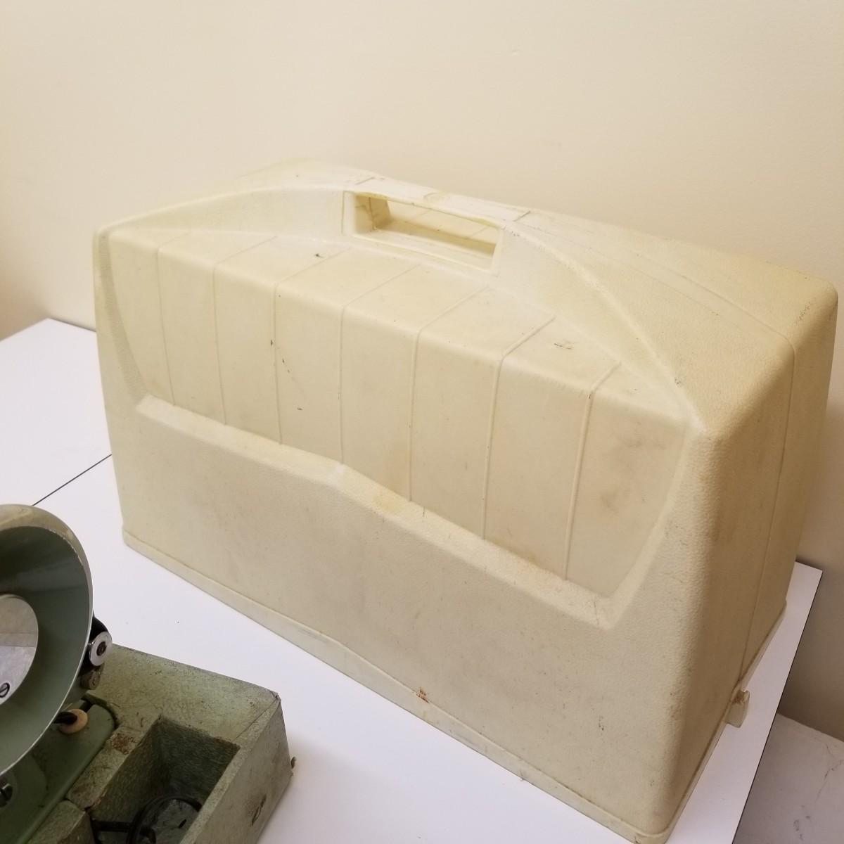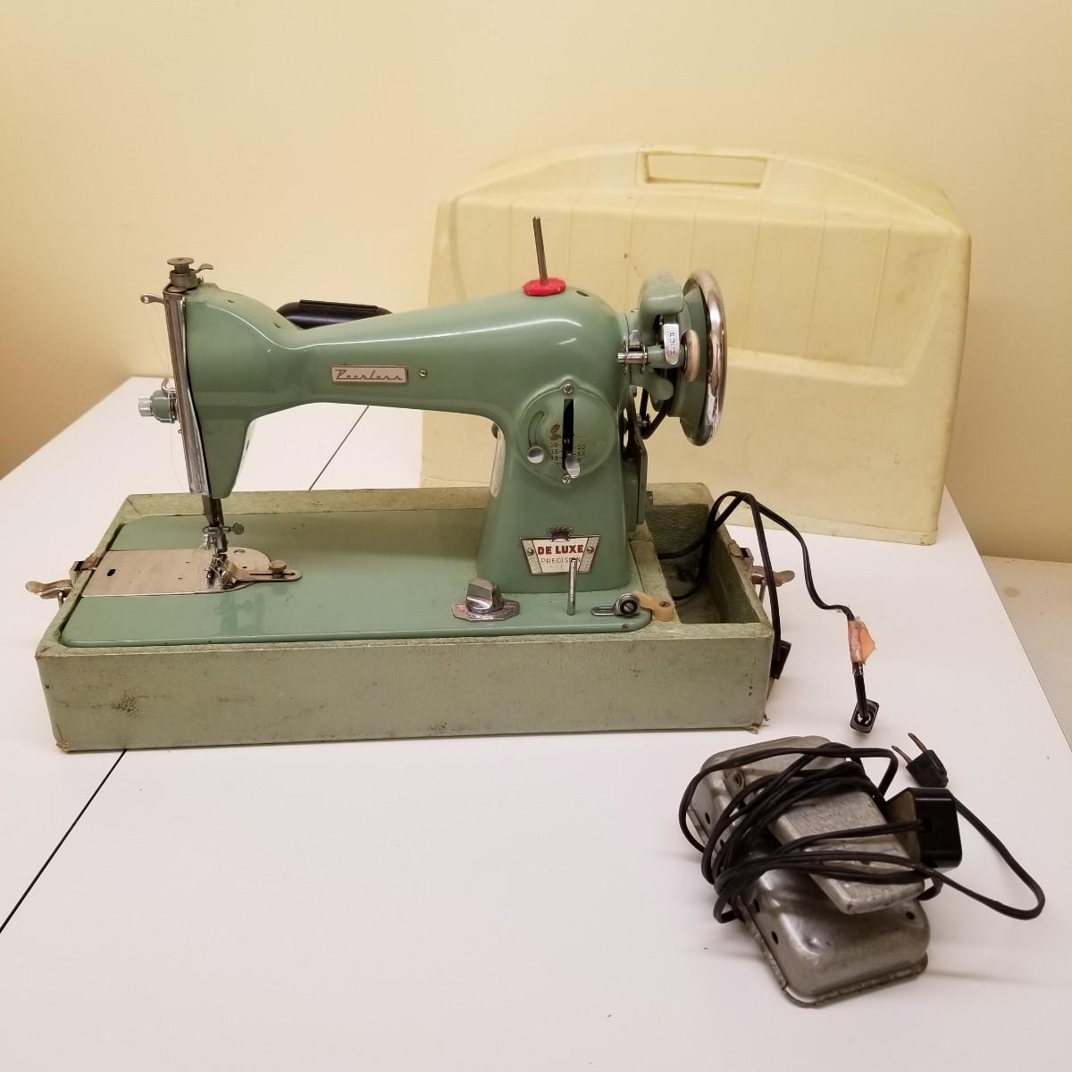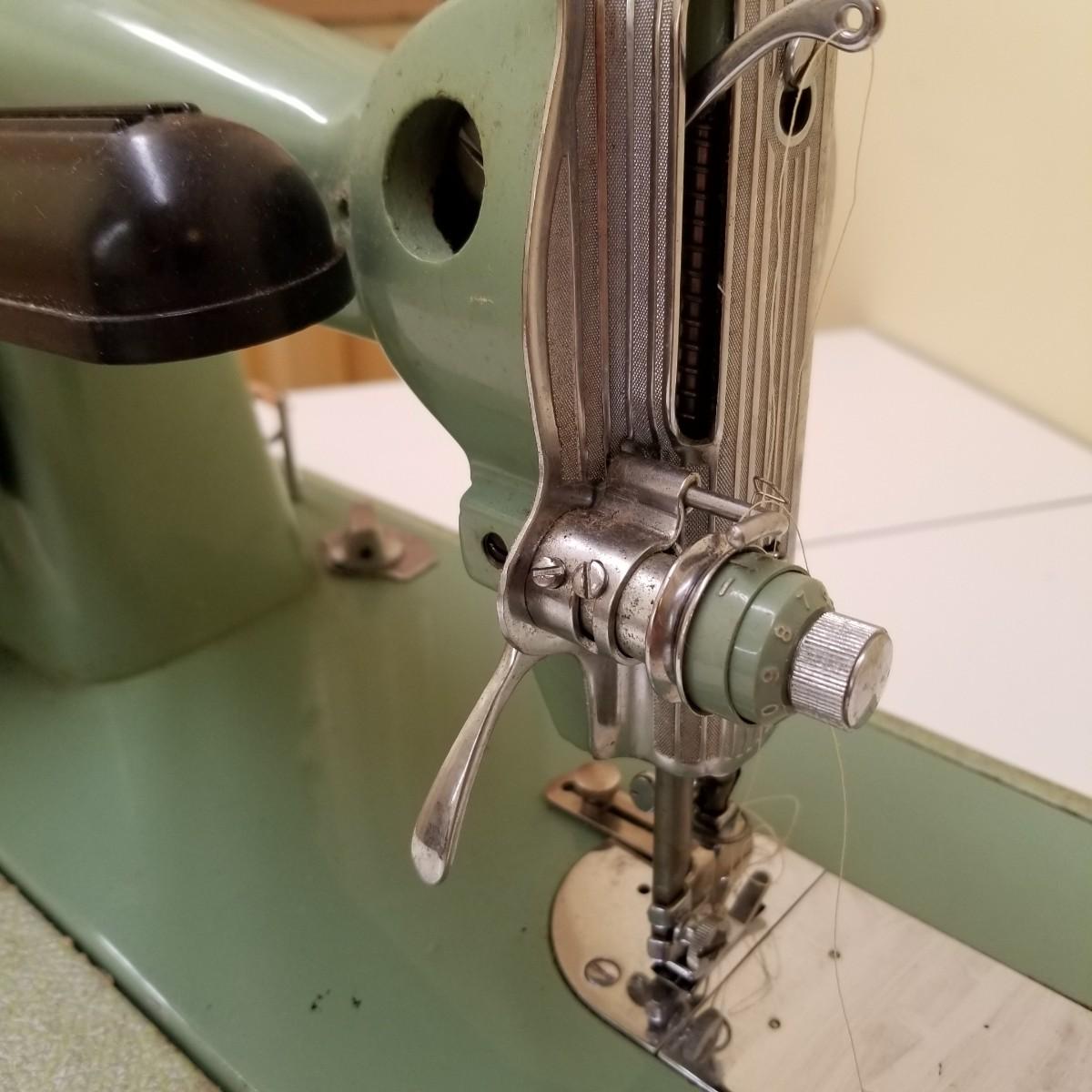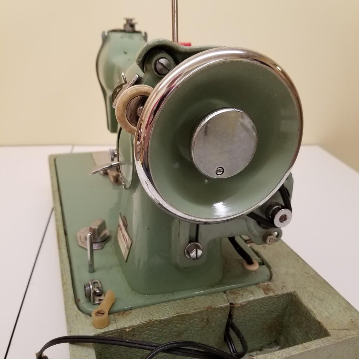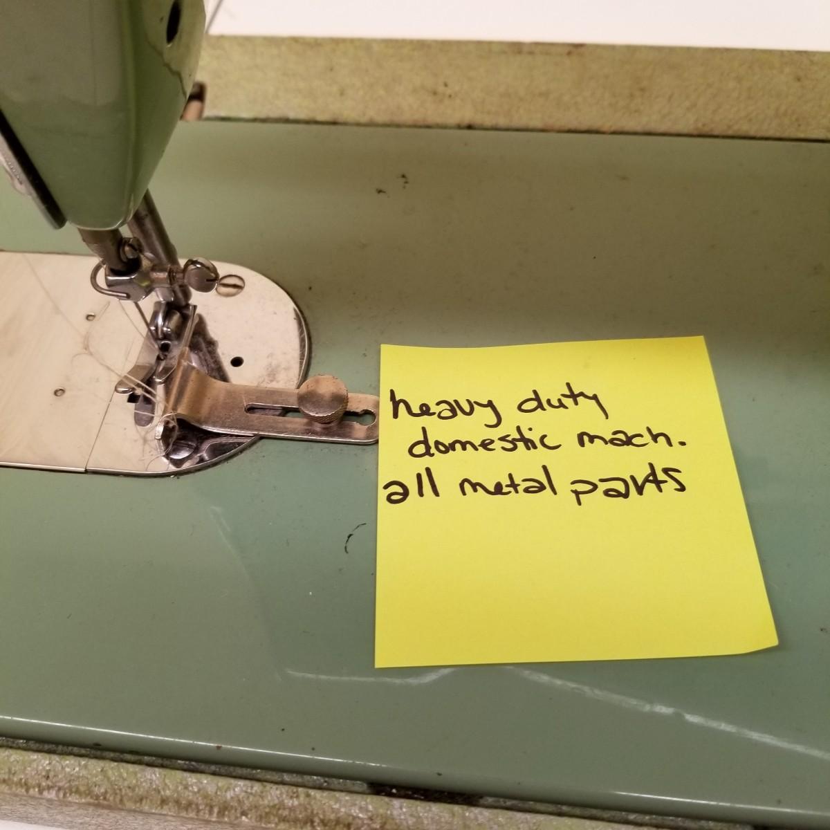 A solid heavy duty machine in a tabletop stand with cover case. This machine runs smoothly and has basic adjustable settings. Foot controller included. See photos for details. From the 50's. Shipping available.