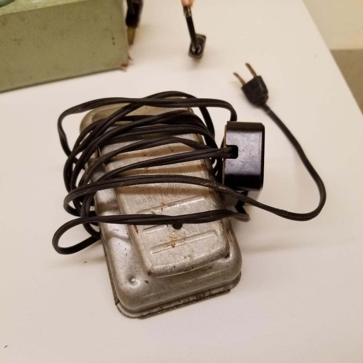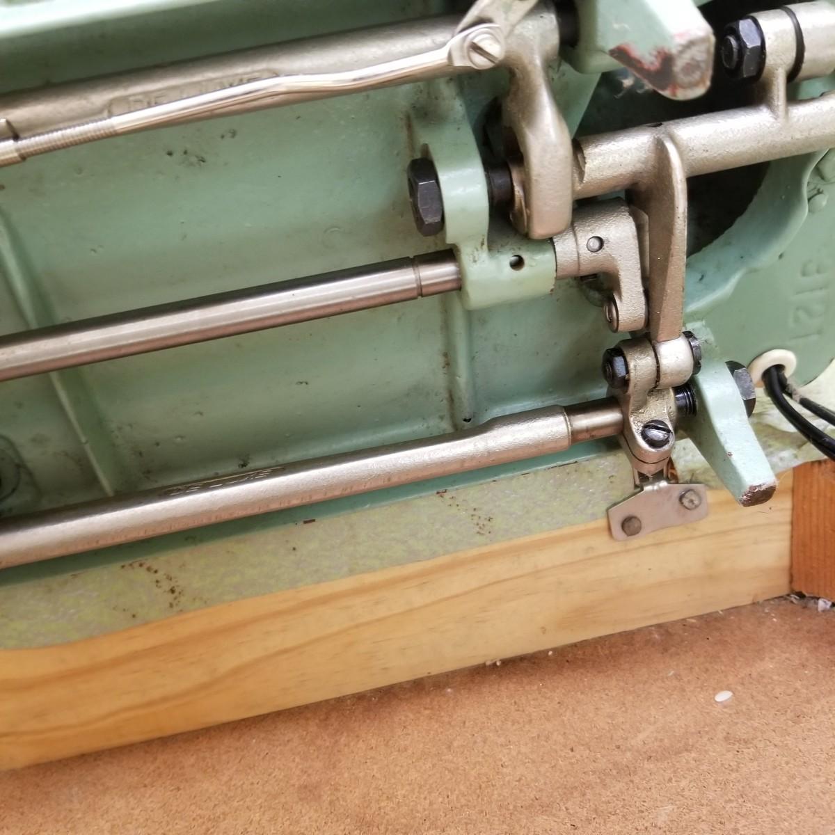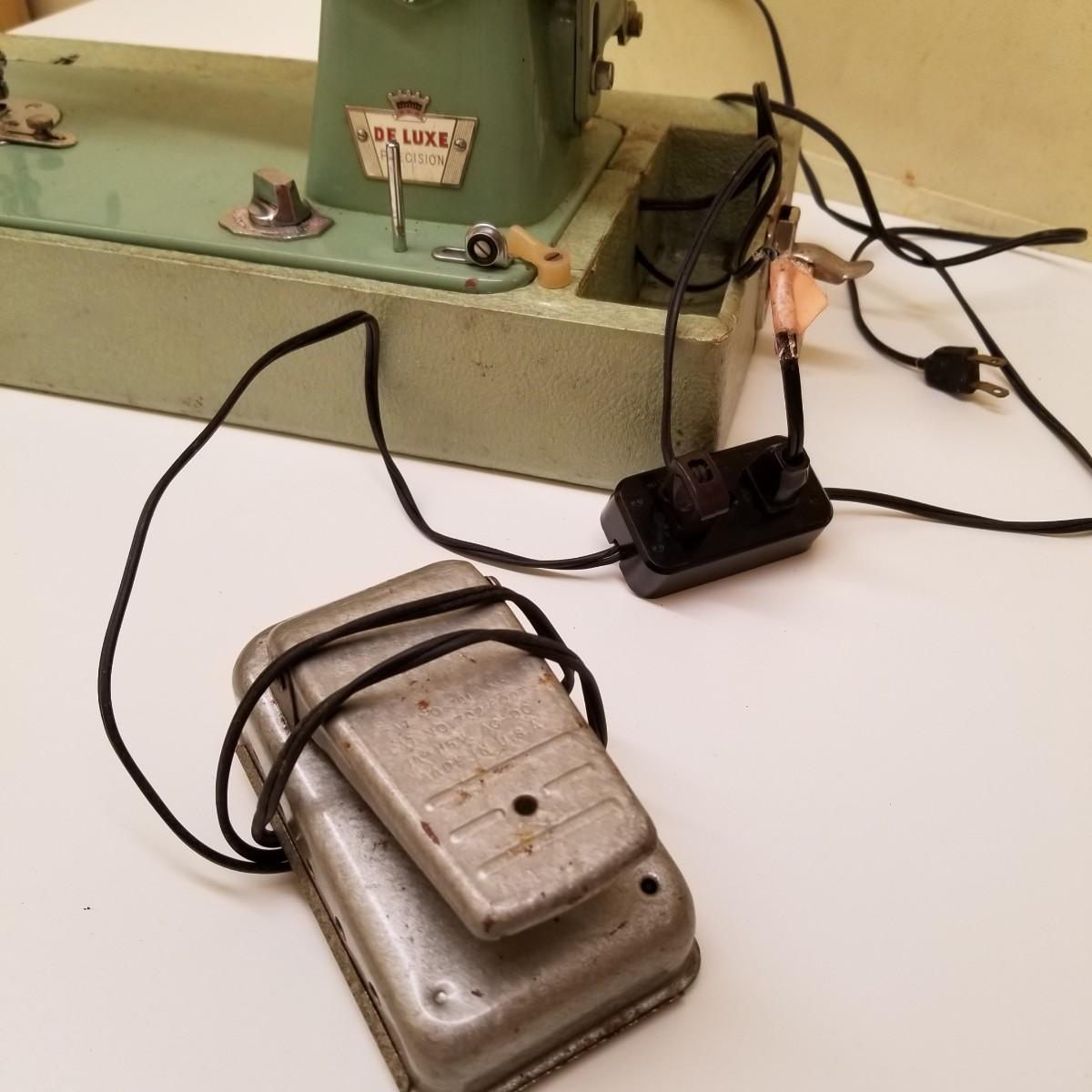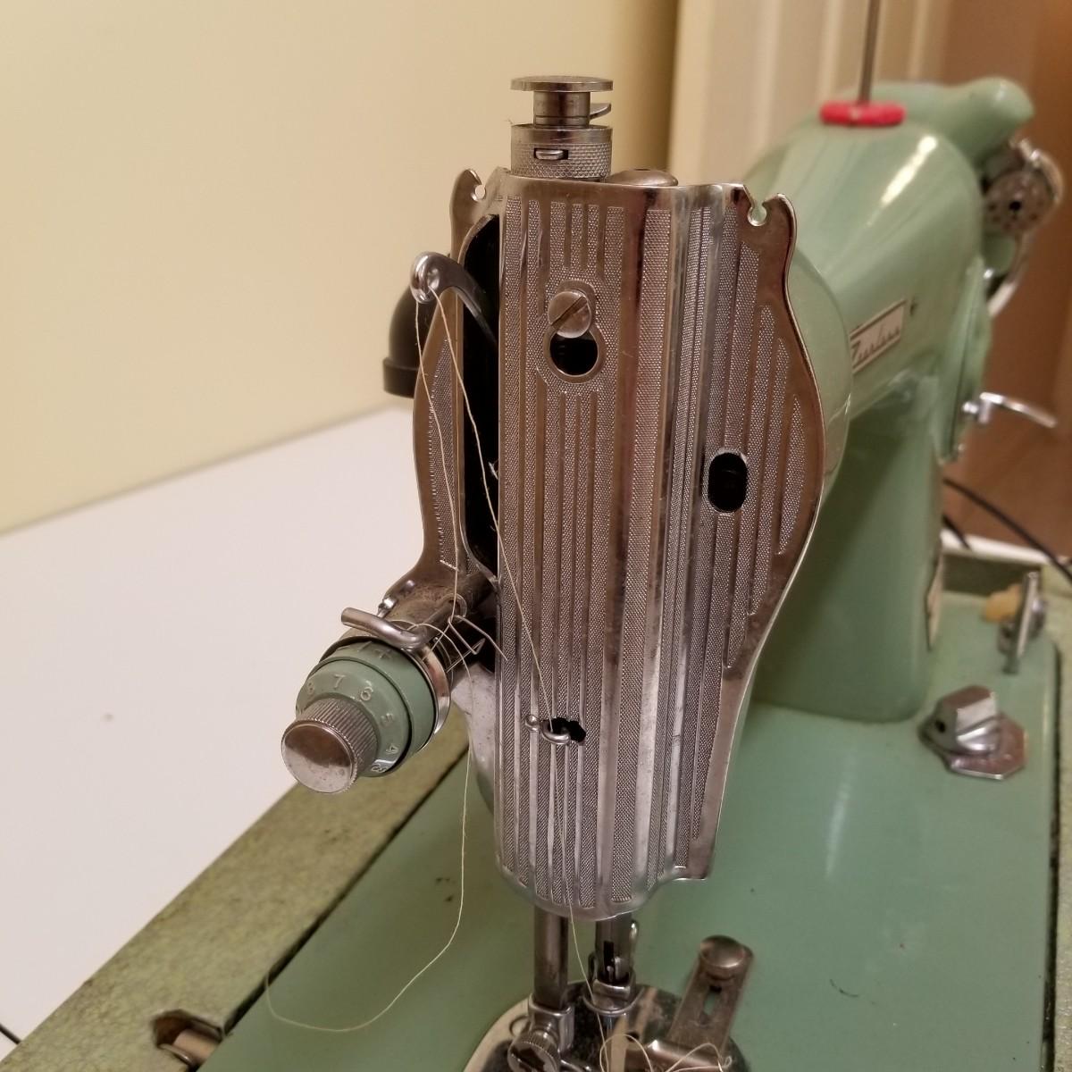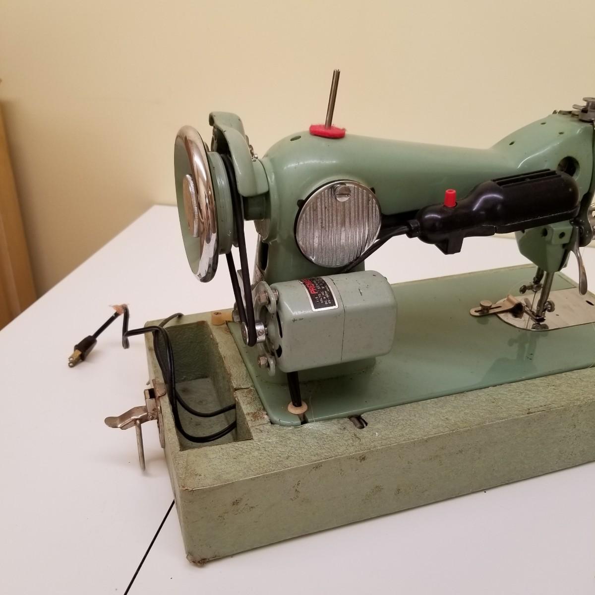 A solid heavy duty machine in a tabletop stand with cover case. This machine runs smoothly and has basic adjustable settings. Foot controller included. See photos for details. From the 50's. Shipping available.