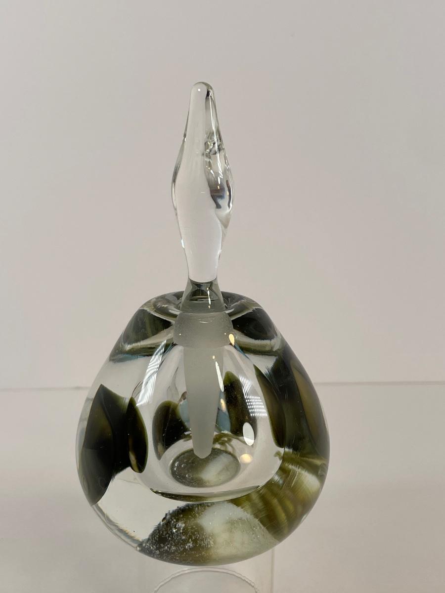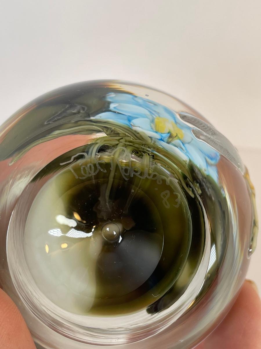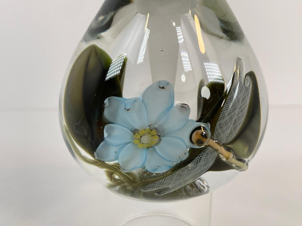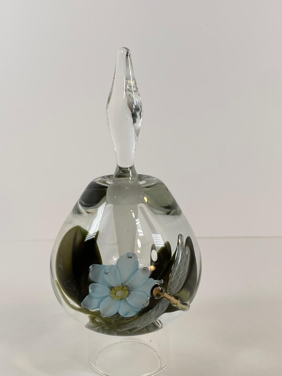 1983 Peet Robison clear perfume bottle with waterlily and dragonfly. "Peet Robison 83" on bottom.