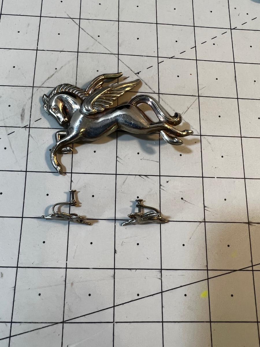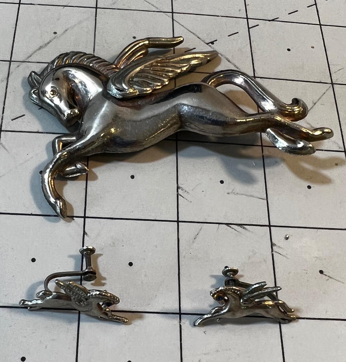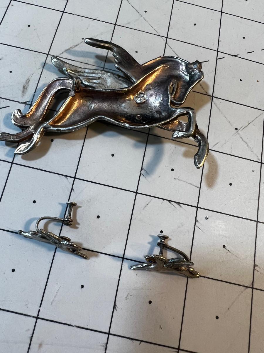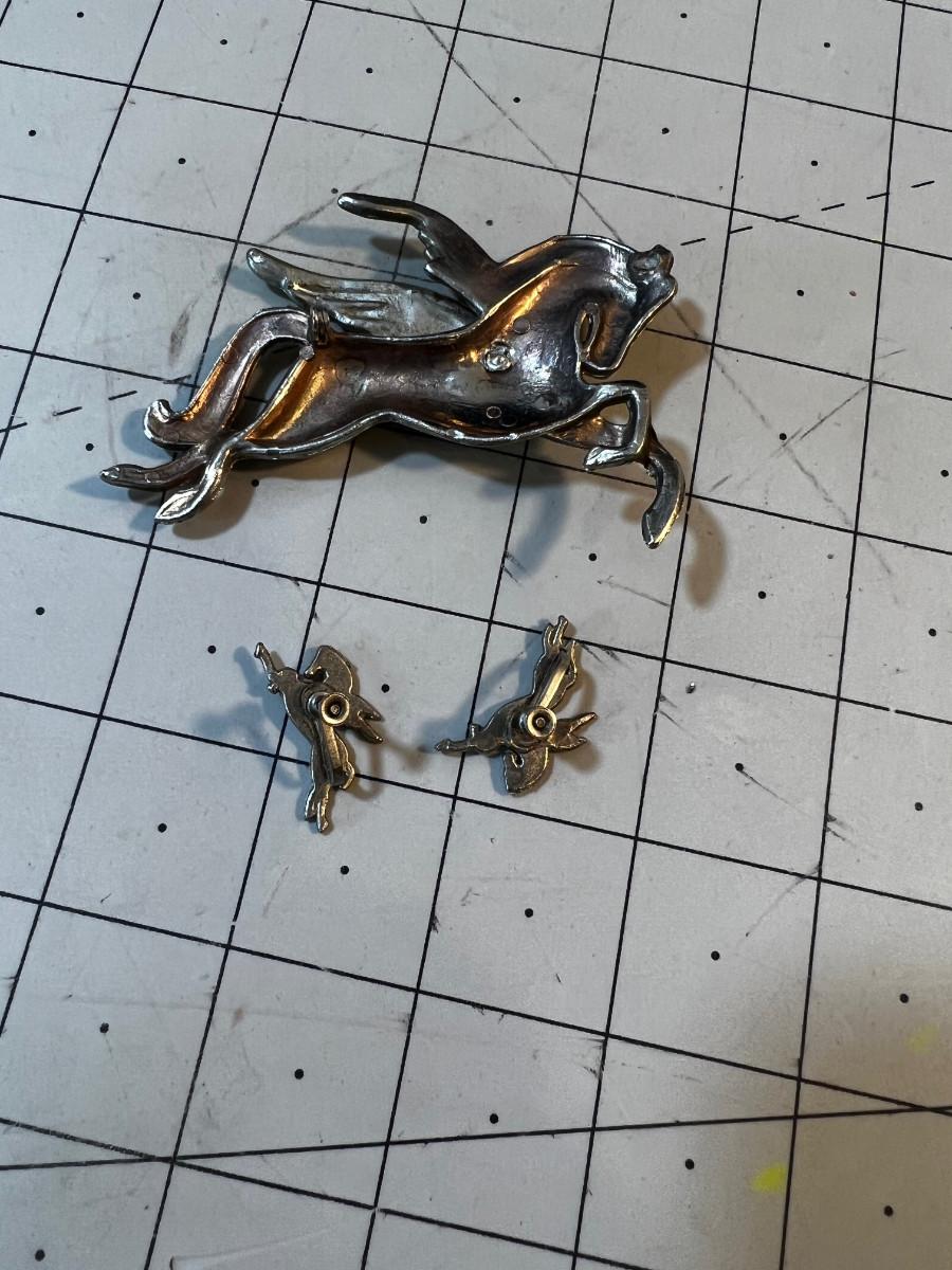 Silver Metal not marked. The Pin Needs repair or up-cycled.