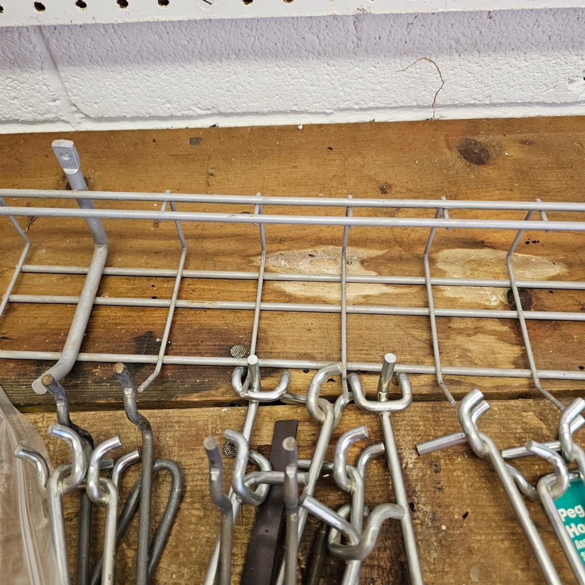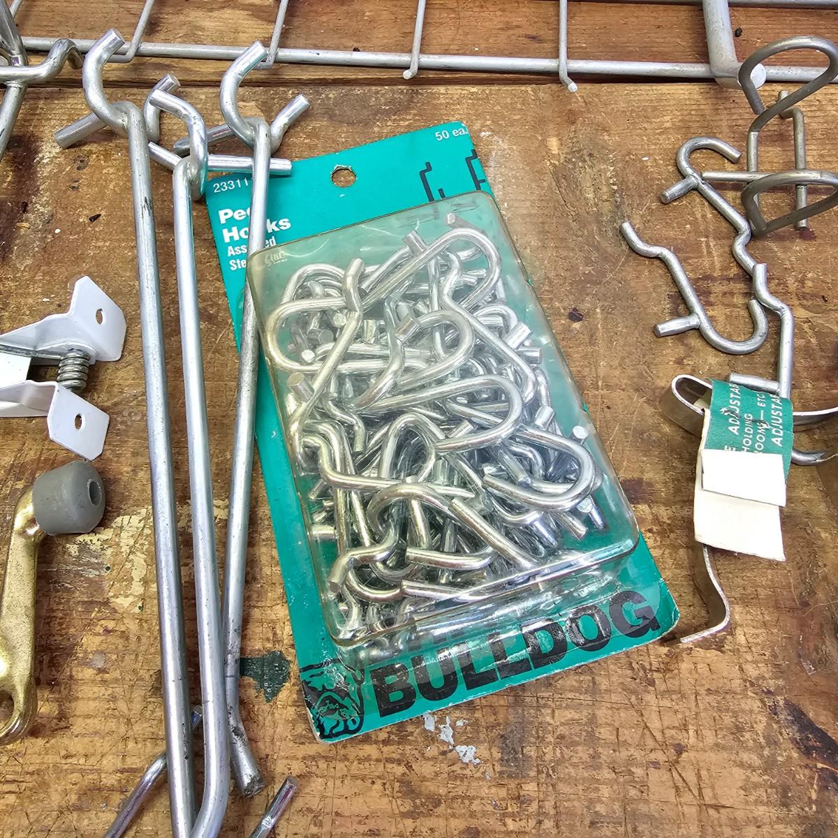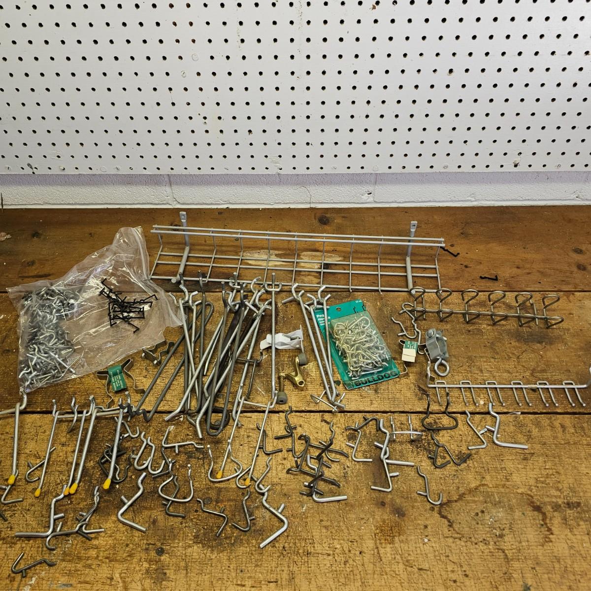 Over seventy-five pieces peg board hooks, racks and holders. Short, long, curves, tool racks, etc. Some hook keepers also. Pegboard is not included. See photos for details. Shipping available.