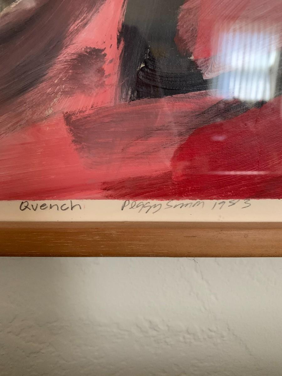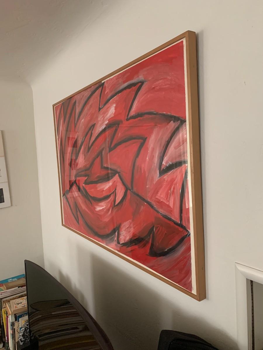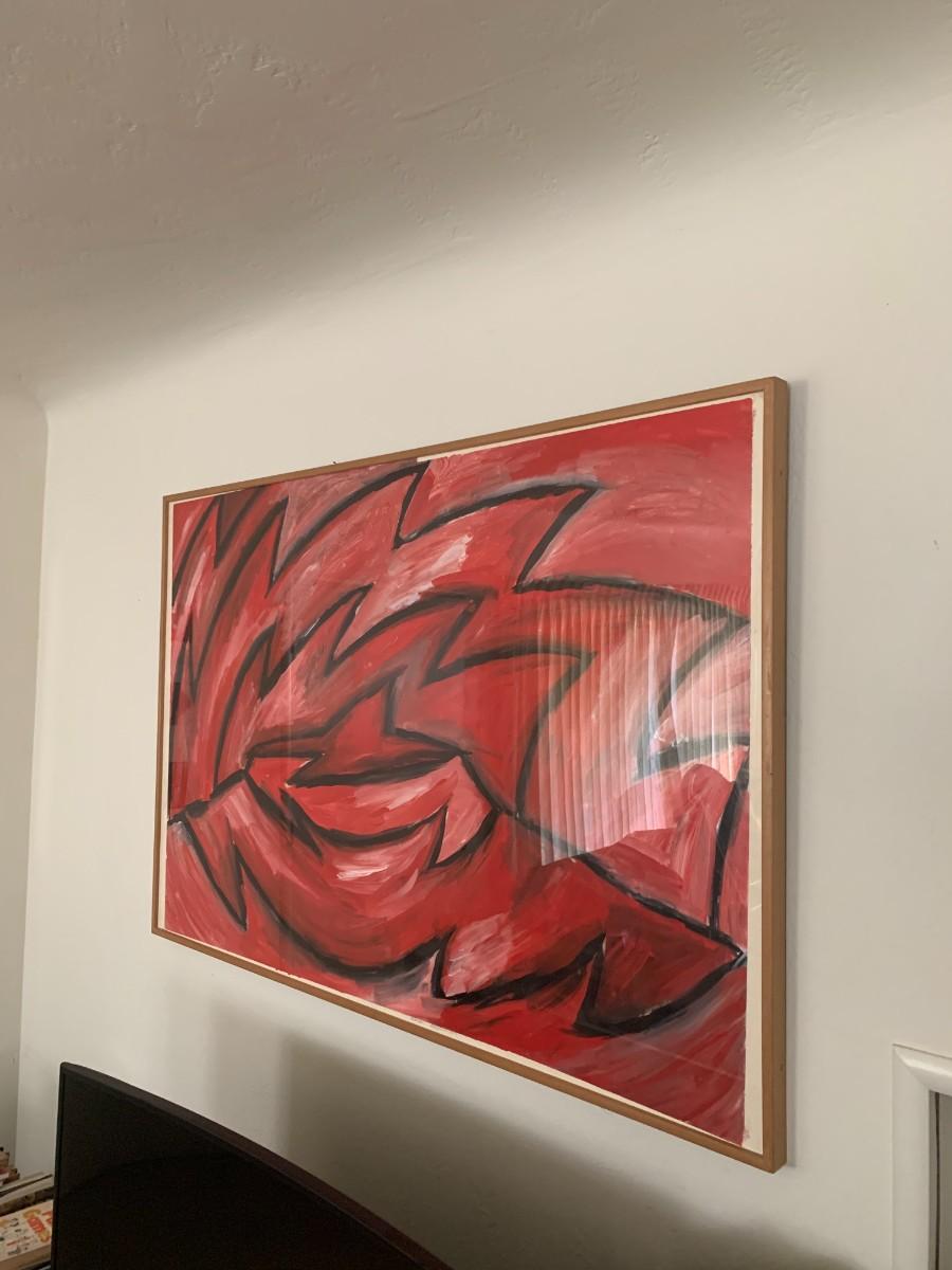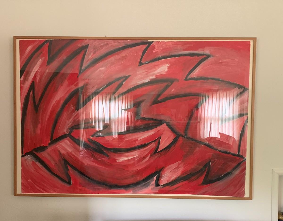 31x41" framed size. Acrylic on paper. Title: Quench. Red and black abstract design