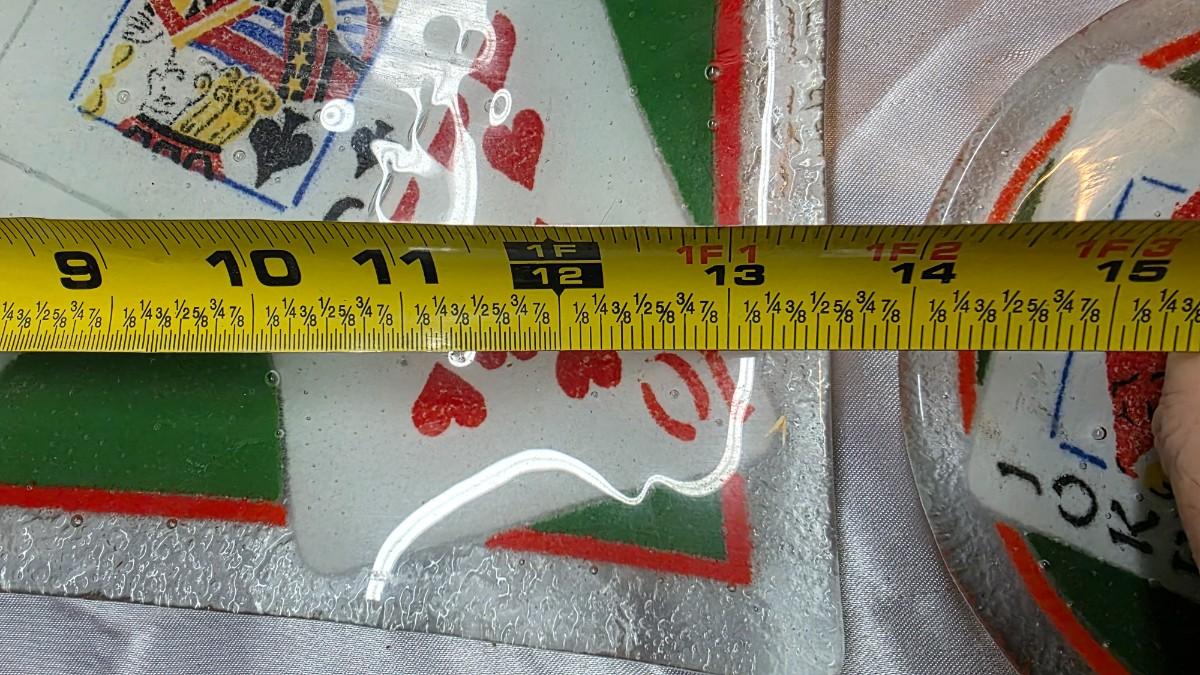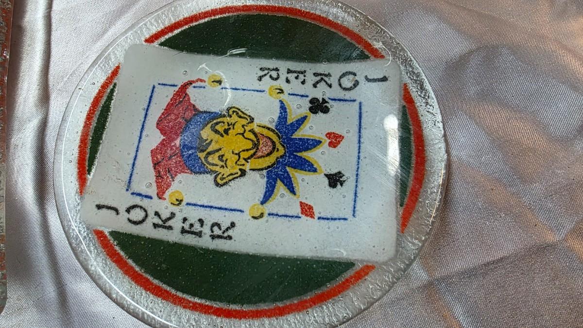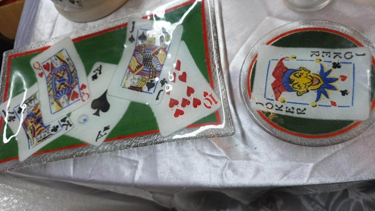 Peggy Karr Fused Art Glass Playing Cards Serving Tray & Joker Coaster Set – Handmade Vintage Card Design Glassware