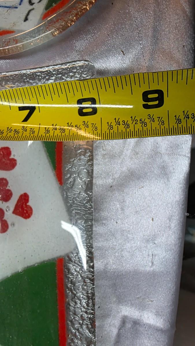 This retired design line was introduced in the early 2000s and produced until the studio’s closure, making these pieces increasingly collectible. The glass construction sandwiches the artwork between layers of fused glass, creating a smooth, durable surface with natural air bubbles and subtle texture inherent to the handmade process. The rectangular tray is ideal for snacks, hors d’oeuvres, or display, while the round piece serves beautifully as a coaster, spoon rest, or accent dish.
