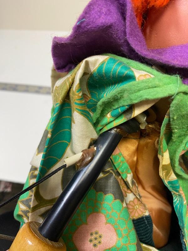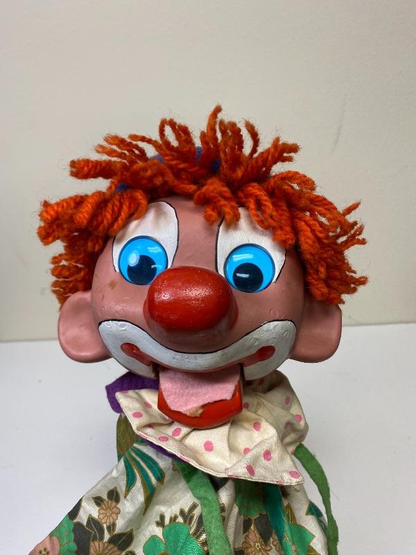 Pehlam Puppets googly eyed clown ventriloquist hand puppet. This classic circus clown puppet is a stick puppet. Stick is connected to his head for turning and moving, on the handle is a thumb lever that is connected to his mouth, letting operator open and close his mouth. In great vintage condition.