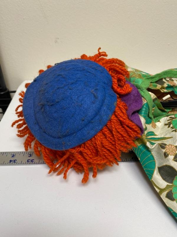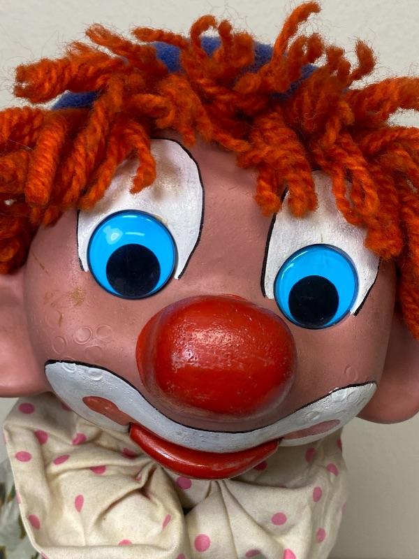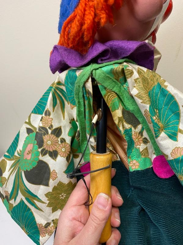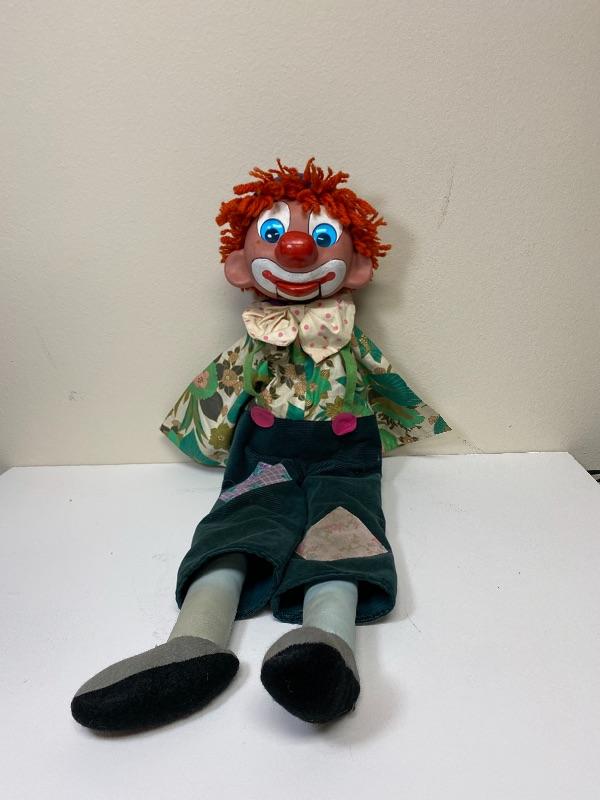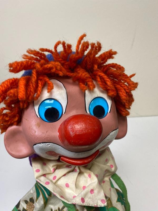 Pehlam Puppets googly eyed clown ventriloquist hand puppet. This classic circus clown puppet is a stick puppet. Stick is connected to his head for turning and moving, on the handle is a thumb lever that is connected to his mouth, letting operator open and close his mouth. In great vintage condition.
