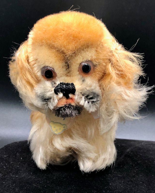Tiny 3" tall "Peck" Pekinese Steiff, paper tag says "Peky" # 1310-0 button and tag in ear