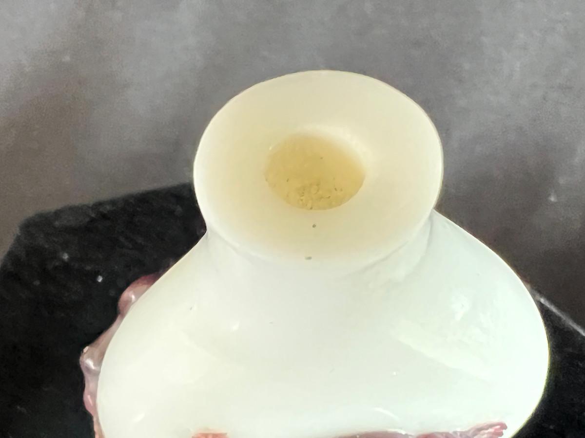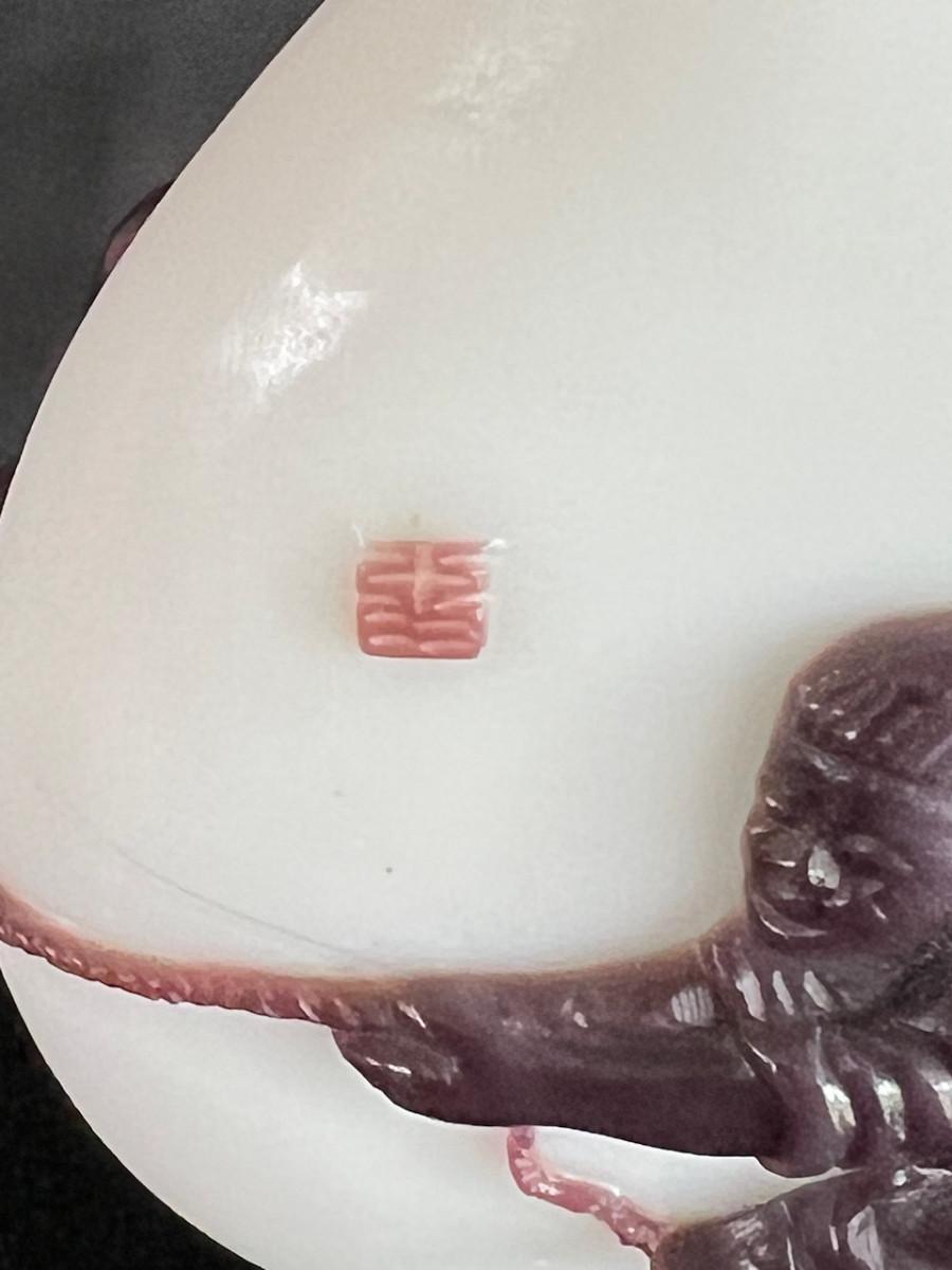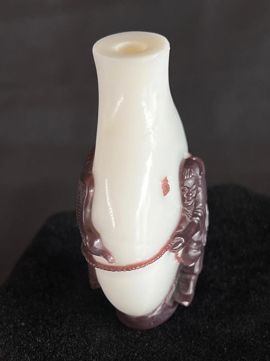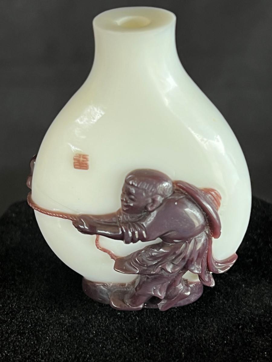 Peking Glass Snuff Bottle with Figure Pulling a Bull - scene is continuous around the bottle. Signature found on figure side