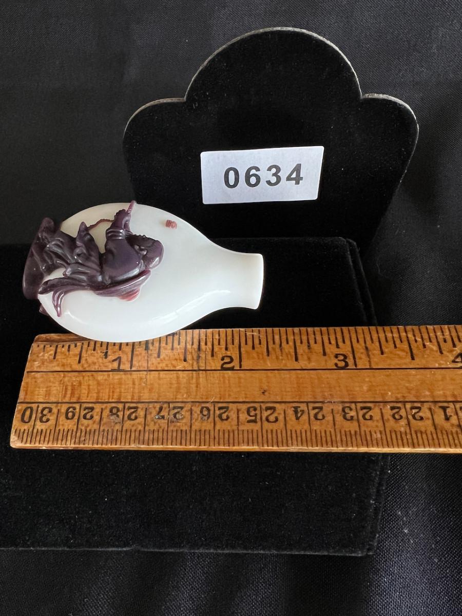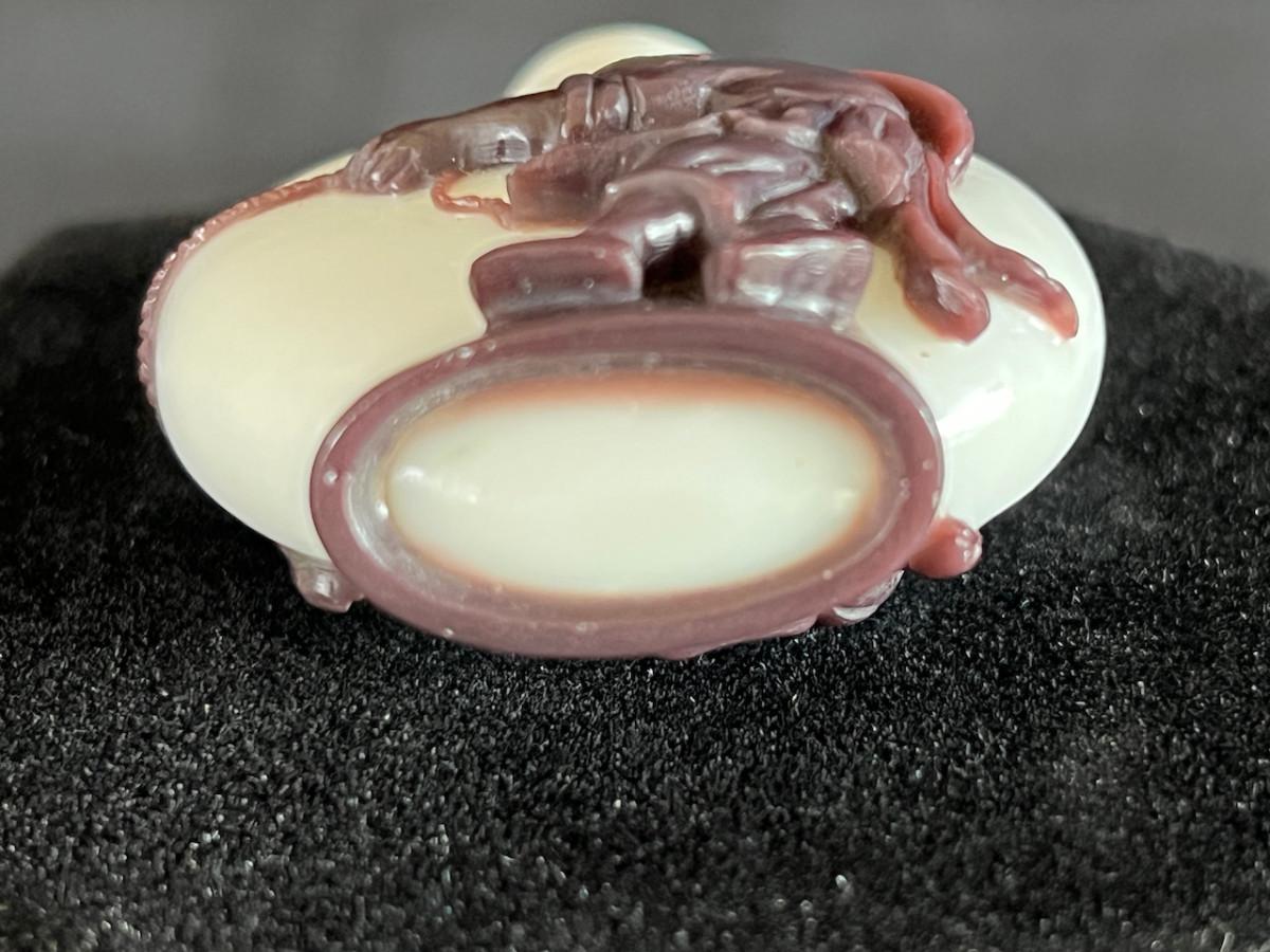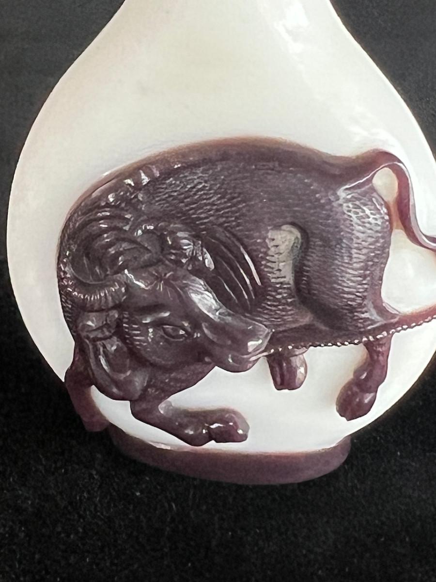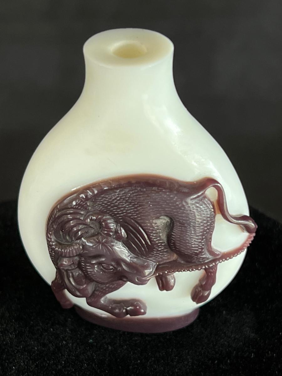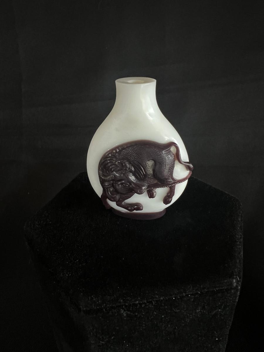 Peking Glass Snuff Bottle with Figure Pulling a Bull. Signed