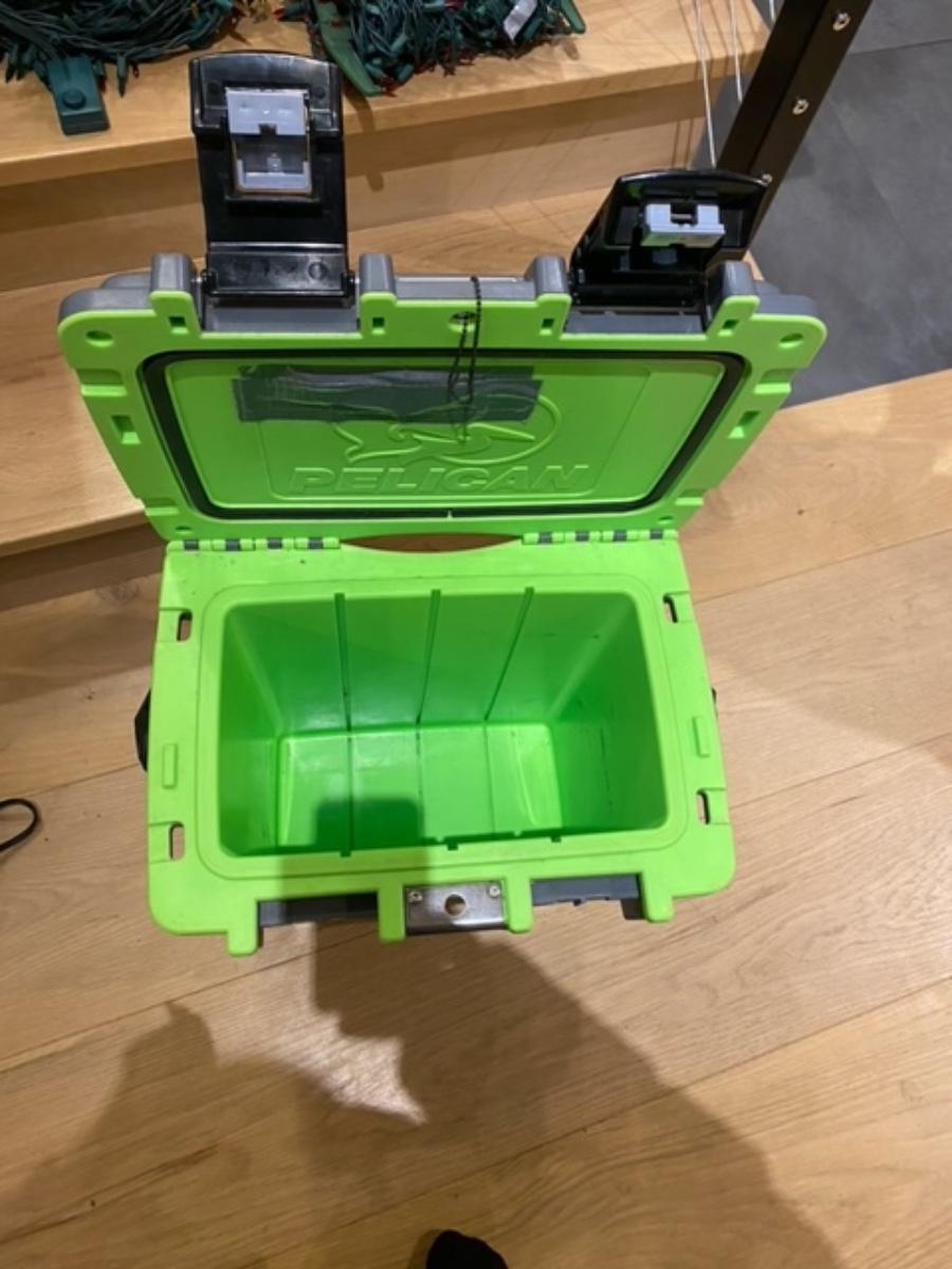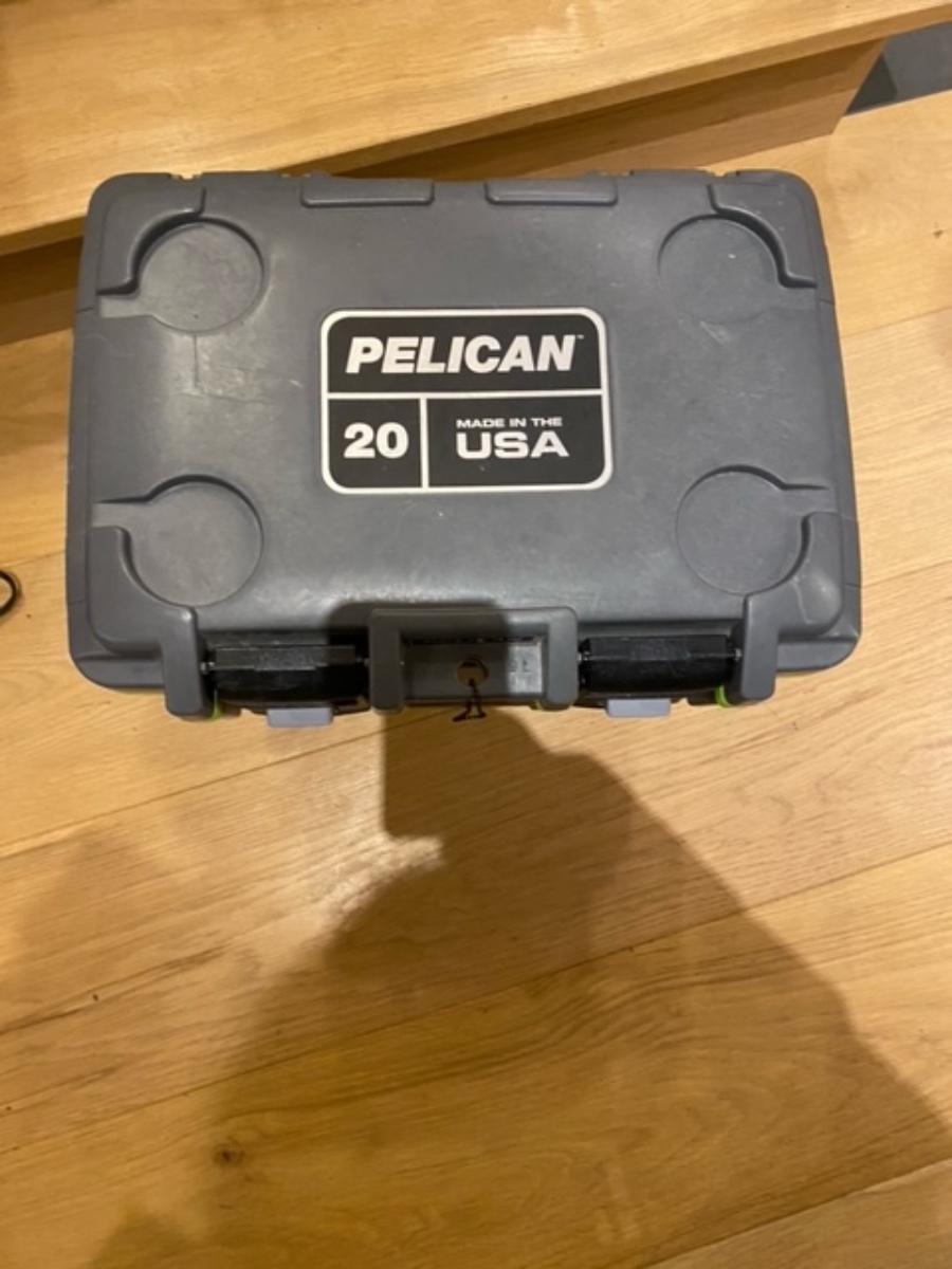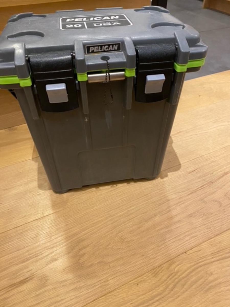Pelican 20 Quart cooler. Rugged and heavy duty to withstand extreme conditions and with stainless steel hardware. Keeps ice cold for up too 3 days.