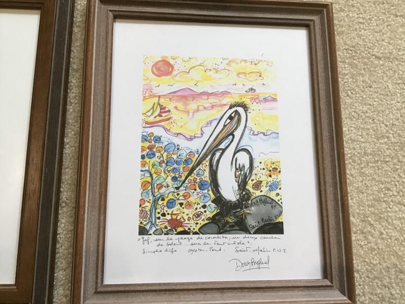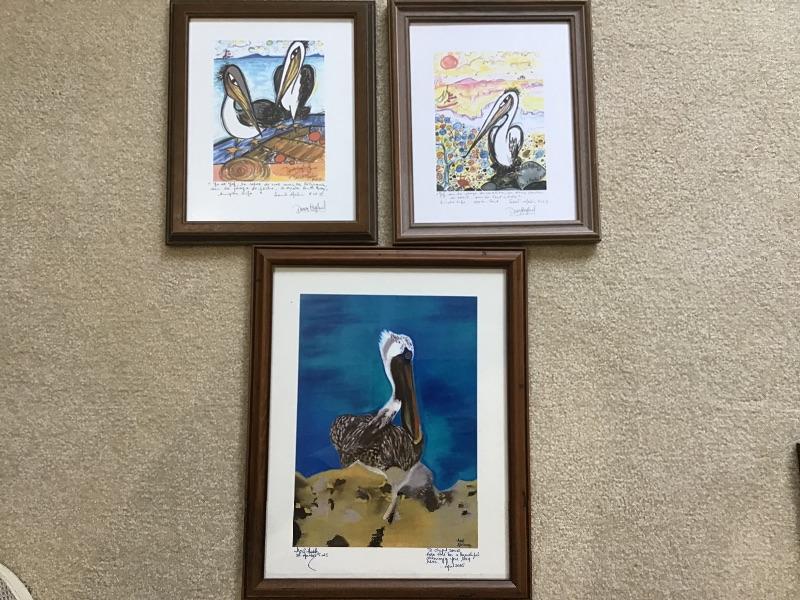 Unique Prints of pelicans by Doug and Asif. From St. Martin, F.W.I. Larger print measures 12 1/2” x 15 1/2”. Two other prints measure 9 1/2” x 11 1/2”.