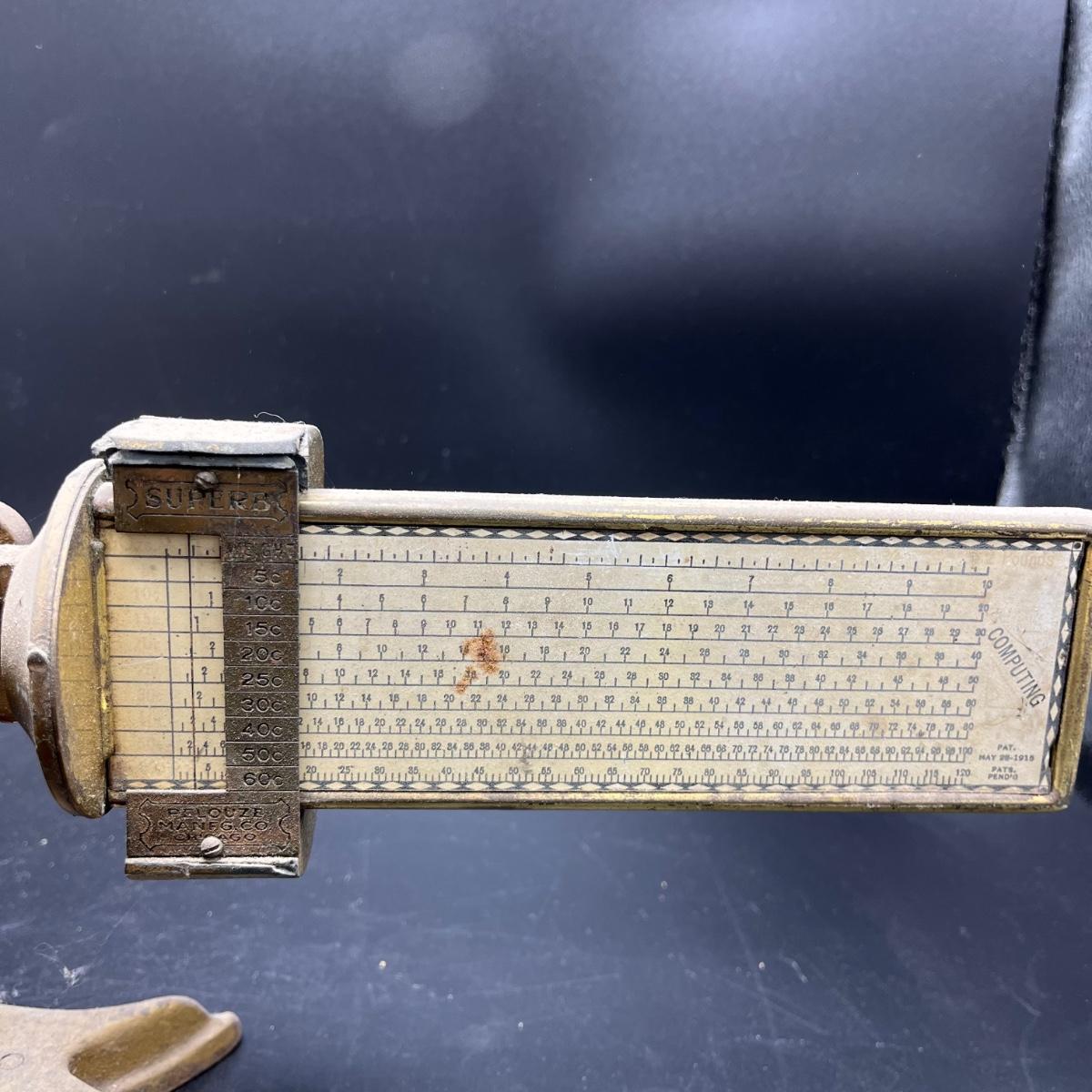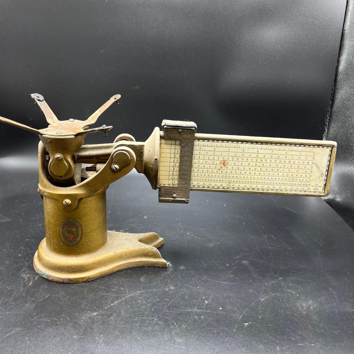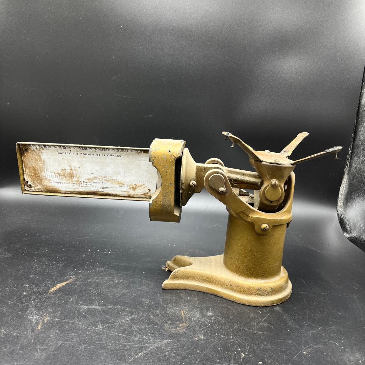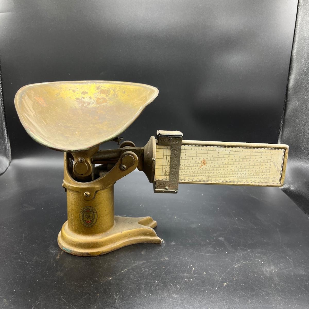 Lot includes a vintage metal Pelouze candy scale. Scale without pan measures 5.25” x 13” x 7”.