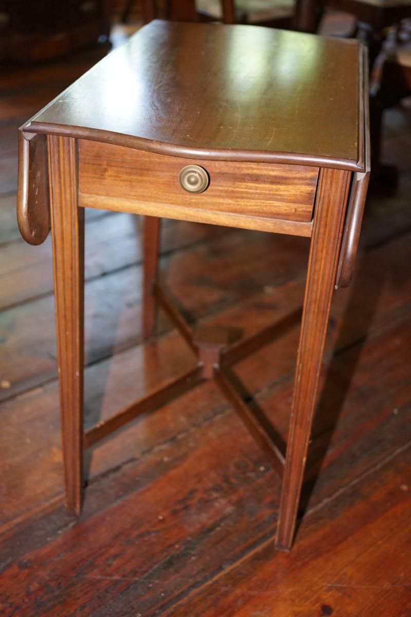 PEMBROkE STYLE MAHGOGANY DROP LEAF / ONE DRAWER SIDE TABLE BRASS KNOB AND SCALLOPED DROP LEAVES