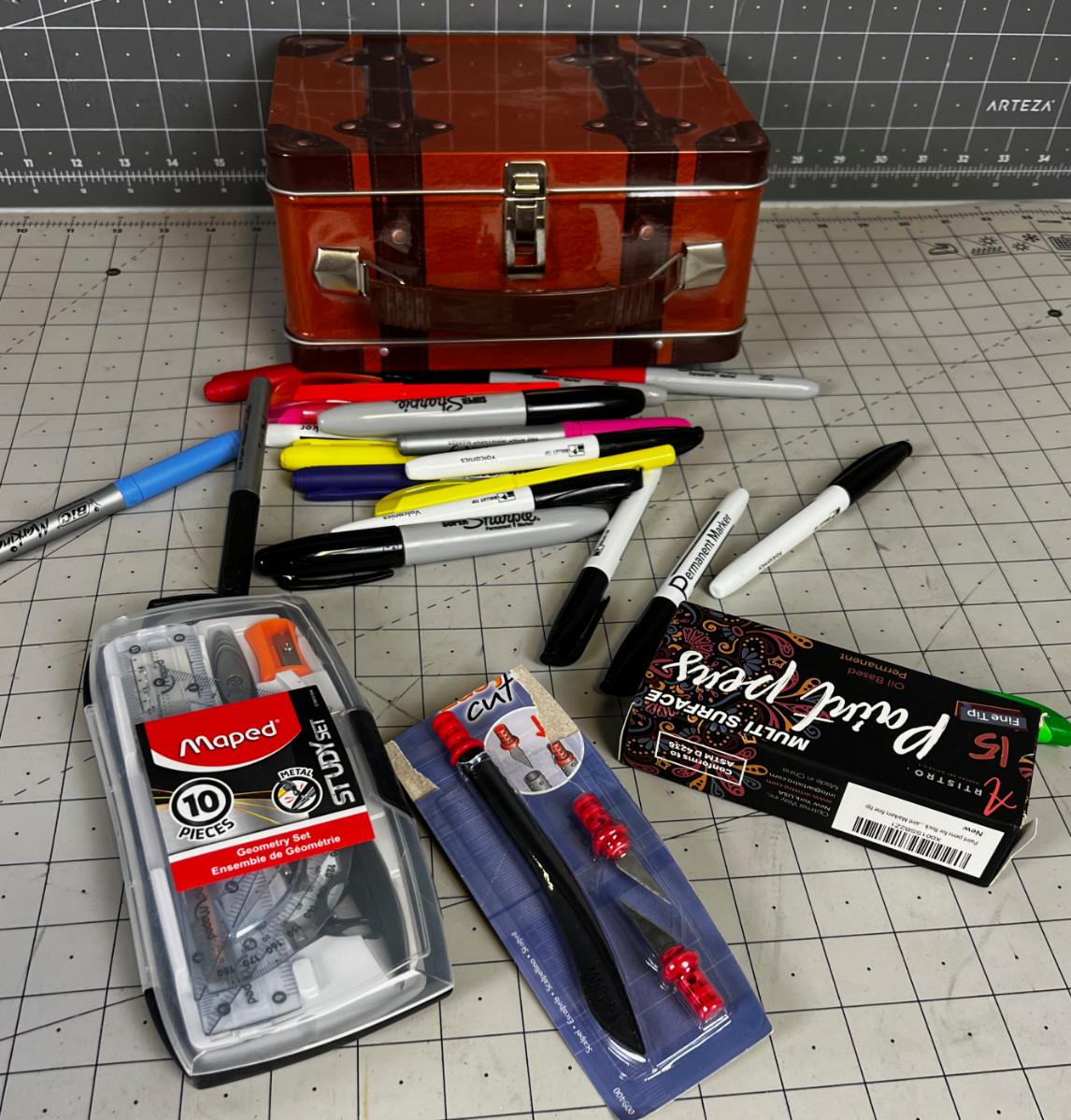 Pencil Box with Stuff: Markers, Compass, Pens, Etc.