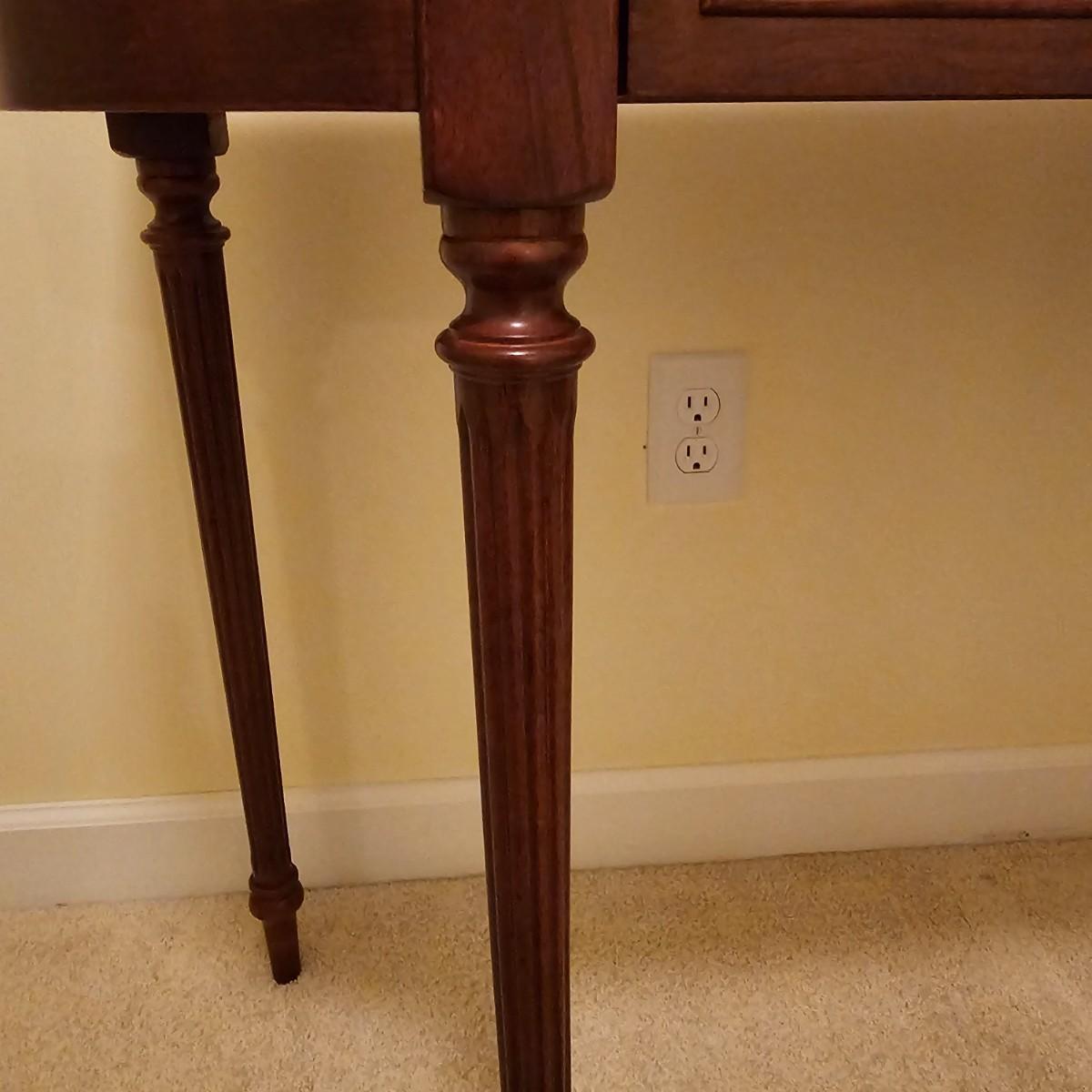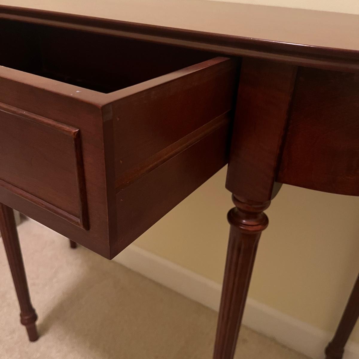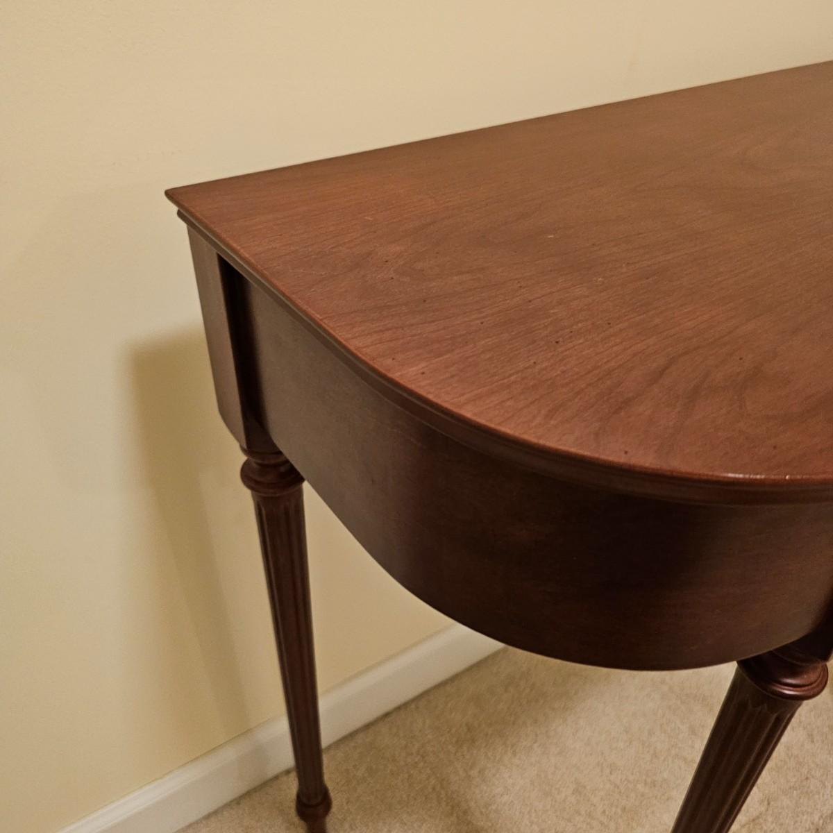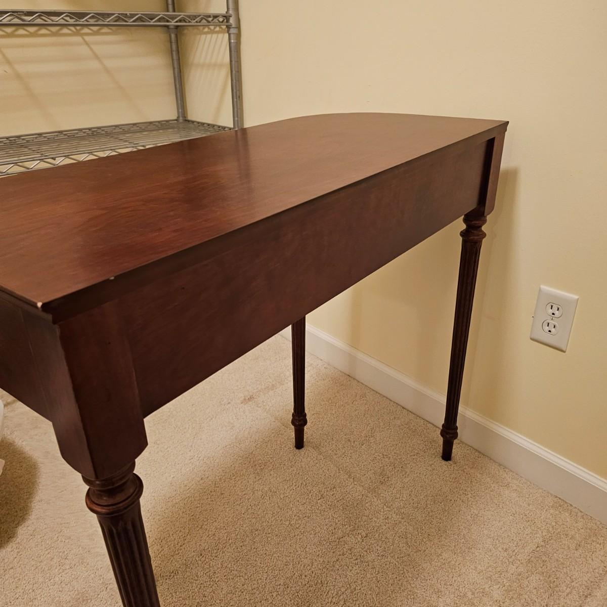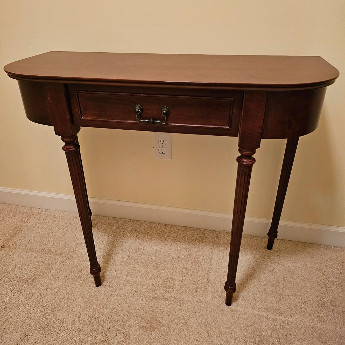 Dark wood table with fluted pencil post legs. Perfect for hall, side board or behind sofa. Rounded front corners and a single pull out drawer. Table measures 35" x 15" x 30"H. See photos for details. Local pickup only. Item is located upstairs. Please bring assistance to move and load this item due to it's location.