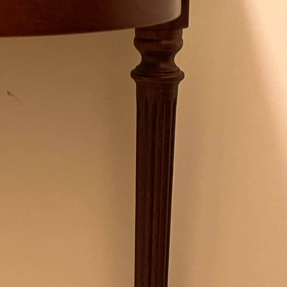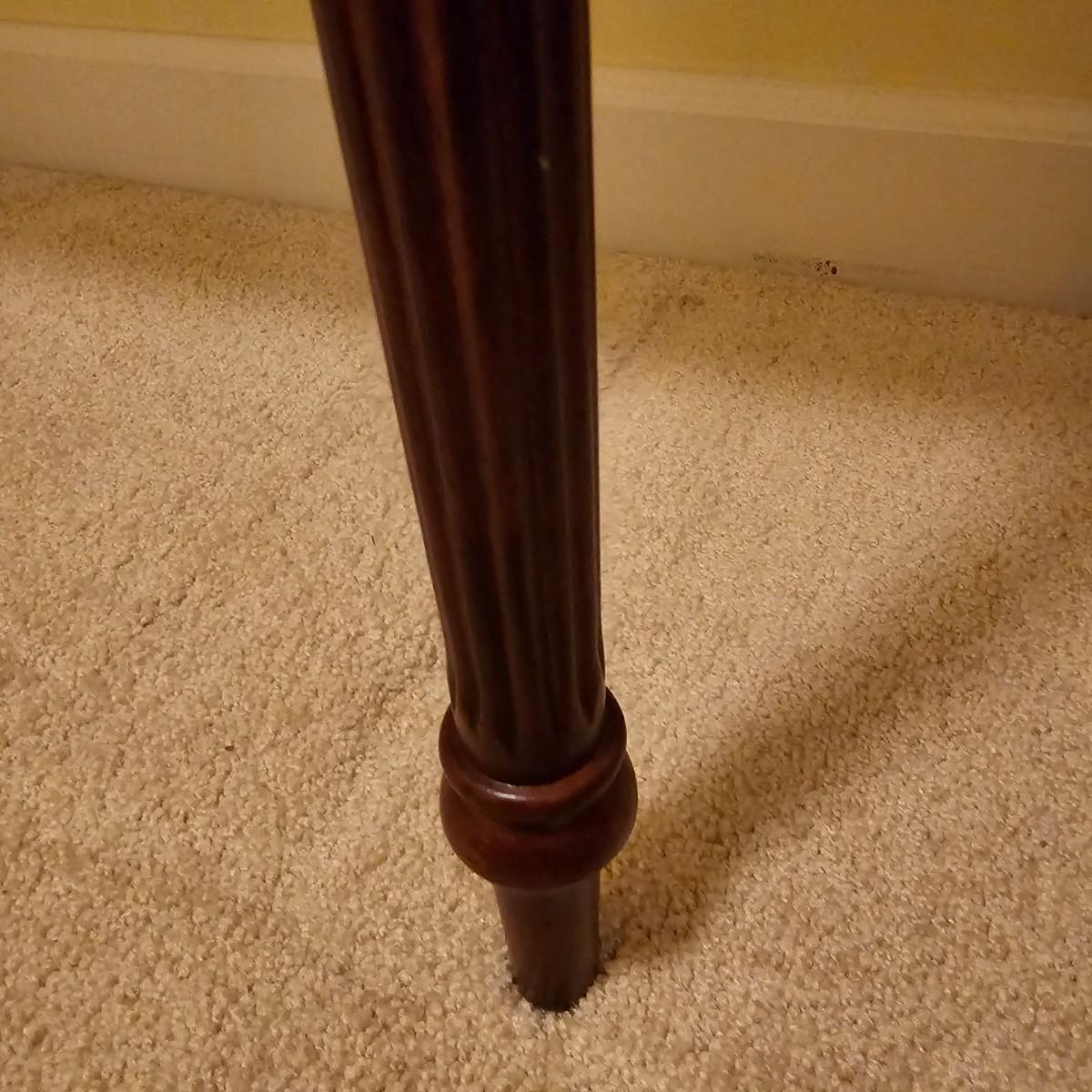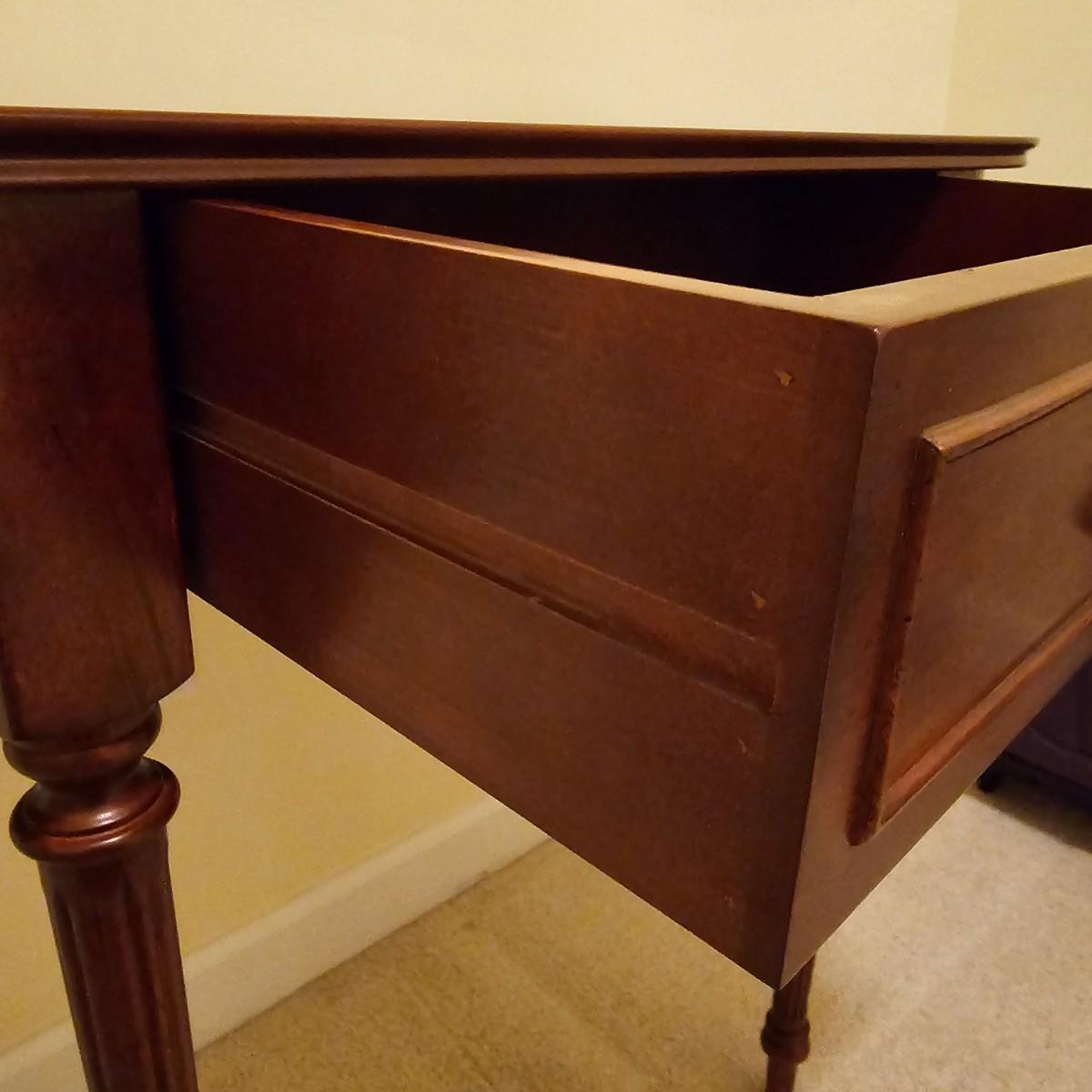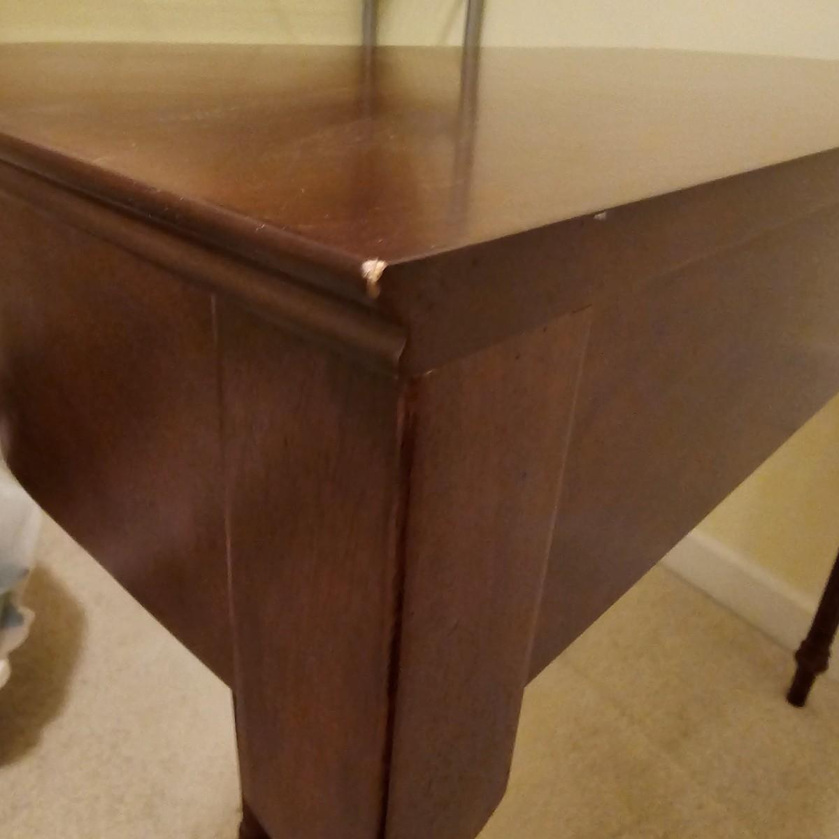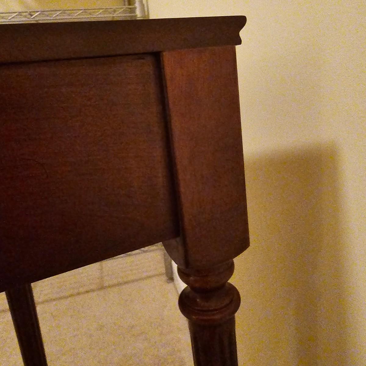 Dark wood table with fluted pencil post legs. Perfect for hall, side board or behind sofa. Rounded front corners and a single pull out drawer. Table measures 35" x 15" x 30"H. See photos for details. Local pickup only. Item is located upstairs. Please bring assistance to move and load this item due to it's location.