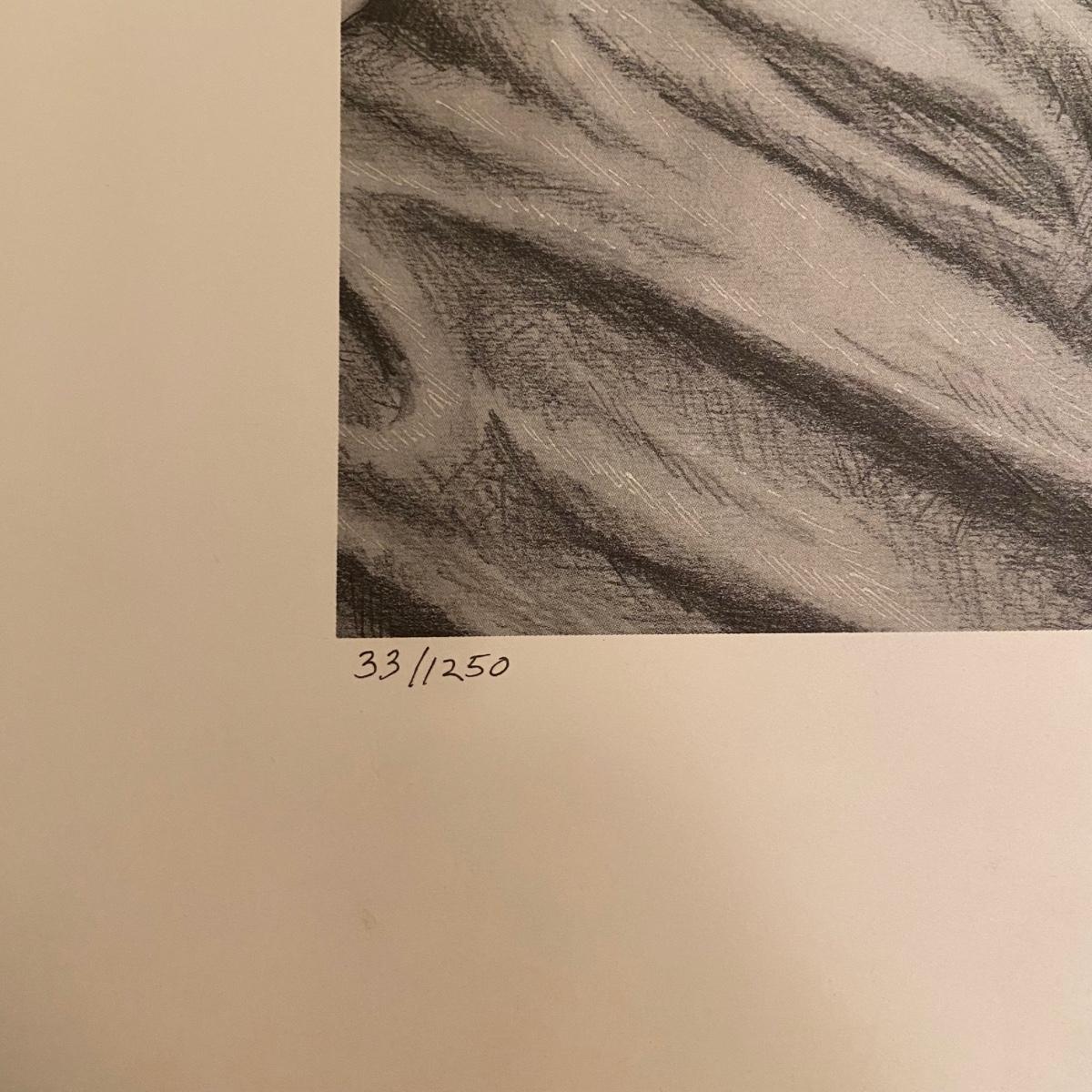 Print of what appears to be a pencil drawing, that is numbered and appears to have original signature in ink. Paper measures 28.25” x 23H”. Has some discoloration on back and a couple areas where it appears to have some tape residue. Small hand written note on back as well. This piece is currently rolled up. Paper weights not included.