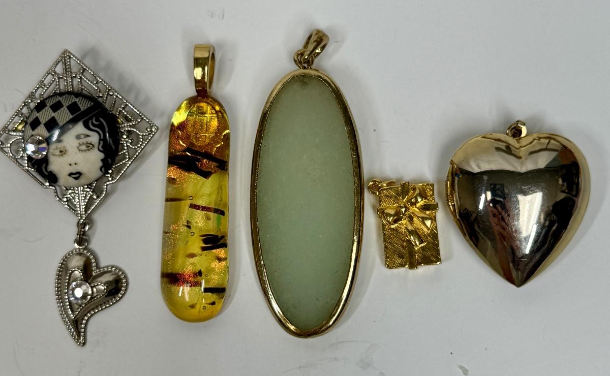 Pendant Lot #1 - misc Pendants in amber, jade, gold tone, etc