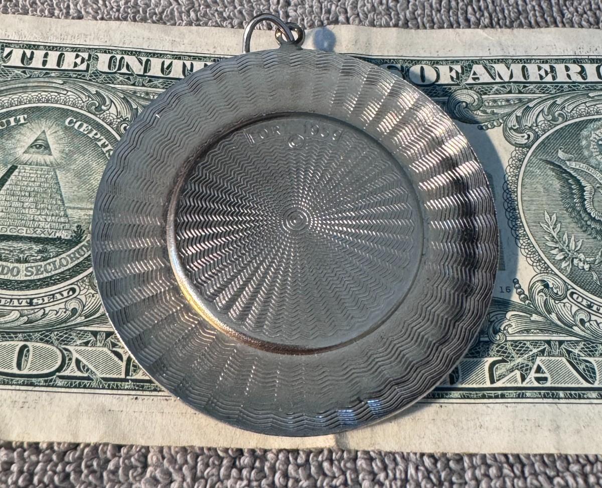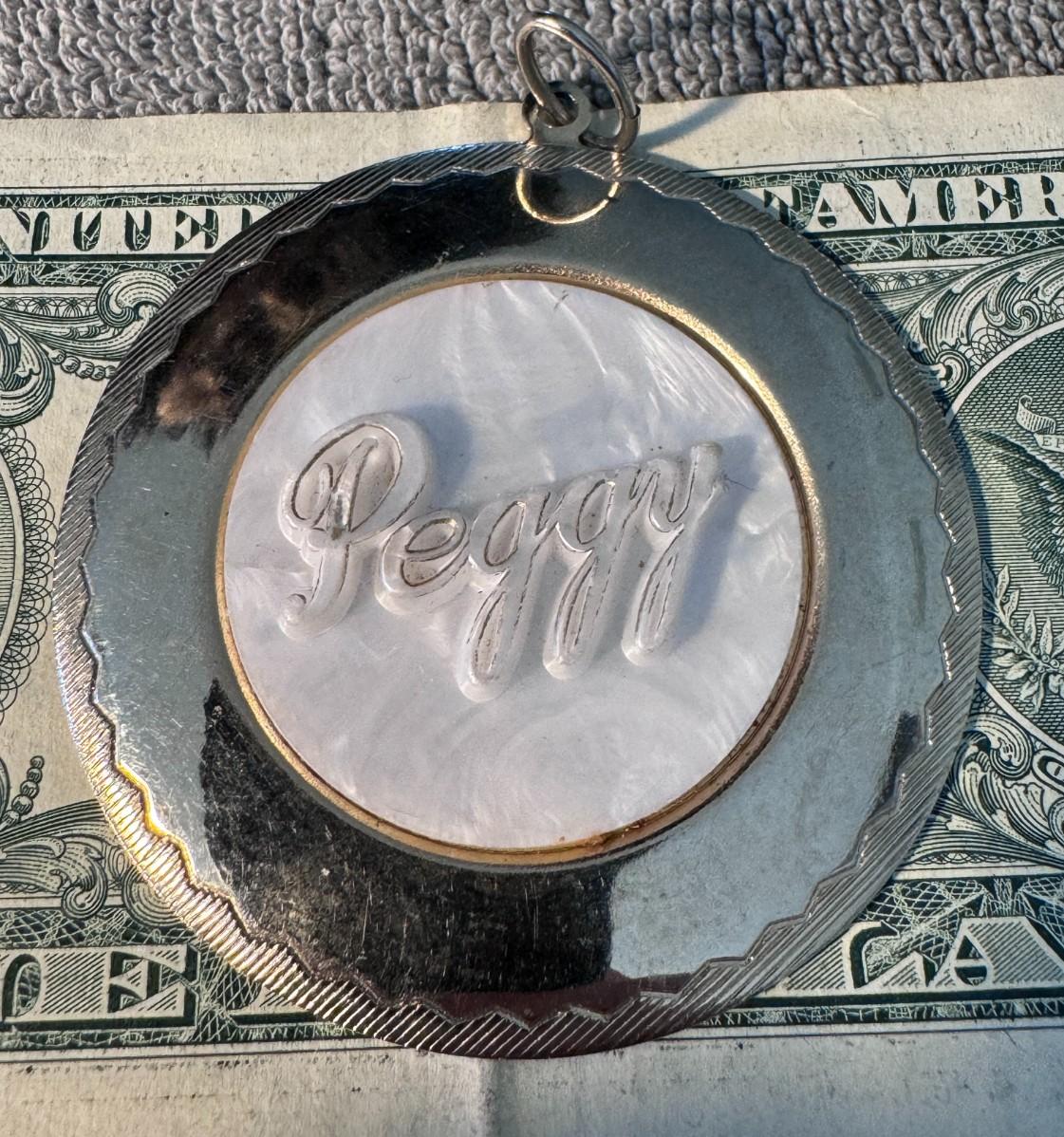 Materials: The outer border is a silver-colored metal, and the central, white area where "Peggy" is displayed could be mother-of-pearl, a type of shell inlay, or a similar material known for its iridescent quality. The name itself appears to be embossed or raised from this white material.