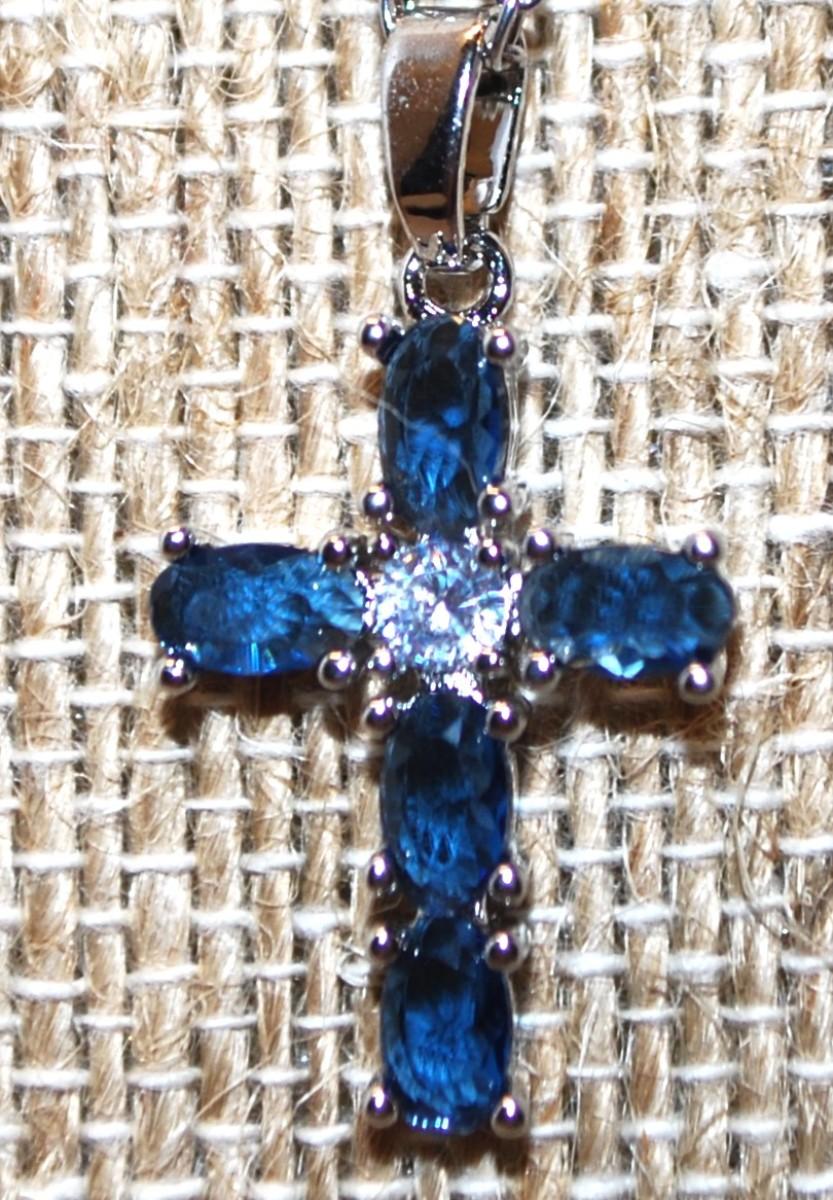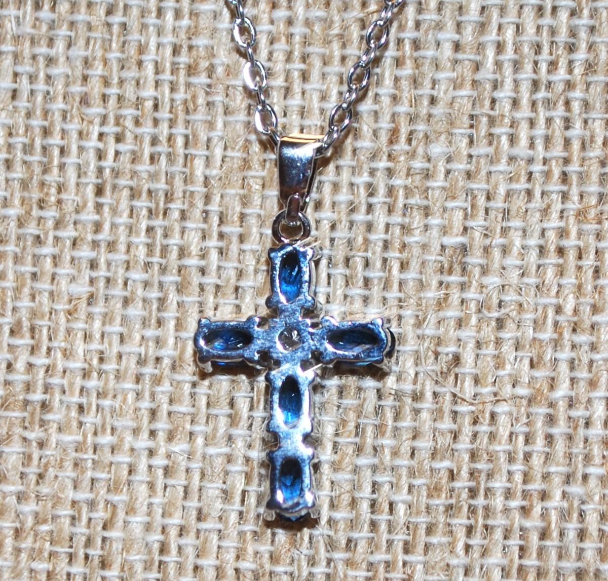 Petite Pendant Cross on Silver Chain Necklace with Blue Cubic Zirconia Stones 20" Chain
