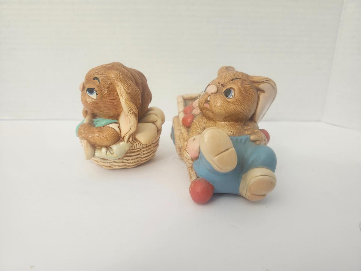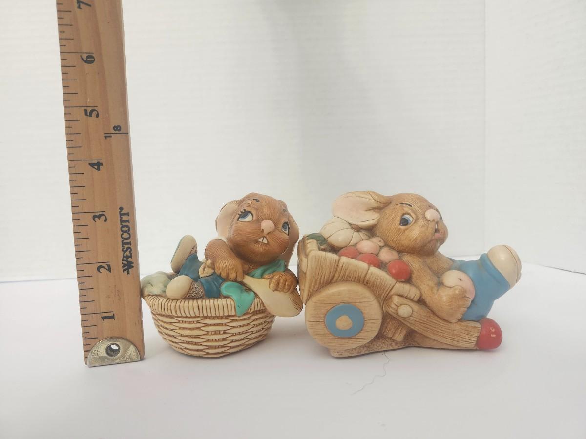 Pair of Pendelfin Stonecraft rabbit figurines made in England. Includes Little Joe in basket and Barrow Boy with wheelbarrow. Hand painted with felted bases and original labels shown. Vintage whimsical display pair for Pendelfin collectors.