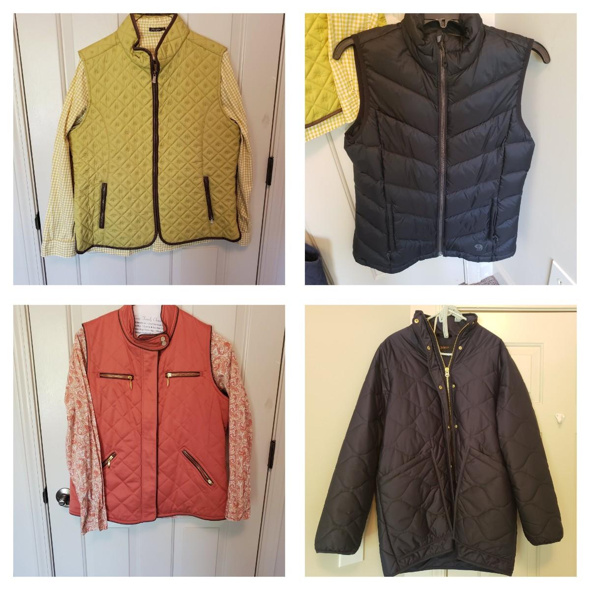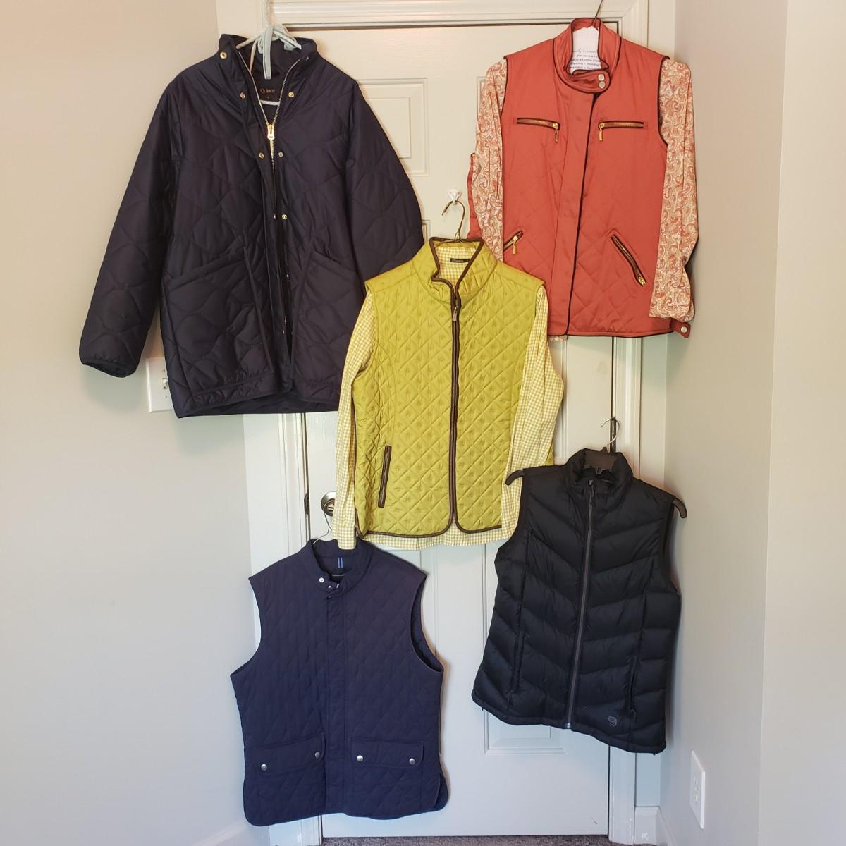 This five piece lot features some great name brands! There is a Hard Wear down vest in black, size M. The two piece sets of a shirt and matching vest are the perfect fall outfit! See pictures for sizes and brand names.