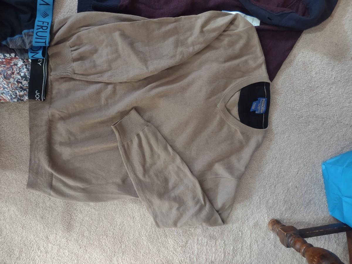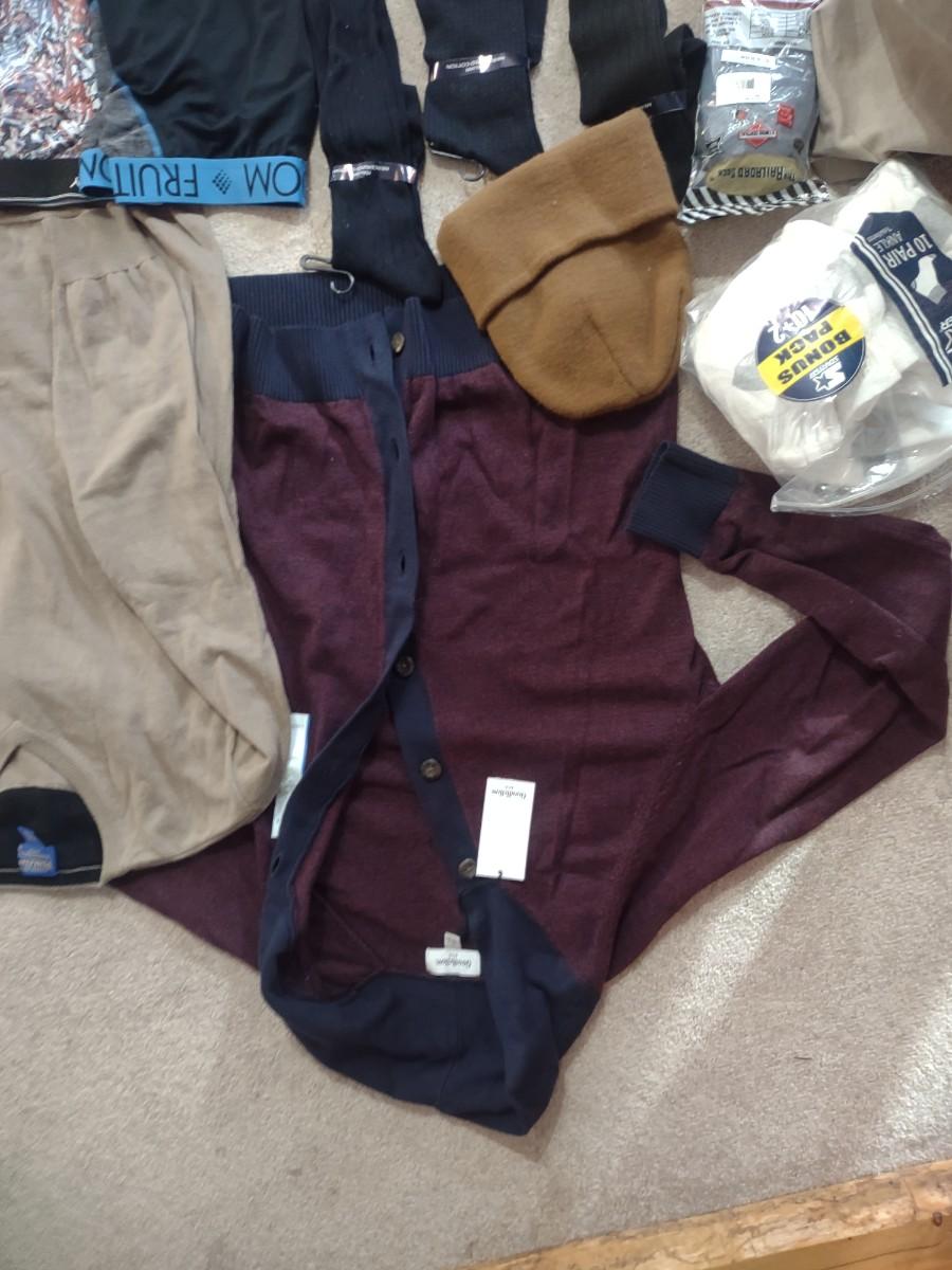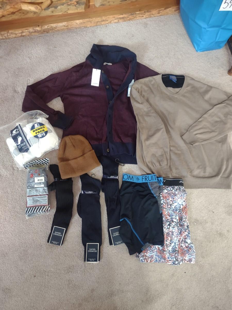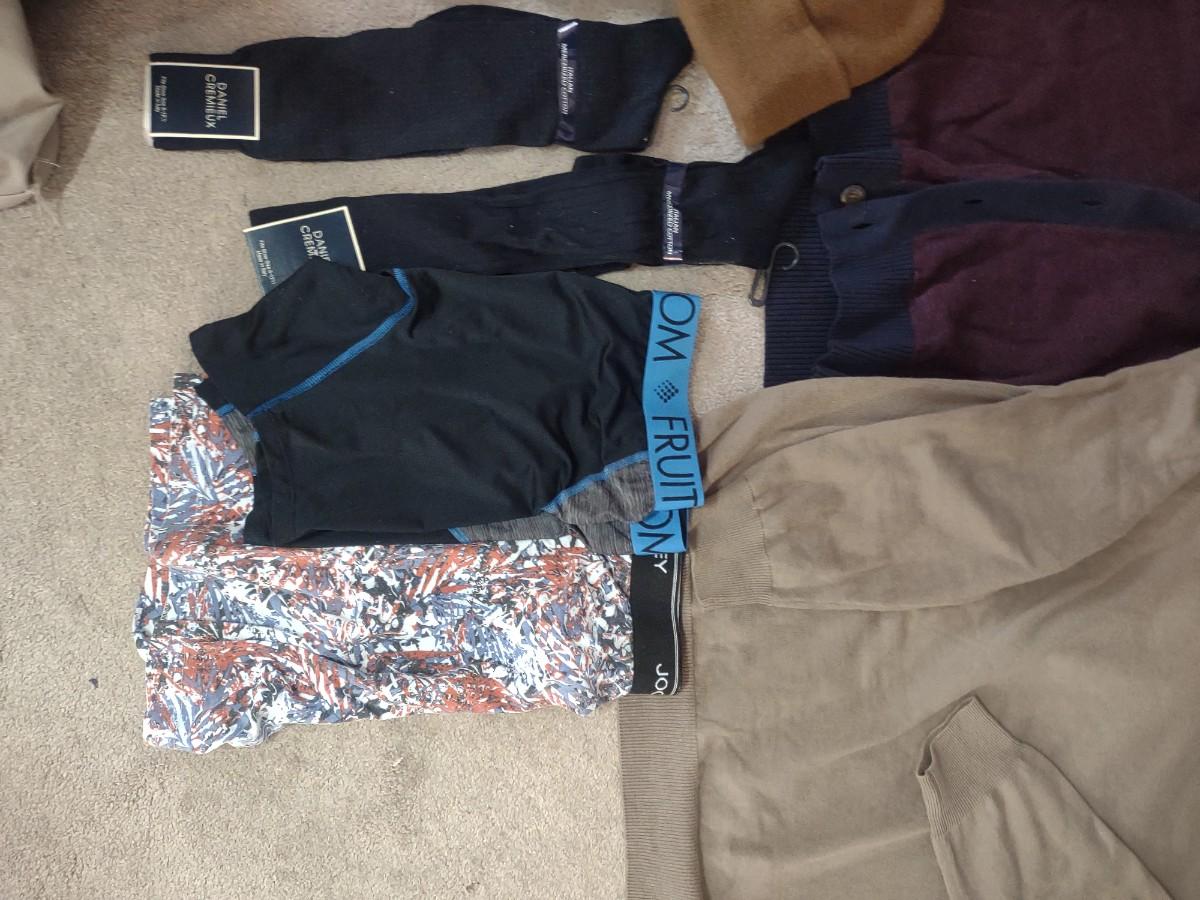 PENDLETON MENS SWEATER SIZE LARGE, GOODFELLOW SWEATER, DRESS SOCKS, UNDER ARMOUR BRIEFS