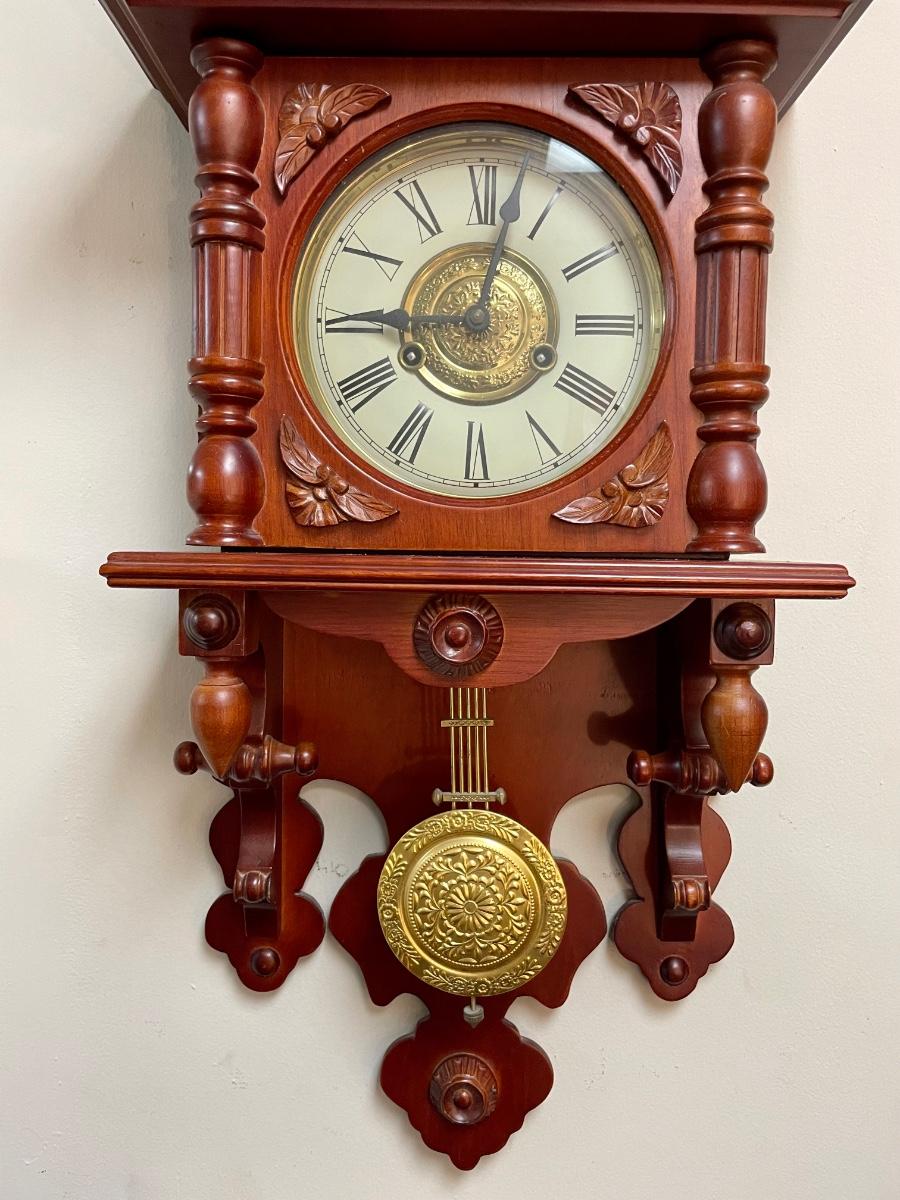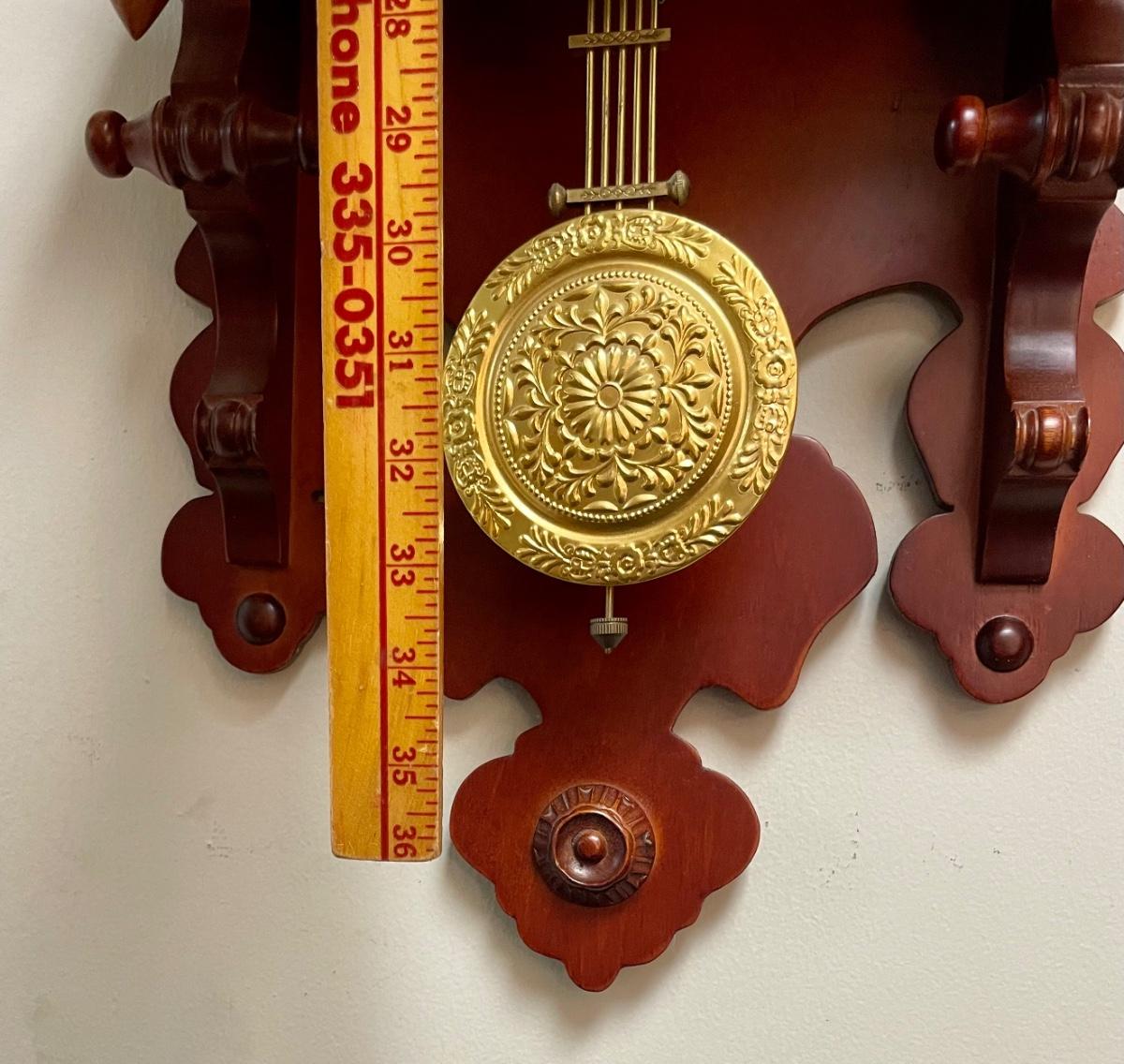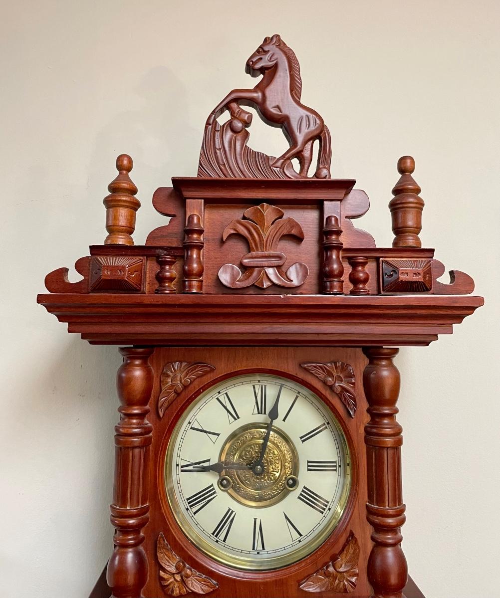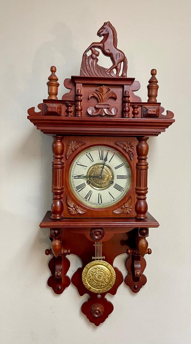 Pendulum Style Wall Clock. Bright reddish-brown stain. Ornate horse carving at top of clock, see photos. Overall height just over 36”.