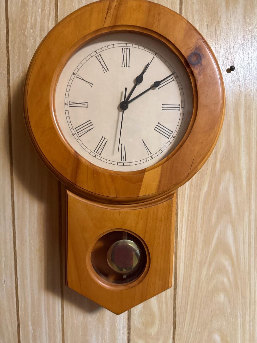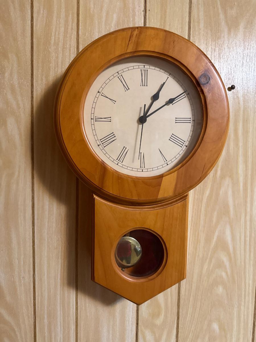 Pendulum wood wall clock. Requires a AA battery not included. Tested and works well with battery’s
