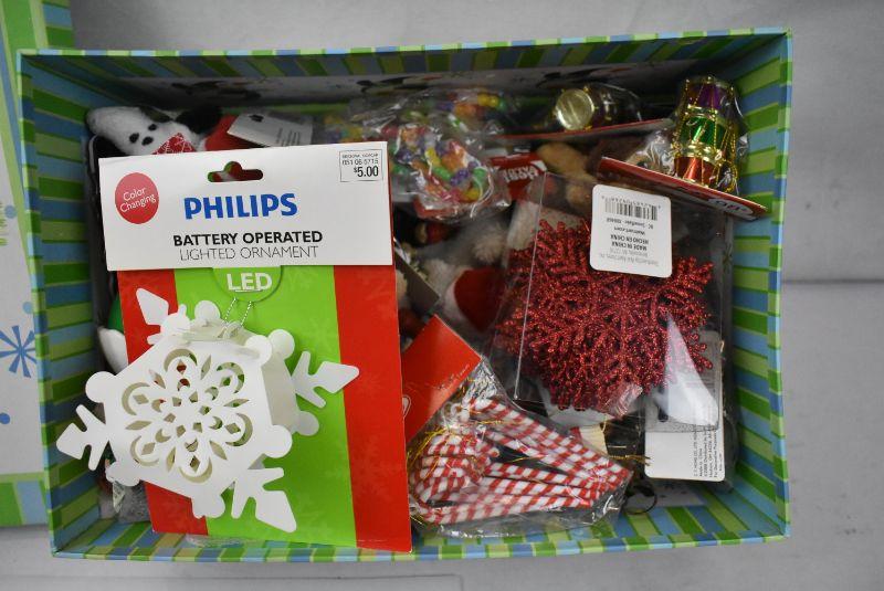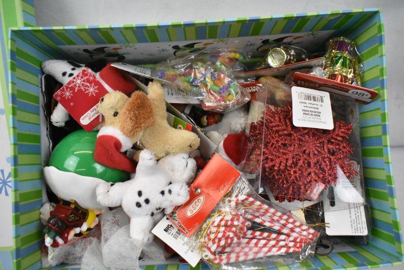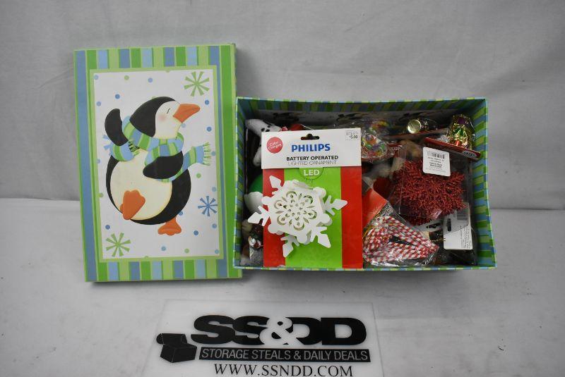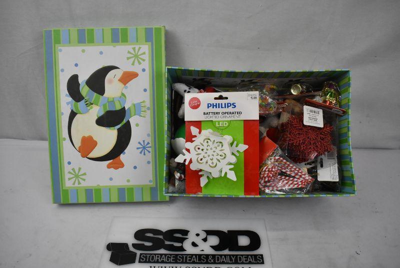 Penguin Box filled with Misc Christmas Ornaments, etc