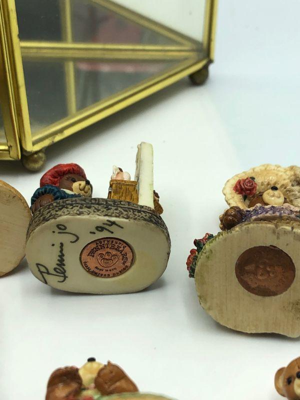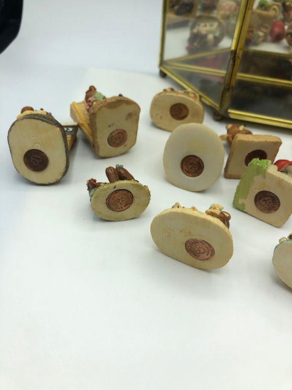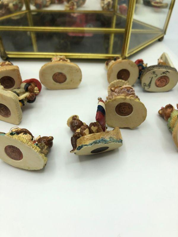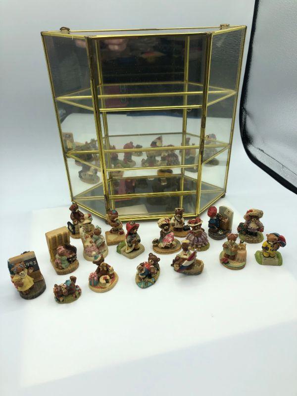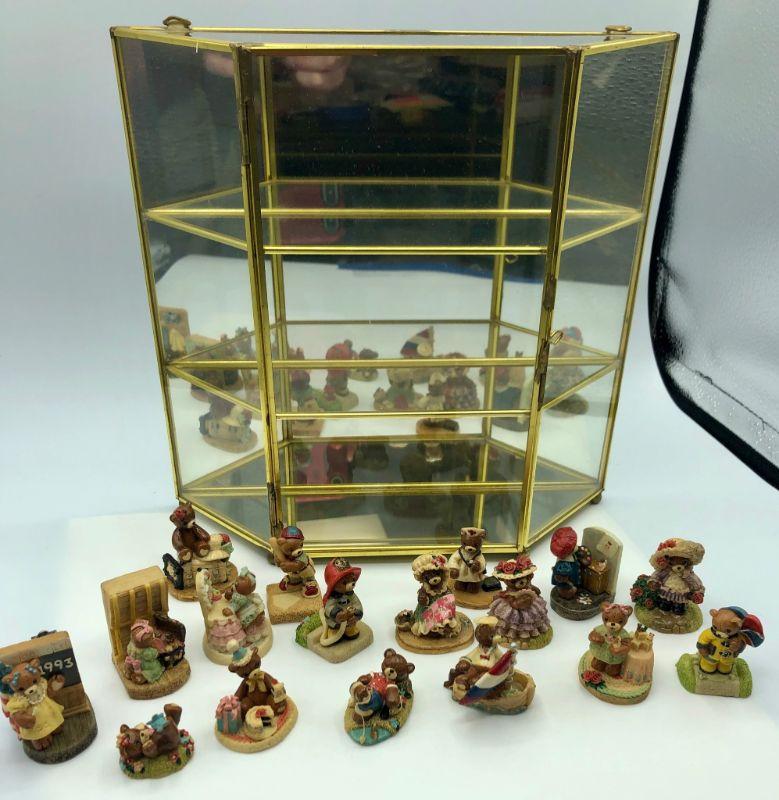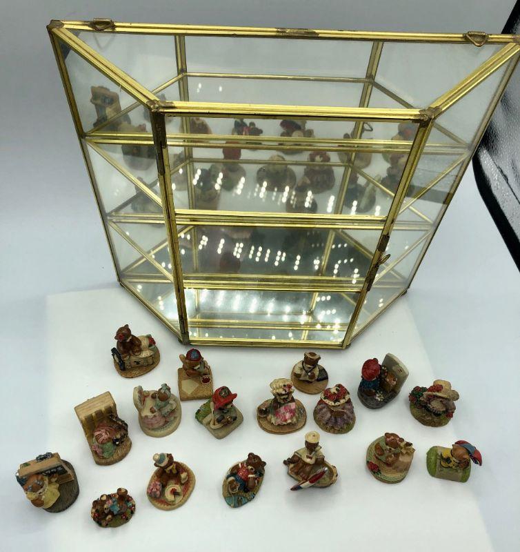 Penni Bear miniature figurines collection with small glass display case. 17 bear figurines. Mirrored glass display case.