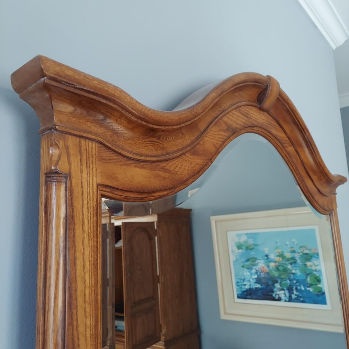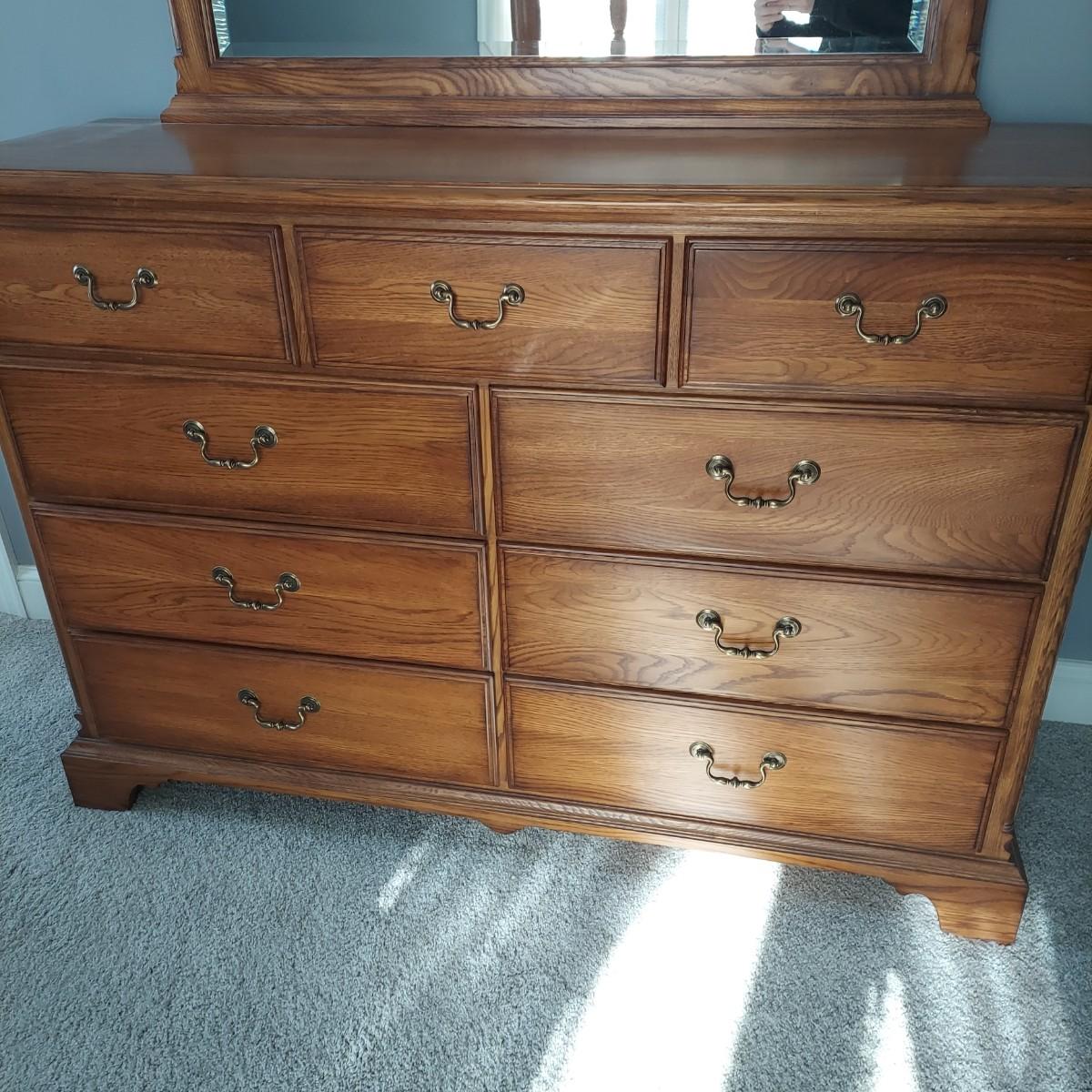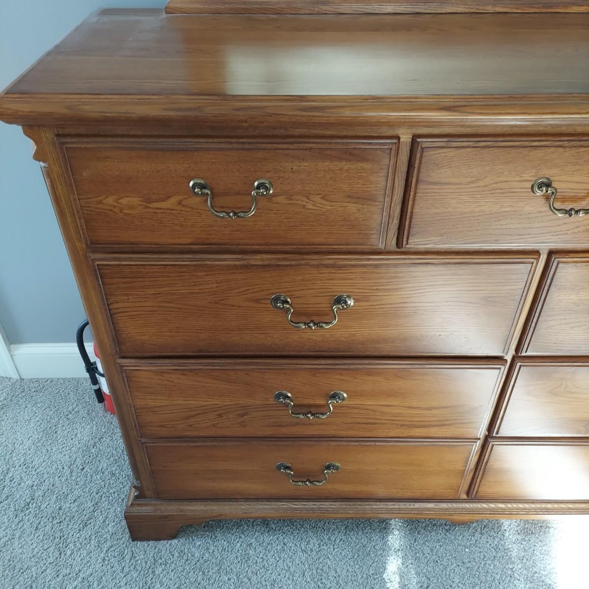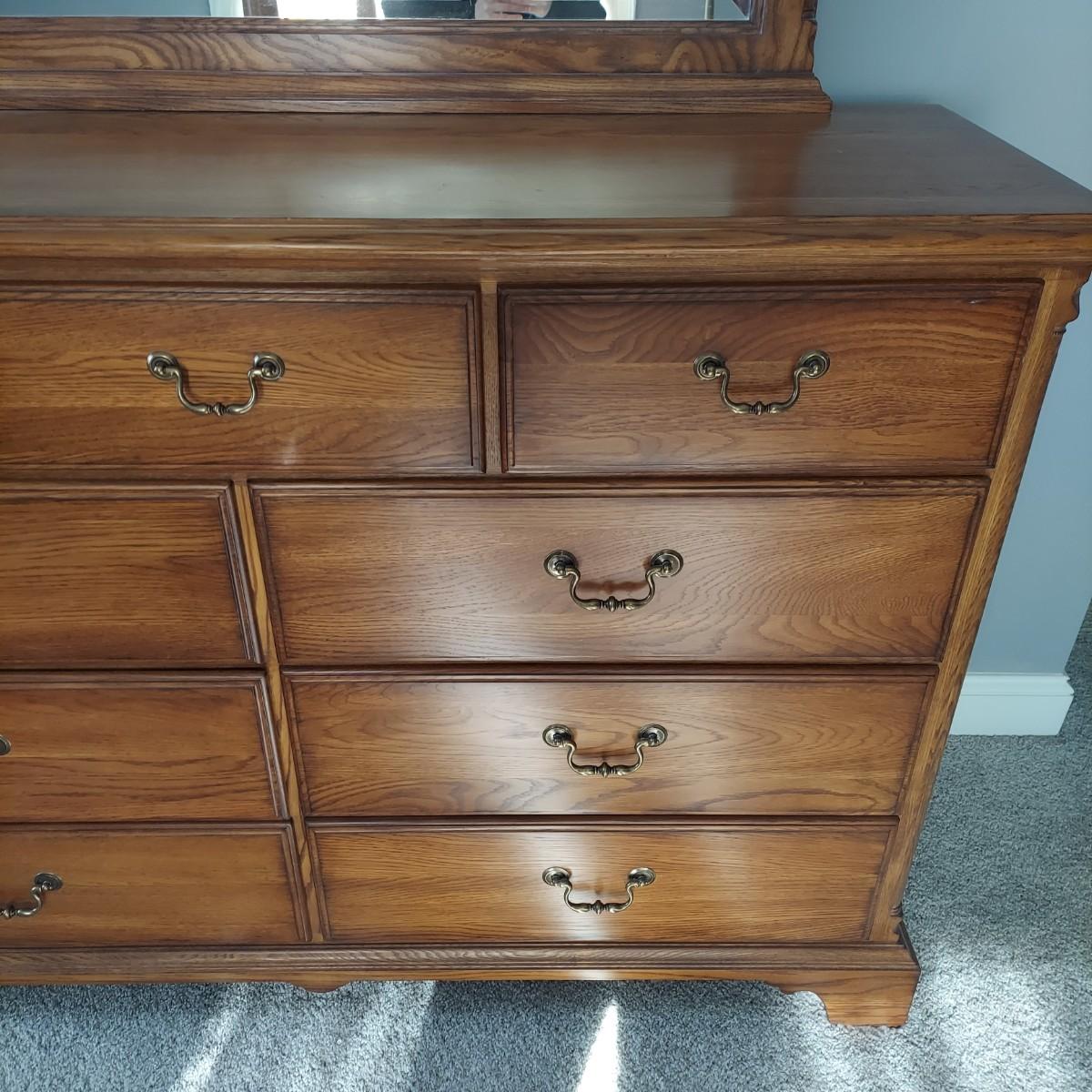 Matching Pennsylvania House bedroom furniture. Includes a nightstand and a mirror on chest style dresser. The dresser measures approximately 61” x 19.5” x 42"H and w/ Mirror 82”H. This piece is heavy. The mirror comes apart and can be hung as well. The nightstand measures 28.5” x 17” x 17.5"H. Both have dovetailed drawers and are marked Global Limited Lay Z Boy on back. Appears to be solid oak. Matches lots 16 and 58. Local Pickup Only. Winning bidder must bring assistance to help move and load this item due to its weight and/or size.