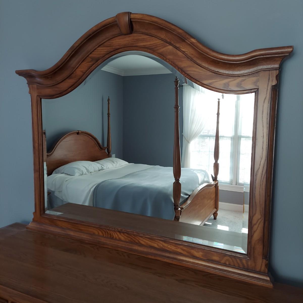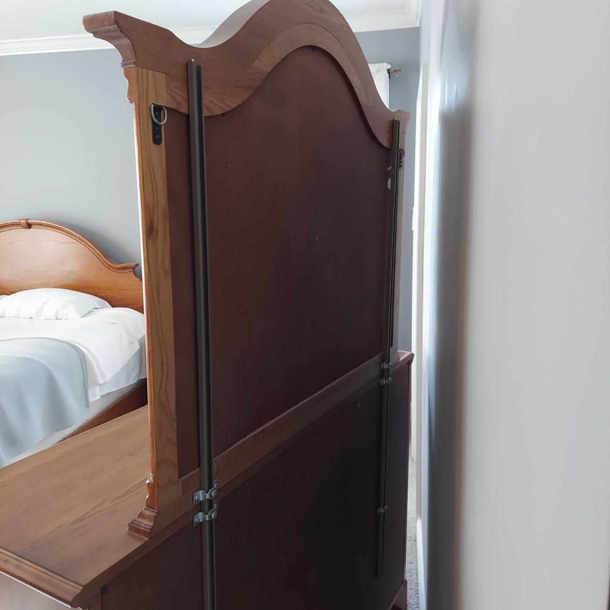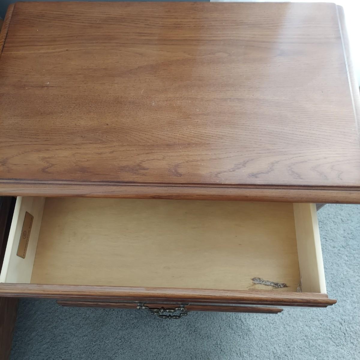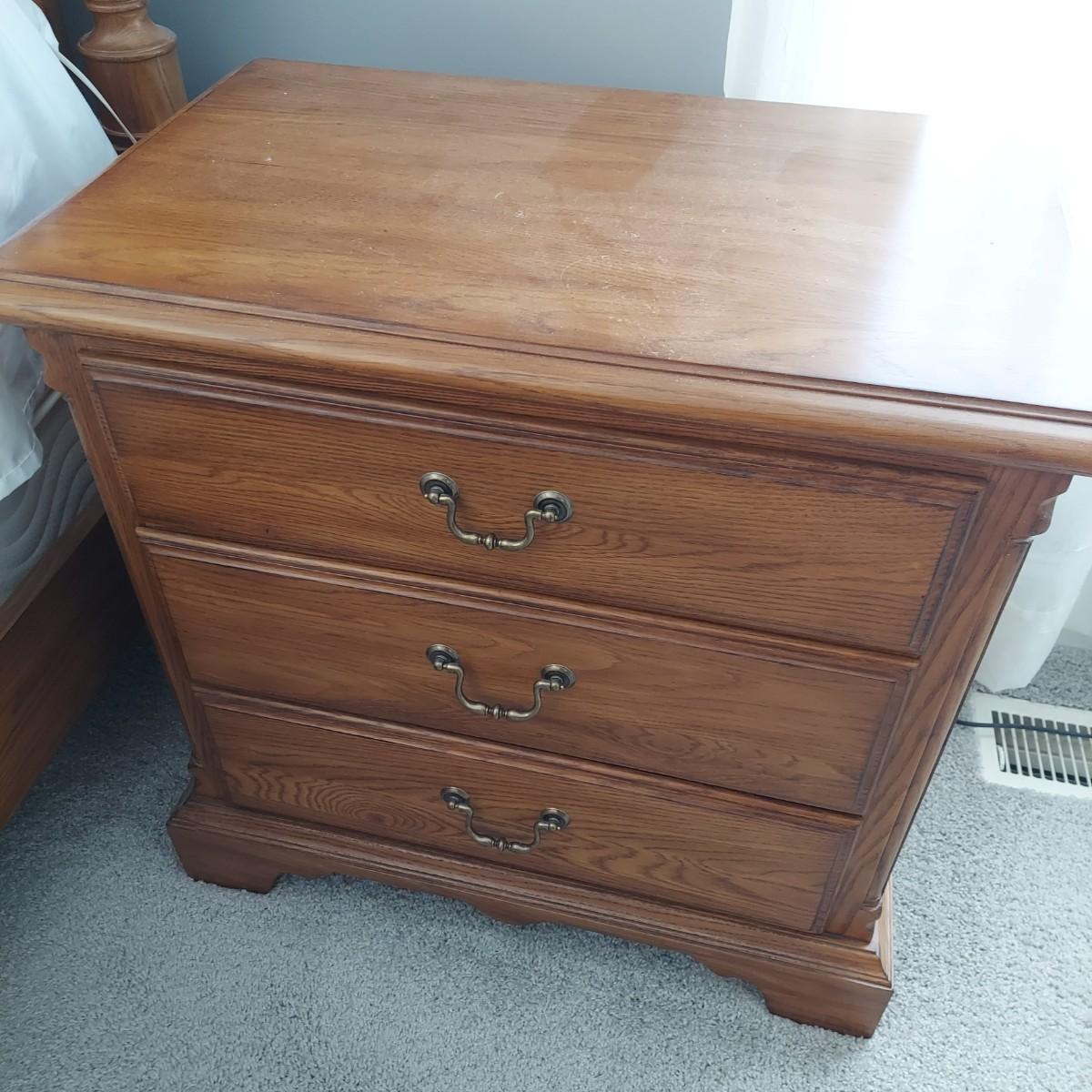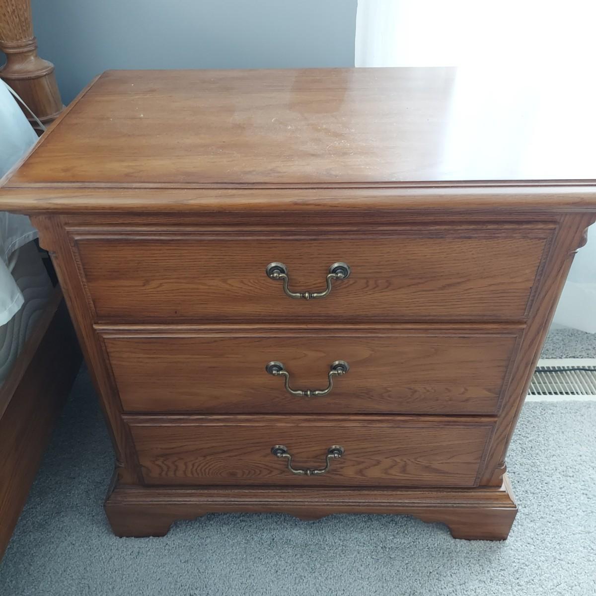 Matching Pennsylvania House bedroom furniture. Includes a nightstand and a mirror on chest style dresser. The dresser measures approximately 61” x 19.5” x 42"H and w/ Mirror 82”H. This piece is heavy. The mirror comes apart and can be hung as well. The nightstand measures 28.5” x 17” x 17.5"H. Both have dovetailed drawers and are marked Global Limited Lay Z Boy on back. Appears to be solid oak. Matches lots 16 and 58. Local Pickup Only. Winning bidder must bring assistance to help move and load this item due to its weight and/or size.