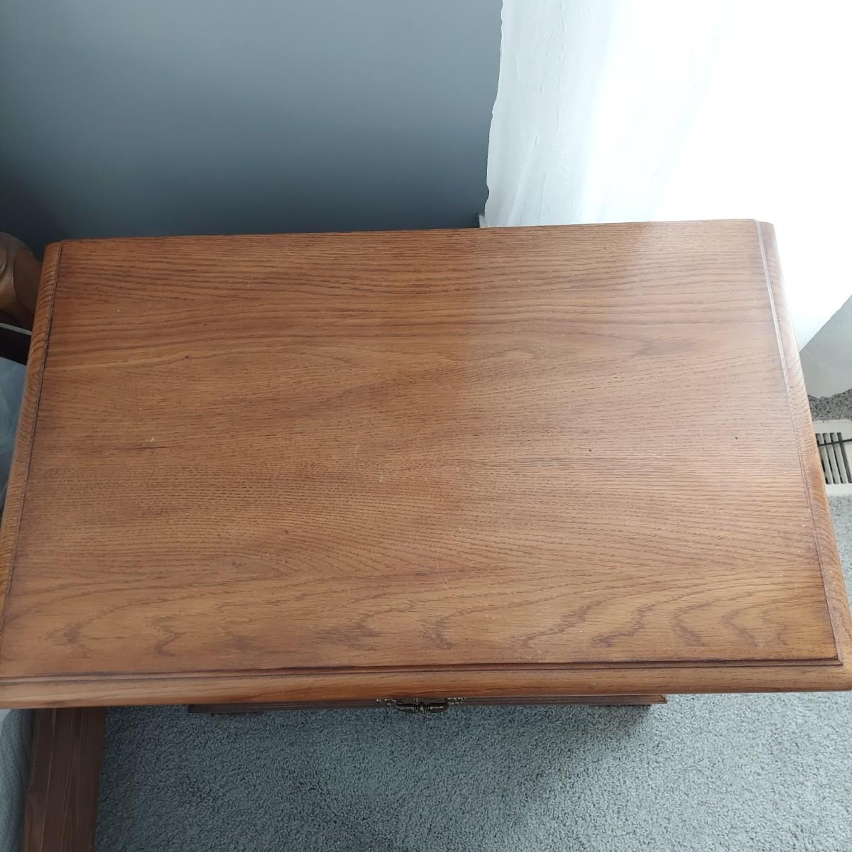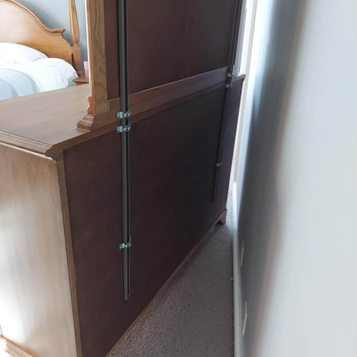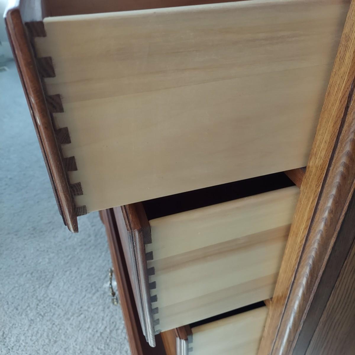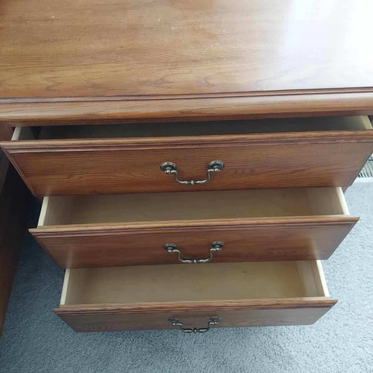 Matching Pennsylvania House bedroom furniture. Includes a nightstand and a mirror on chest style dresser. The dresser measures approximately 61” x 19.5” x 42"H and w/ Mirror 82”H. This piece is heavy. The mirror comes apart and can be hung as well. The nightstand measures 28.5” x 17” x 17.5"H. Both have dovetailed drawers and are marked Global Limited Lay Z Boy on back. Appears to be solid oak. Matches lots 16 and 58. Local Pickup Only. Winning bidder must bring assistance to help move and load this item due to its weight and/or size.
