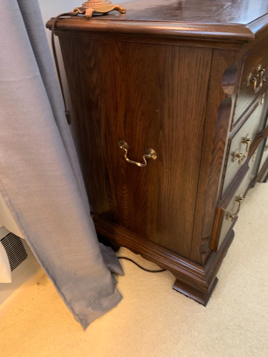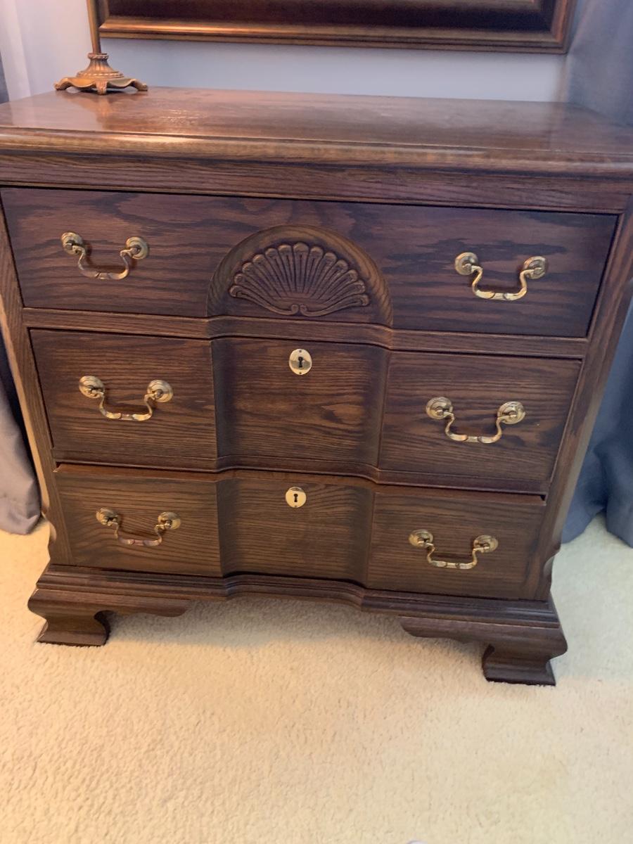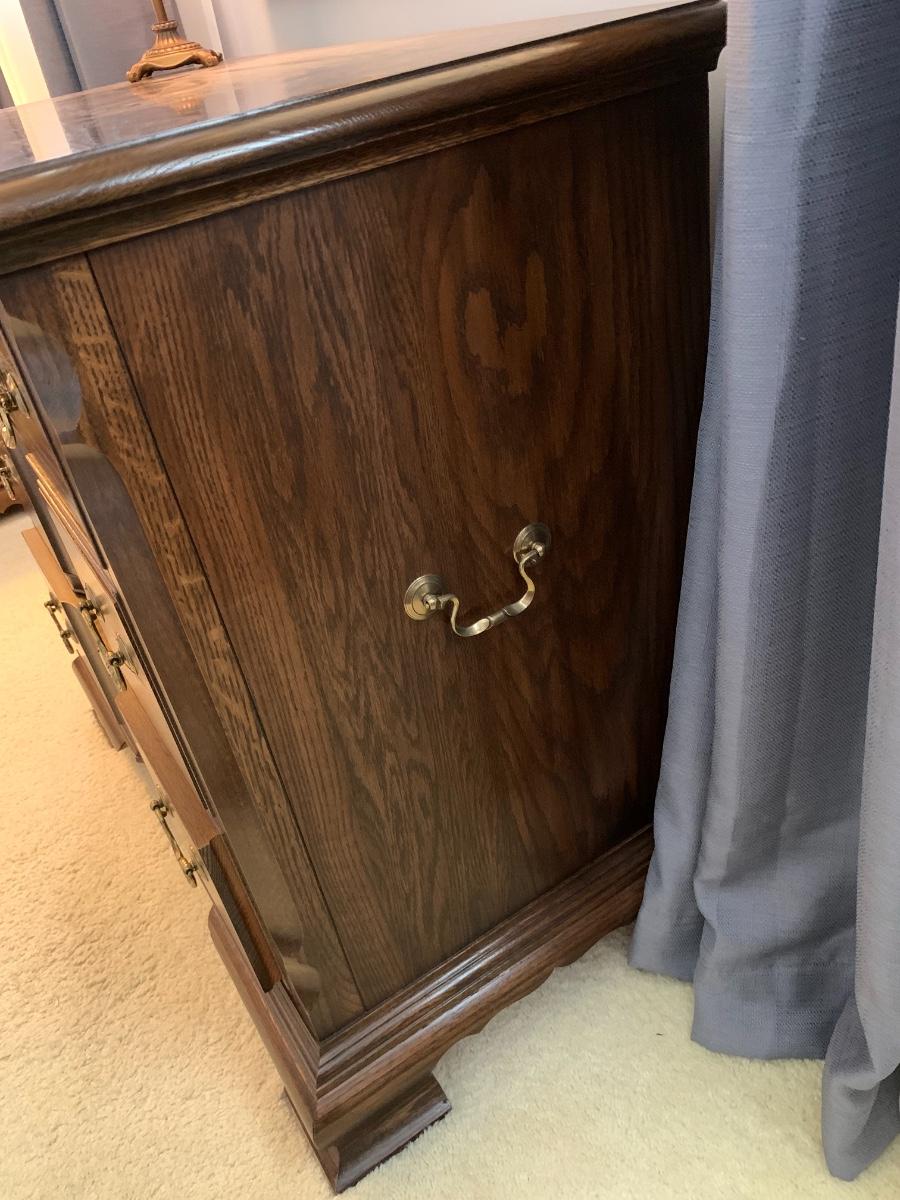 3 pull out drawers with carved details. Brass pulls and keyhole accents. and decorative handles on the side. Excellent overall condition with slight signs of wear on top.Very well madepiece of furniture.