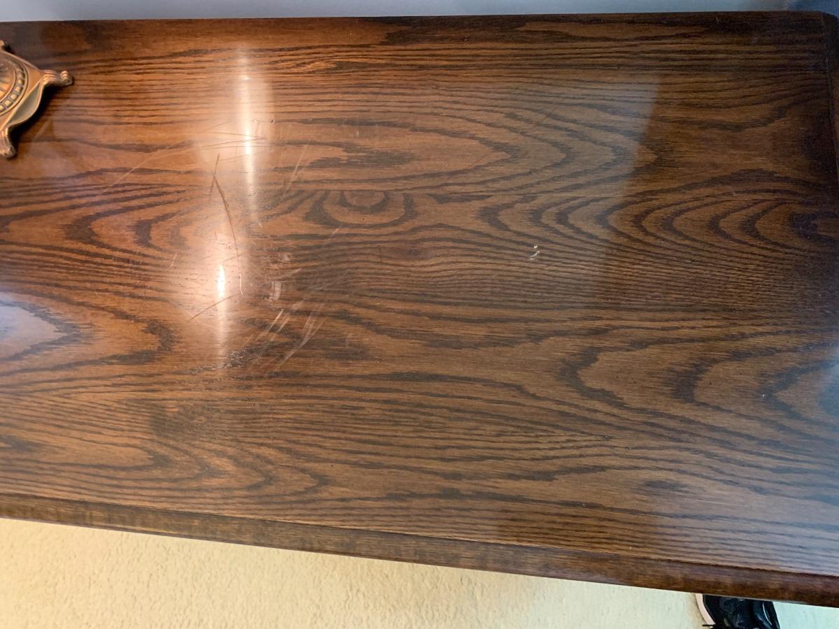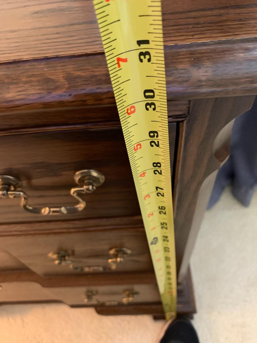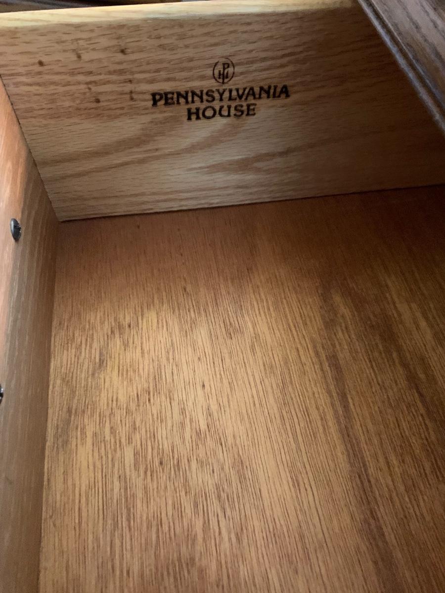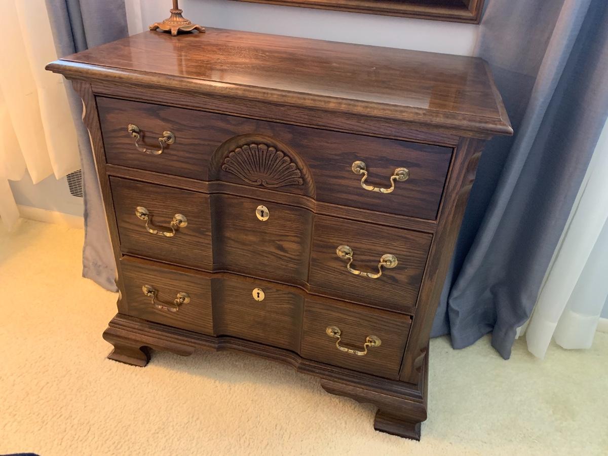3 pull out drawers with carved details. Brass pulls and keyhole accents. and decorative handles on the side. Excellent overall condition with slight signs of wear on top.Very well madepiece of furniture.