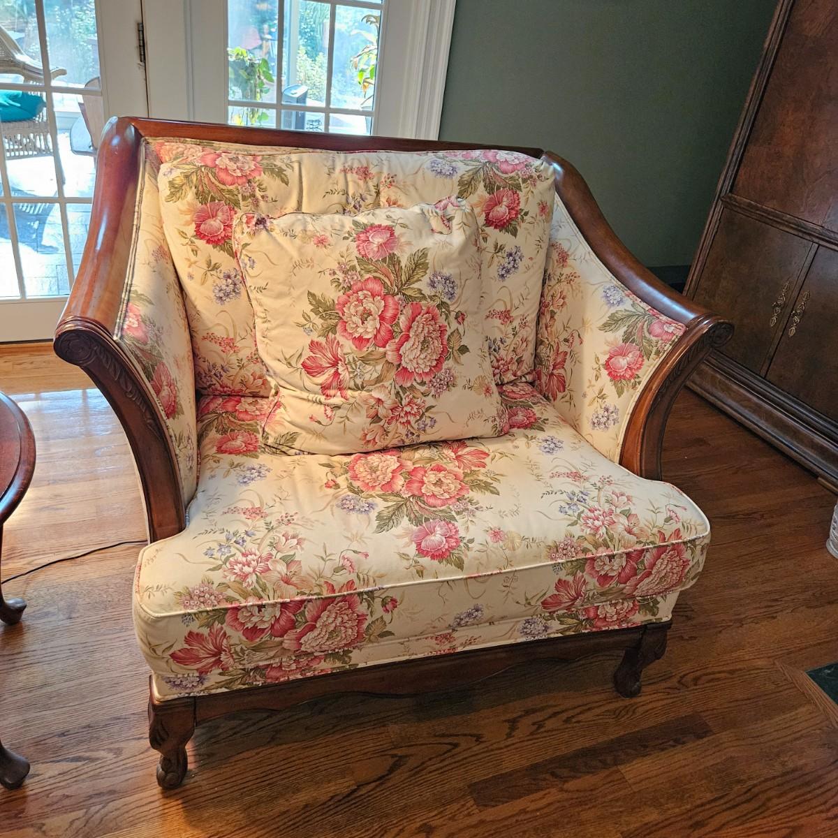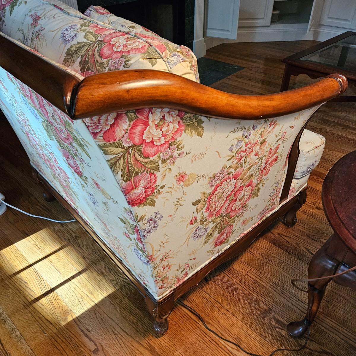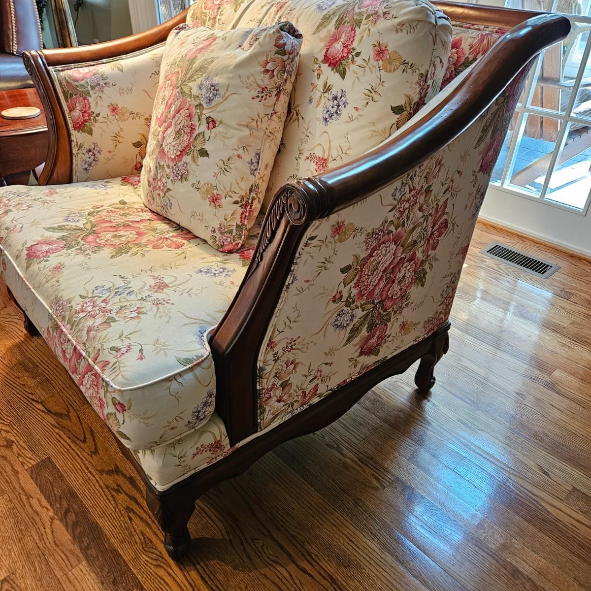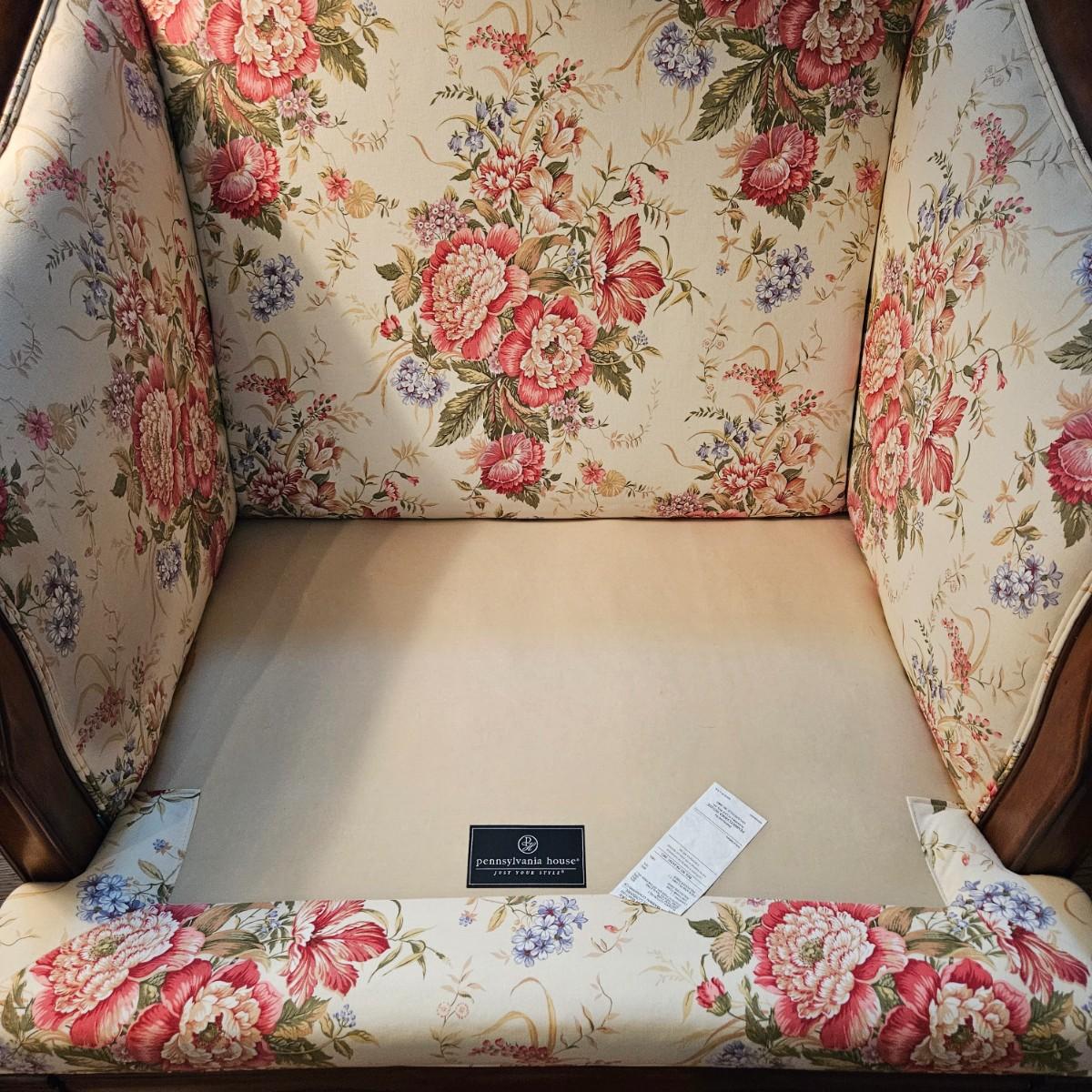 A Pennsylvania House wood framed, upholstered chair that features a floral pattern with a cream background. It measures approximately 48" x 38" x 38" with a seat height of 19 5". There are some very minor blemishes, see attached pictures for more detail. Local pickup only. Winning bidder must bring assistance to help move and load this item due to its weight and/or size.
