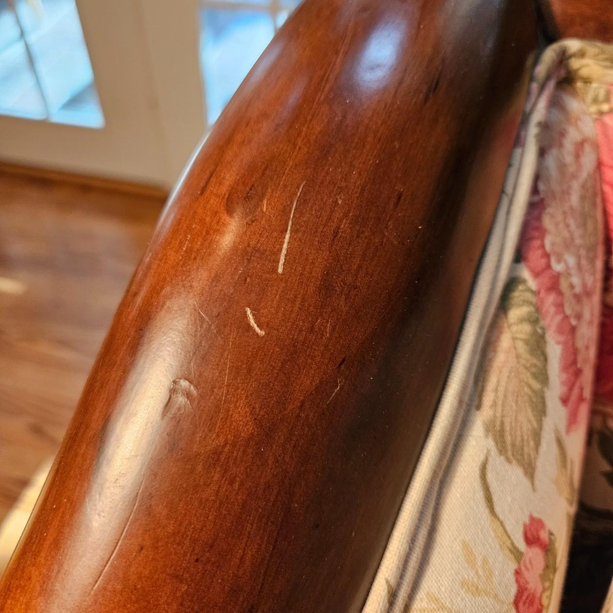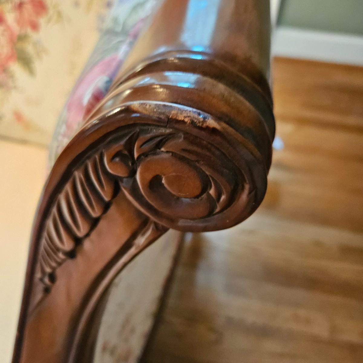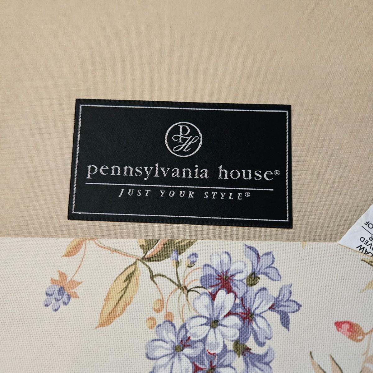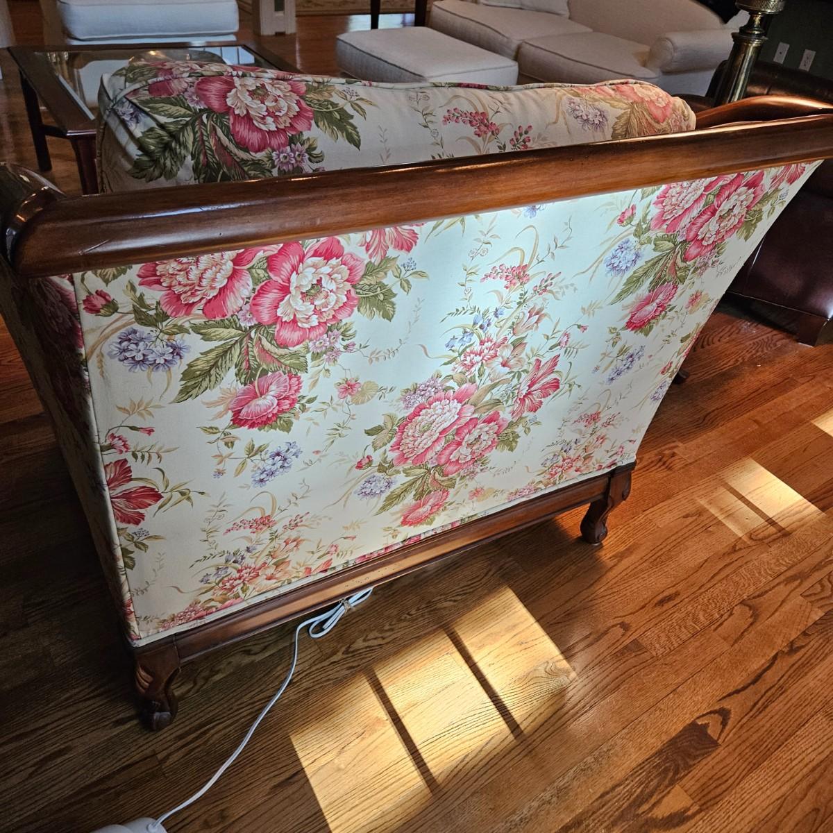 A Pennsylvania House wood framed, upholstered chair that features a floral pattern with a cream background. It measures approximately 48" x 38" x 38" with a seat height of 19 5". There are some very minor blemishes, see attached pictures for more detail. Local pickup only. Winning bidder must bring assistance to help move and load this item due to its weight and/or size.