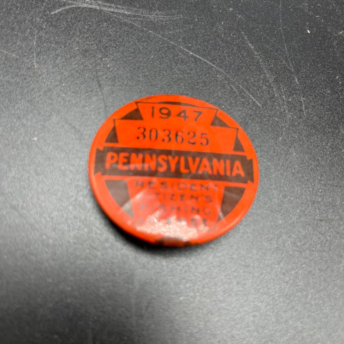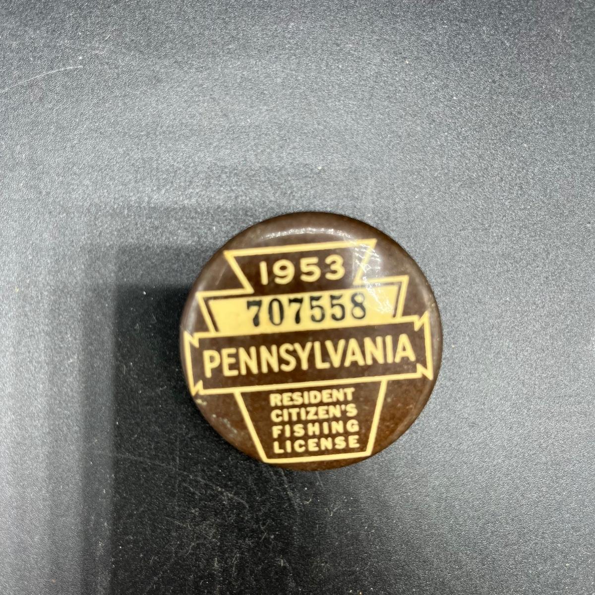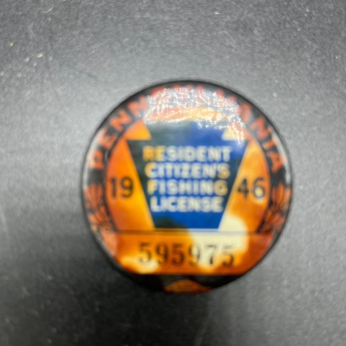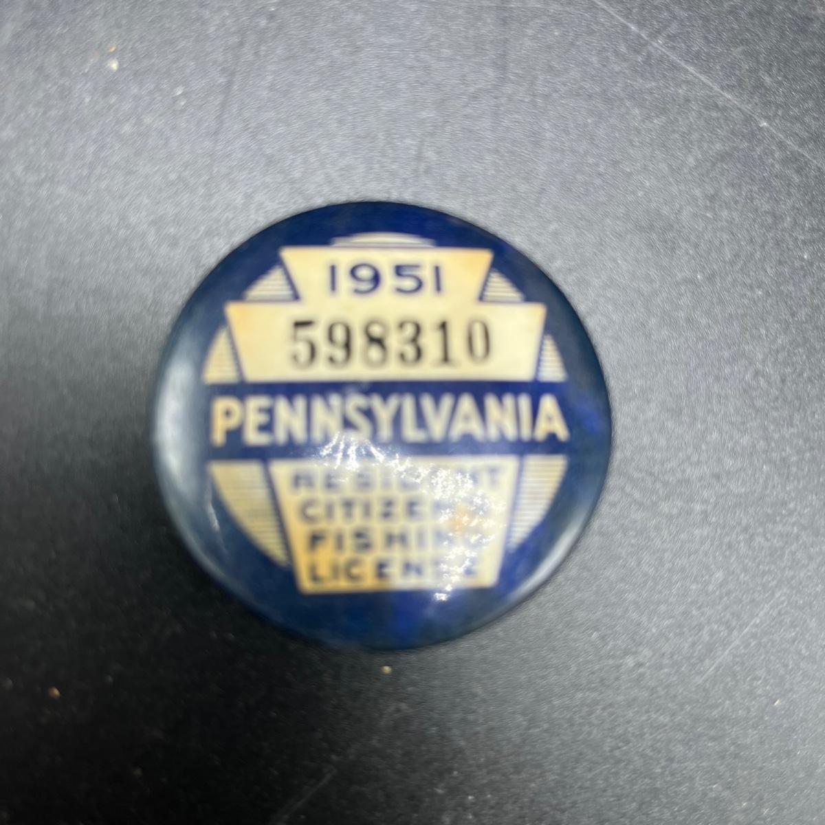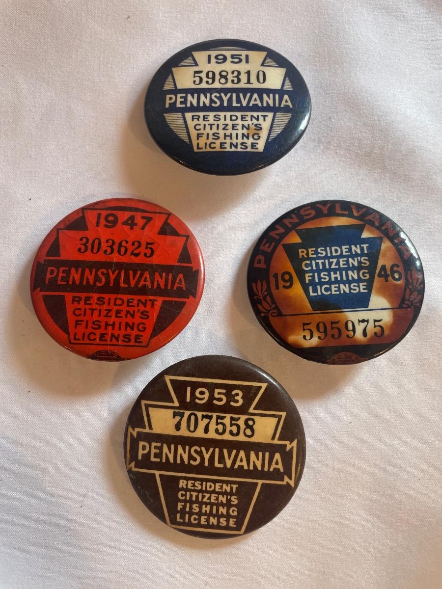 Lot includes four Pennsylvania fishing licenses from 1946, 1947, 1951 and 1953. Largest badges measure 1.5”D.