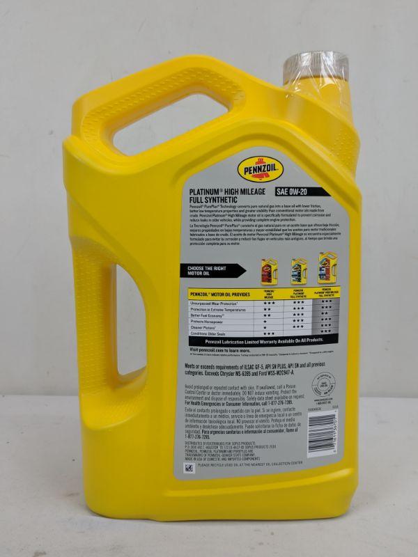 Pennzoil Platinum High Mileage Motor Oil, Full Synthetic SAE 0W-20, 5 Qt - New