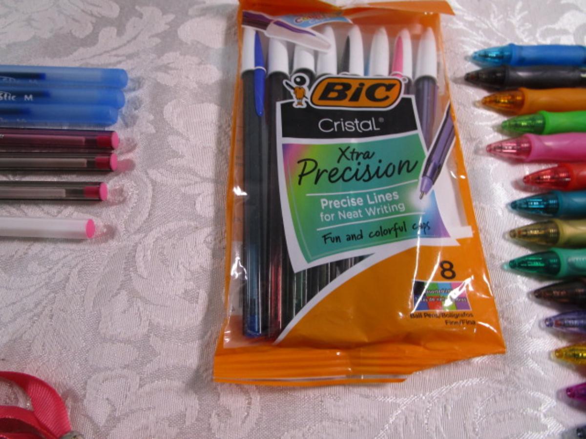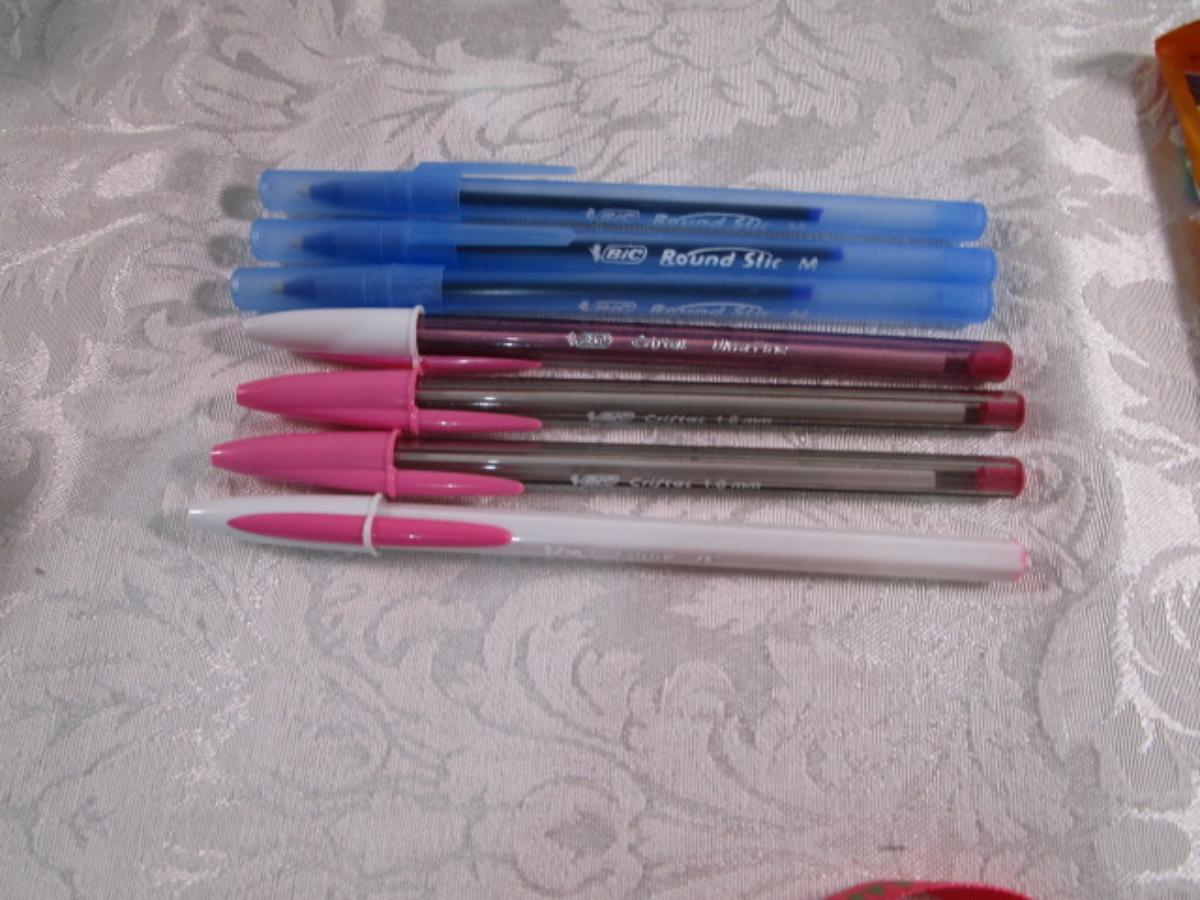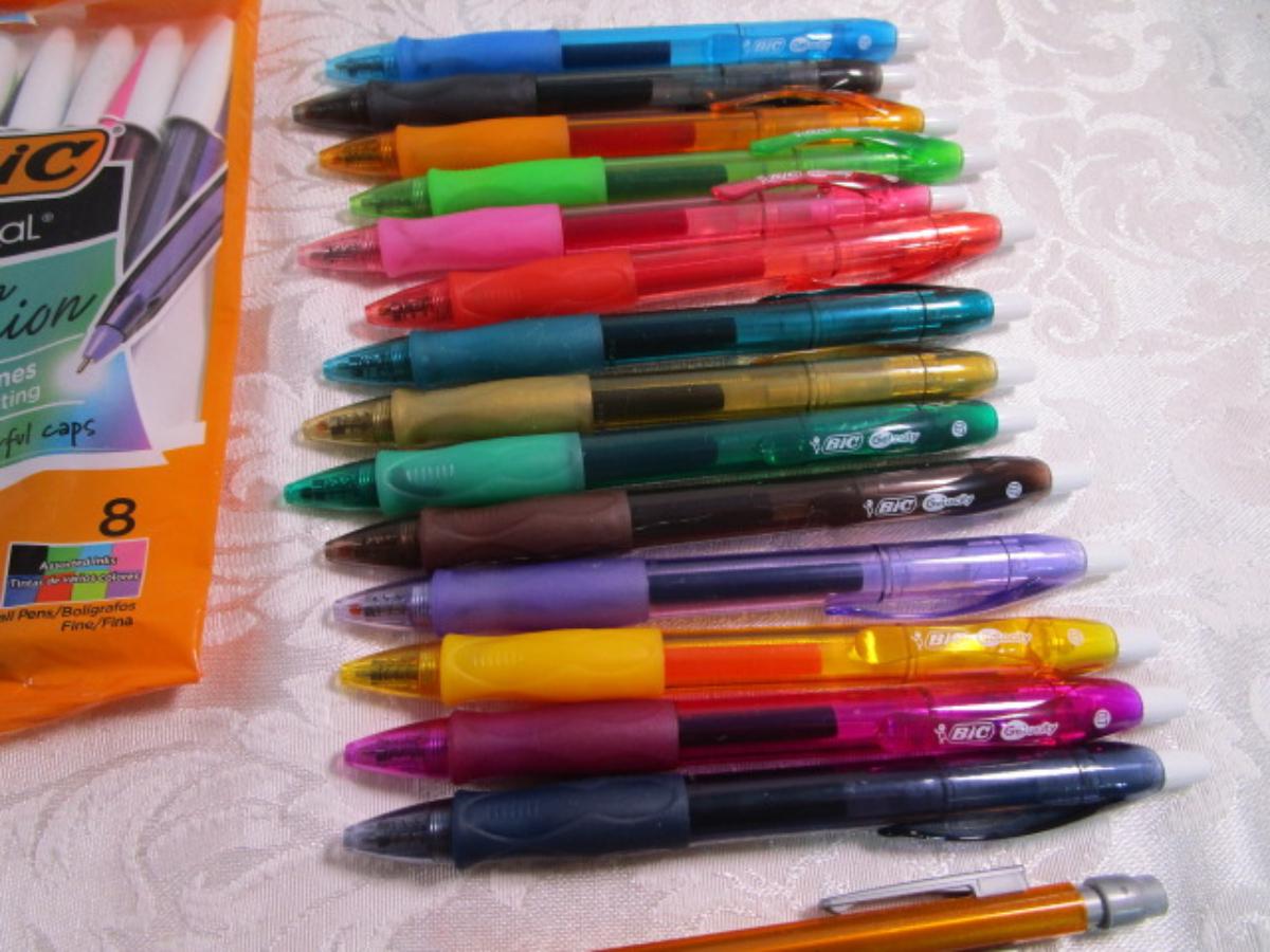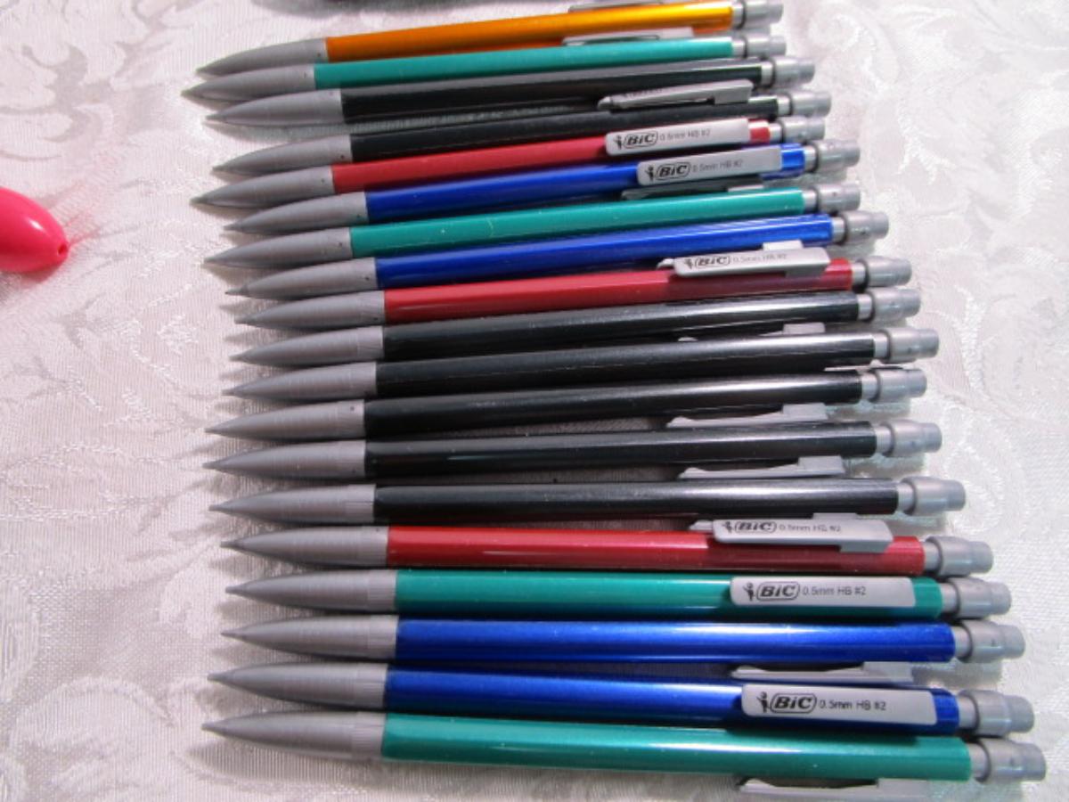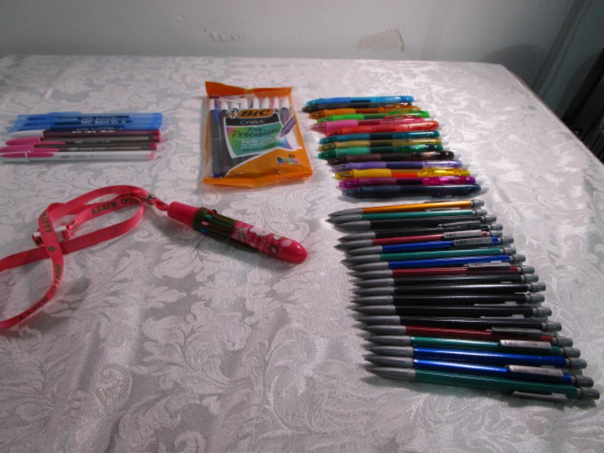 19 new Bic pencils .5 mm, 14 new Bic gelocity .7 mm pens, 15 Bic pens, 1 Hello Kitty pen with lanyard
