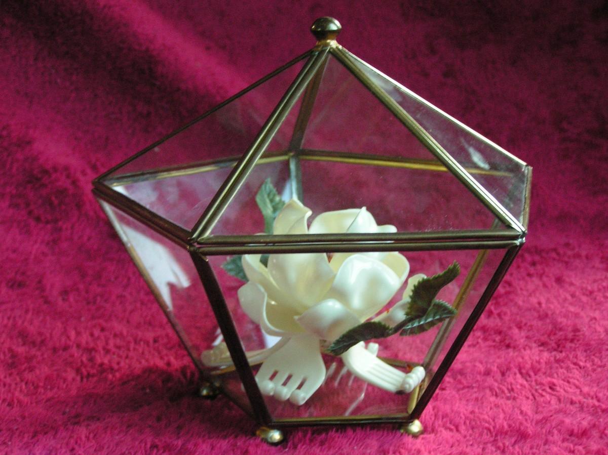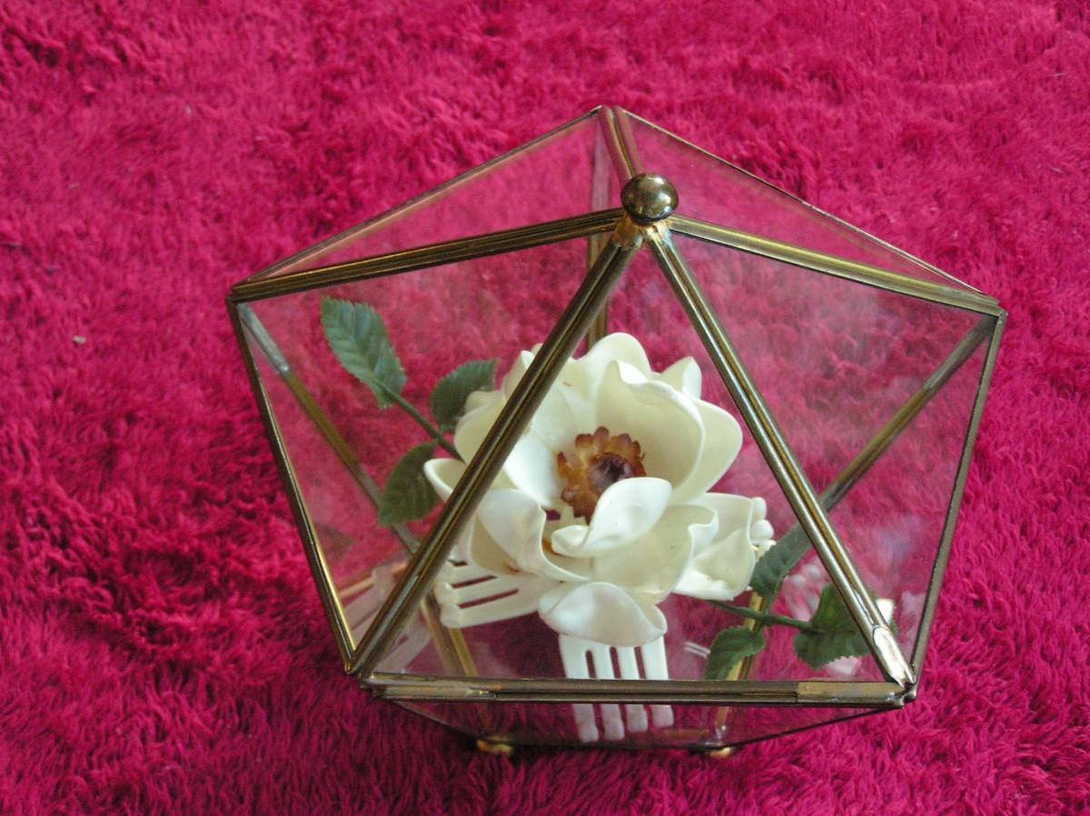 Pentagonal glass in metal frame display box with an artificial white rose. About 7" tall.