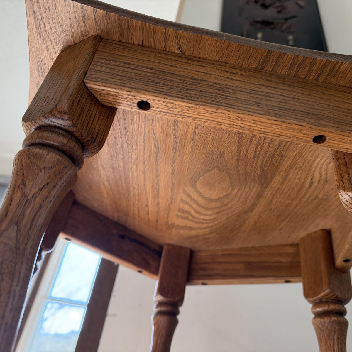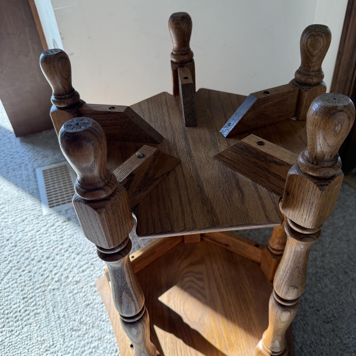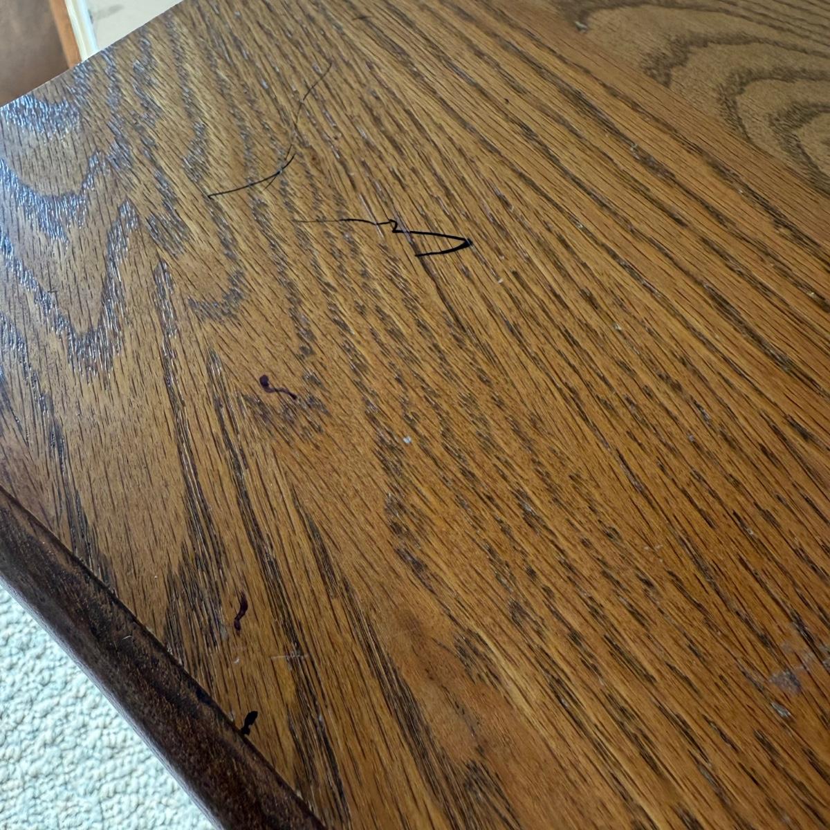 Pentagon shaped wooden side table appears to be made of solid wood. Measures approximately 19” x 19” x 23”H. It has some marks on the top surface.