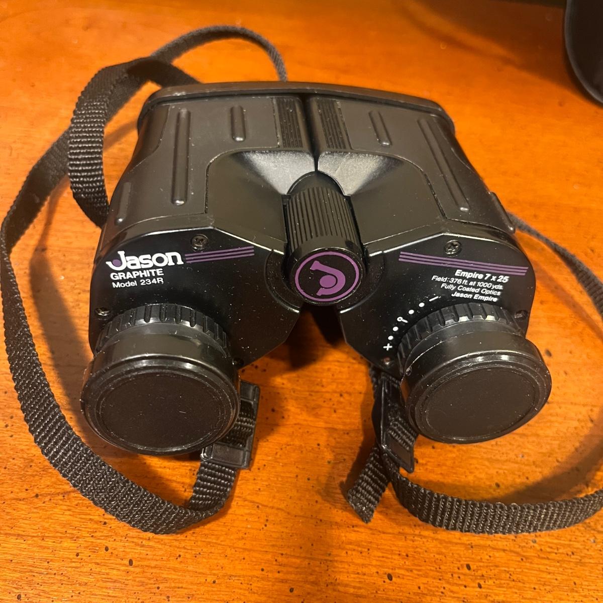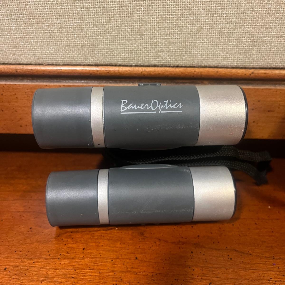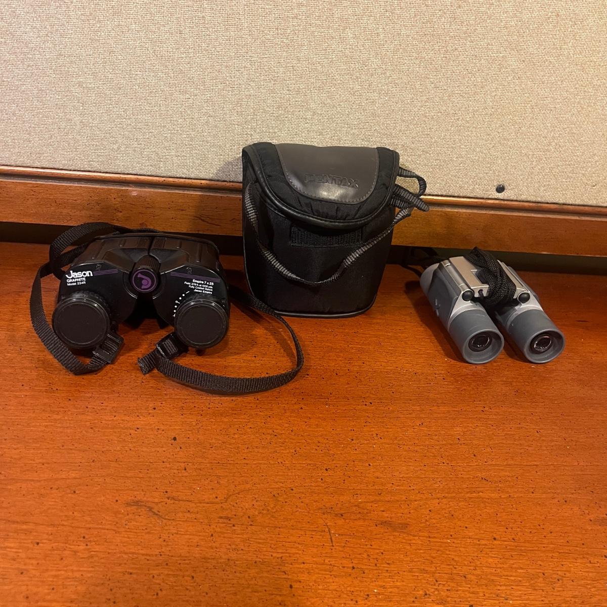 Lot includes Pentax 16 x 24 binoculars with case, Bauer Optics 8 x 22 binoculars and Jason Graphite 7 x 25 binoculars.