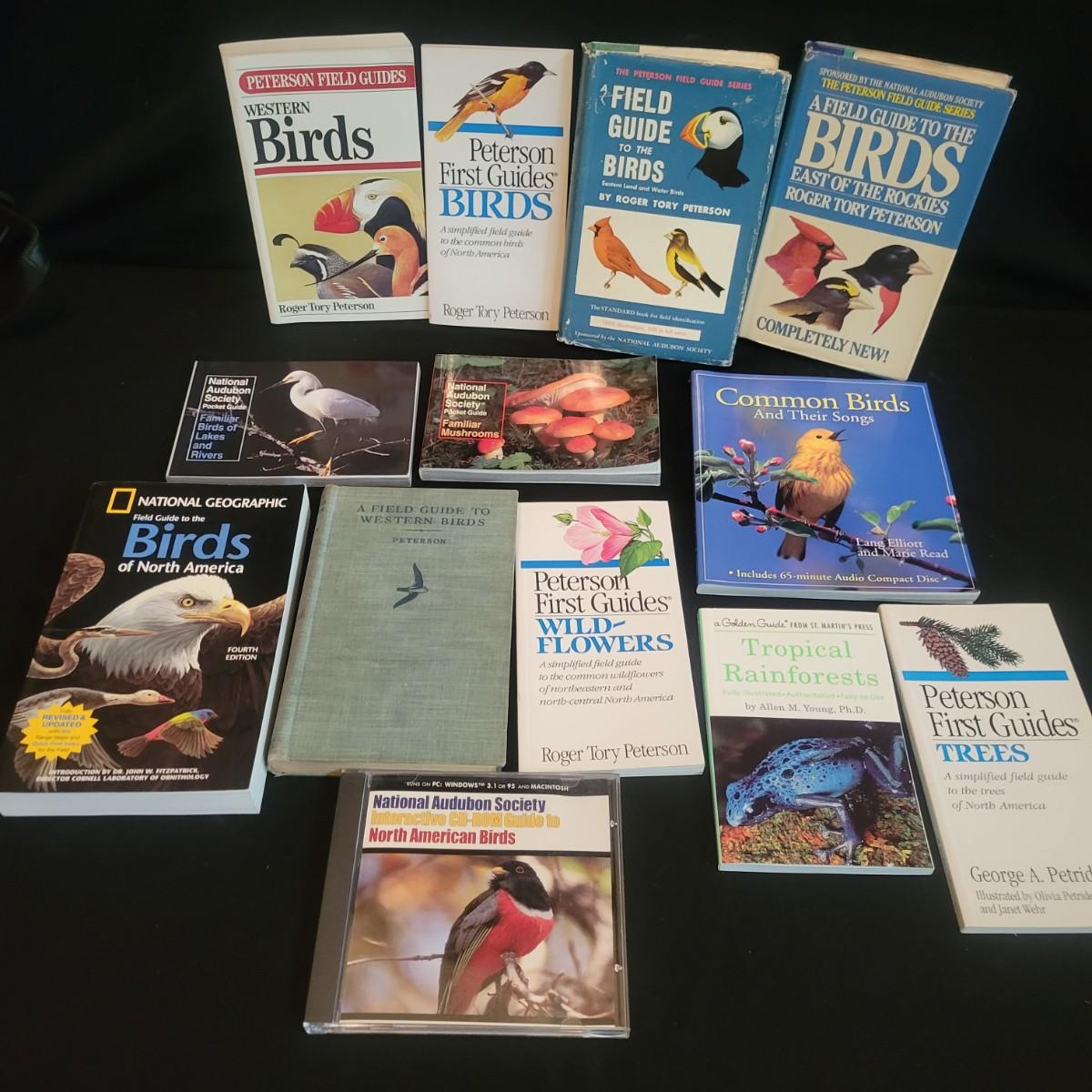 Assorted field guides and a pair of Pentax binoculars. The binoculars are Pentax Papiluo 8.5 x 21 binoculars that include a convenient carrying case. This lot also includes an assortment of field guides and an interactive CD on Northern birds. Approximately 11 books total. Shipping available.