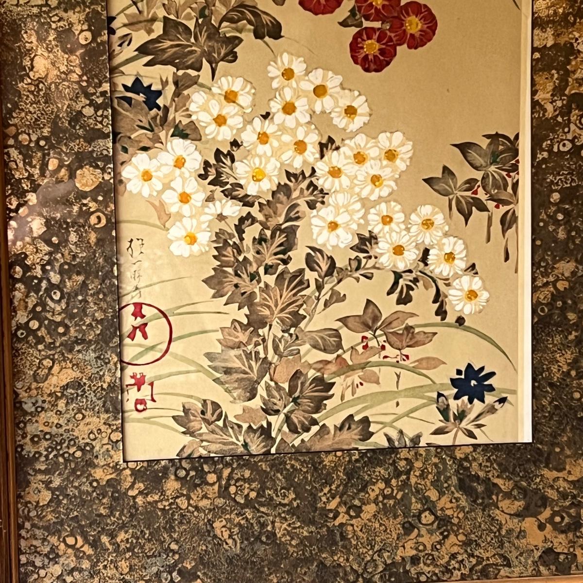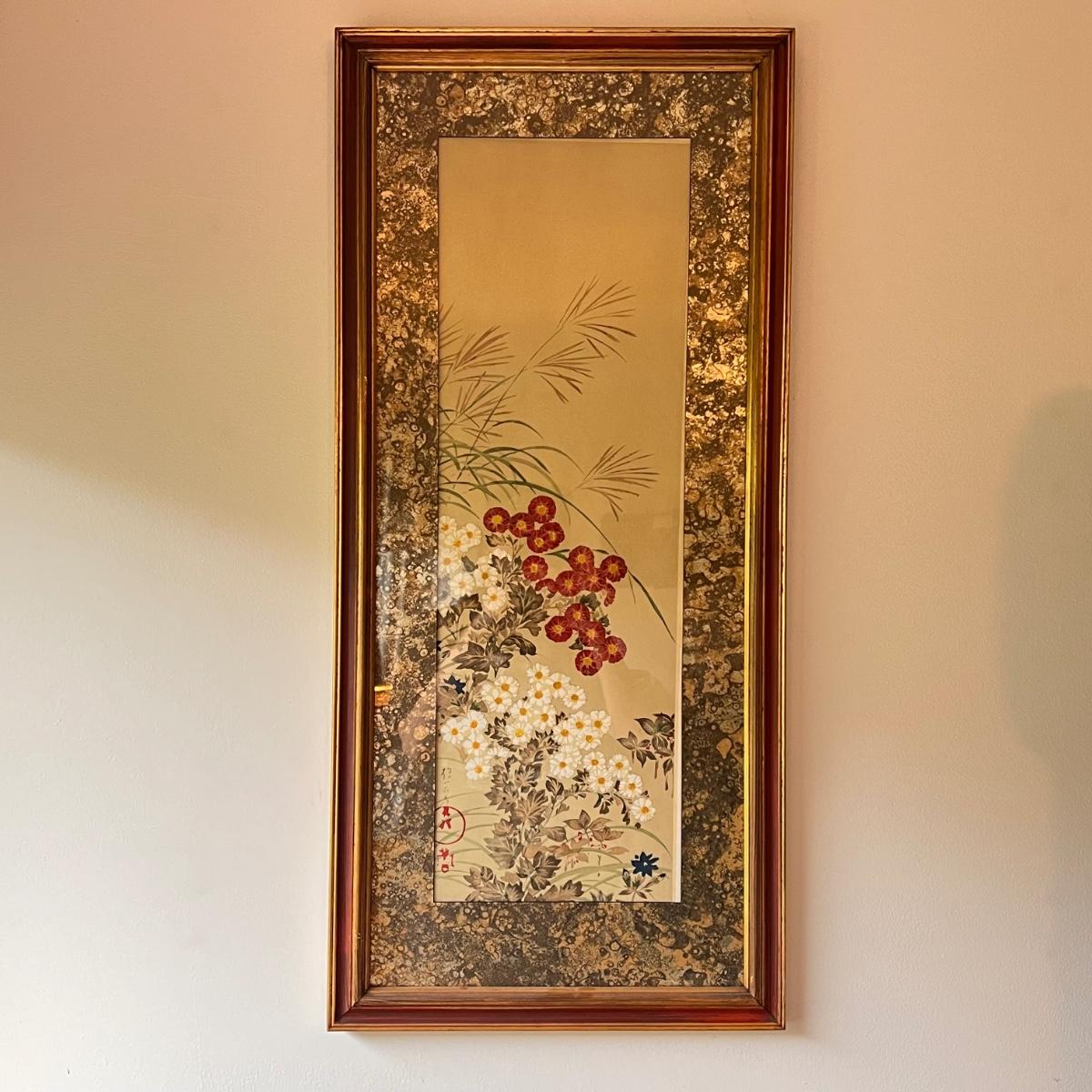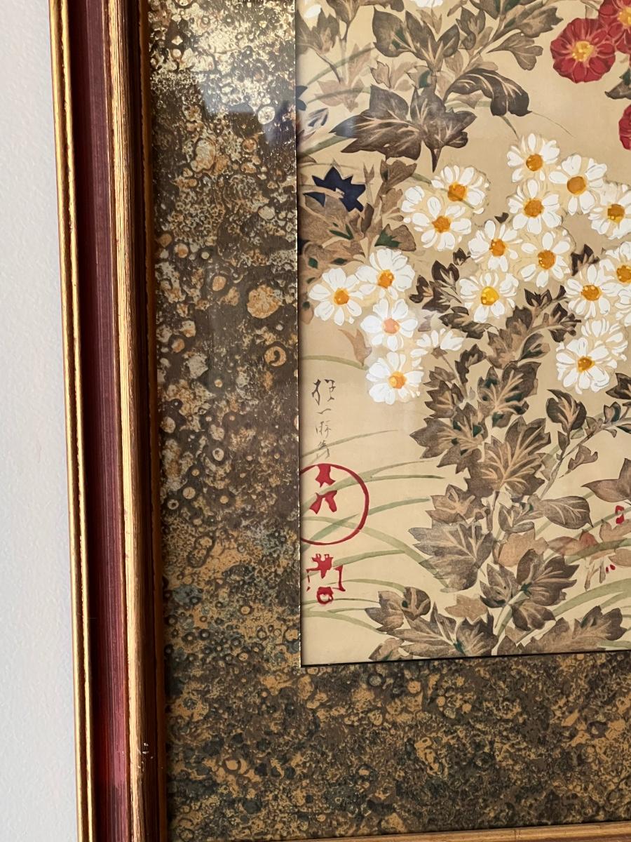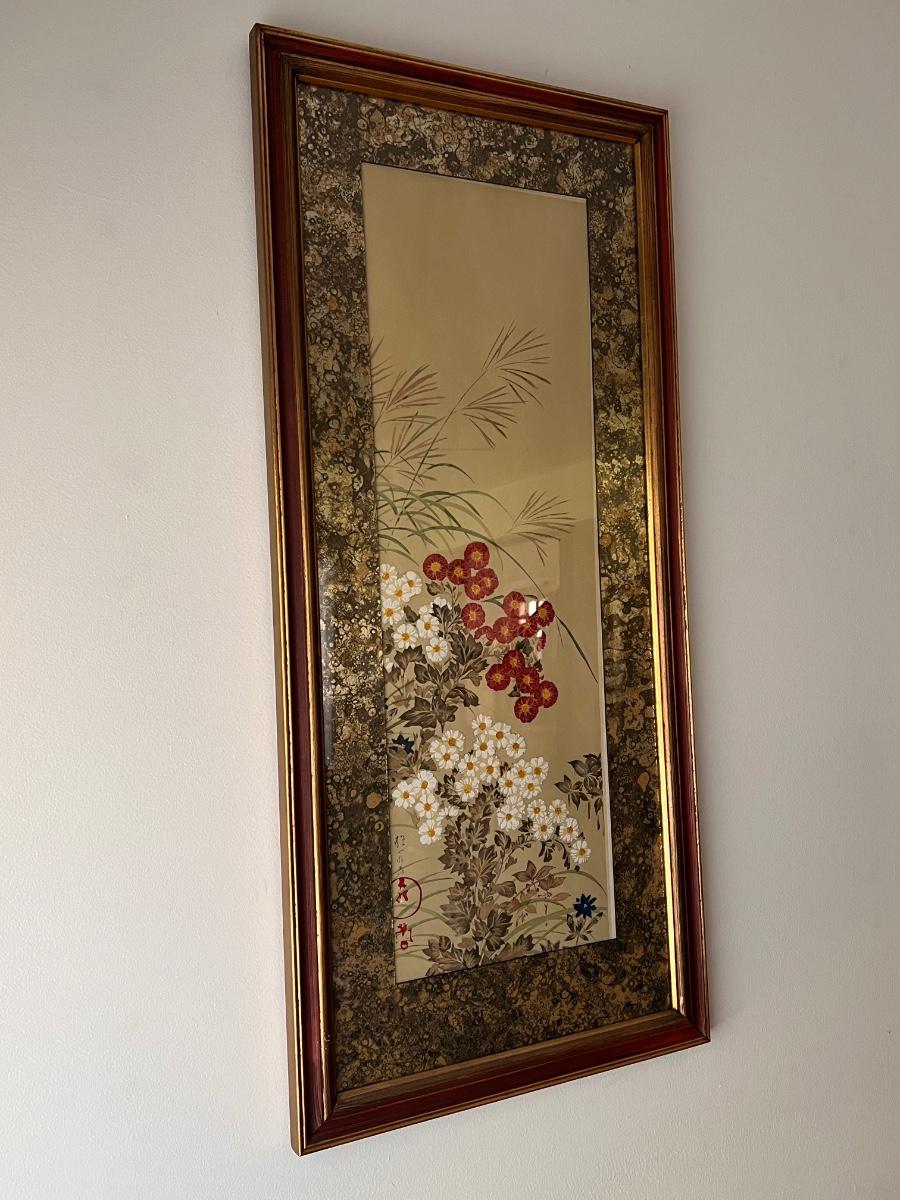 This print is originally by Sakai Ho Itsu’s, but we cannot confirm if it is a replica. It displays peonies and chrysanthemums. It is framed in a wooden, painted frame that measures 17” x 37”H. Shipping available. Shipping can be costly. We suggest contacting our preferred local shipping provider, Postage Express, with dimensions and getting an estimate before bidding: (828) 670-5501 or shipping@postageexpressnc.com.