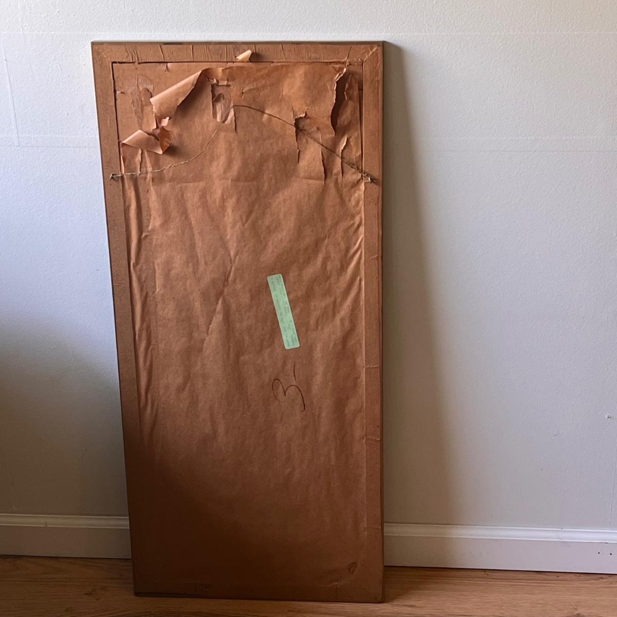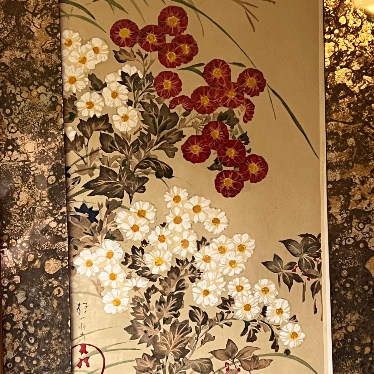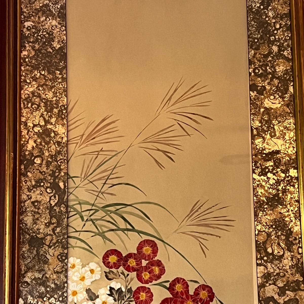 This print is originally by Sakai Ho Itsu’s, but we cannot confirm if it is a replica. It displays peonies and chrysanthemums. It is framed in a wooden, painted frame that measures 17” x 37”H. Shipping available. Shipping can be costly. We suggest contacting our preferred local shipping provider, Postage Express, with dimensions and getting an estimate before bidding: (828) 670-5501 or shipping@postageexpressnc.com.